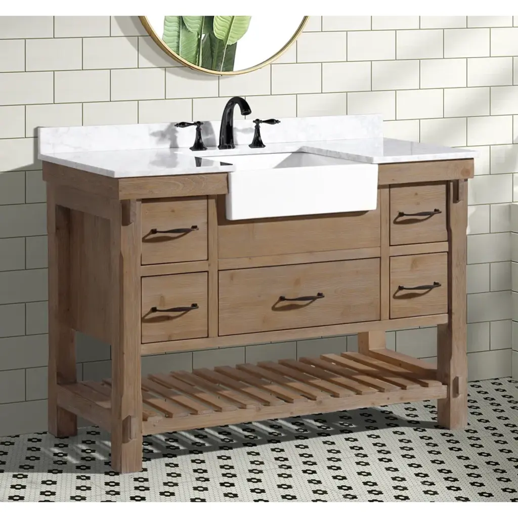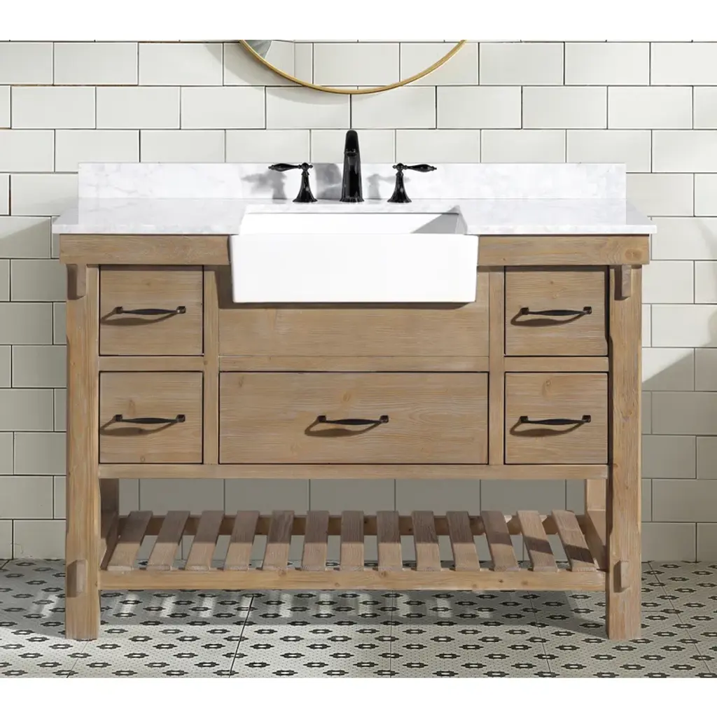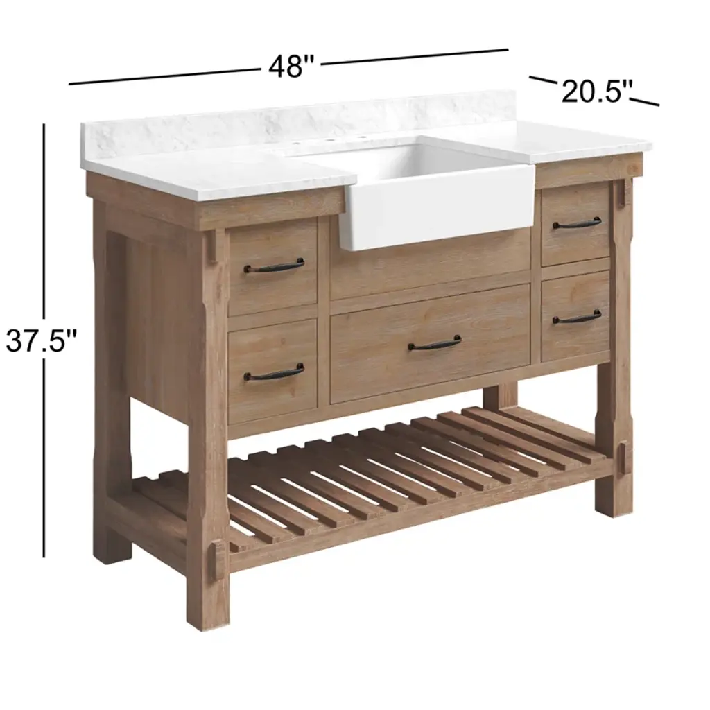 The distressed finish on this sleek 48" single bathroom vanity set brings tons of coastal charm to your space. Its freestanding frame is made from solid wood with an ash brown finish and wood scoring throughout for a rustic look. The white polished Carrara marble surface accommodates a farmhouse-style sink (faucet sold separately), and it has a backsplash that protects your walls from splashes. Five functional drawers give you a spot for toiletries and various bathroom essentials, while an open-slatted shelf is an ideal place to store freshly laundered towels. Plus, this vanity set arrives fully assembled.