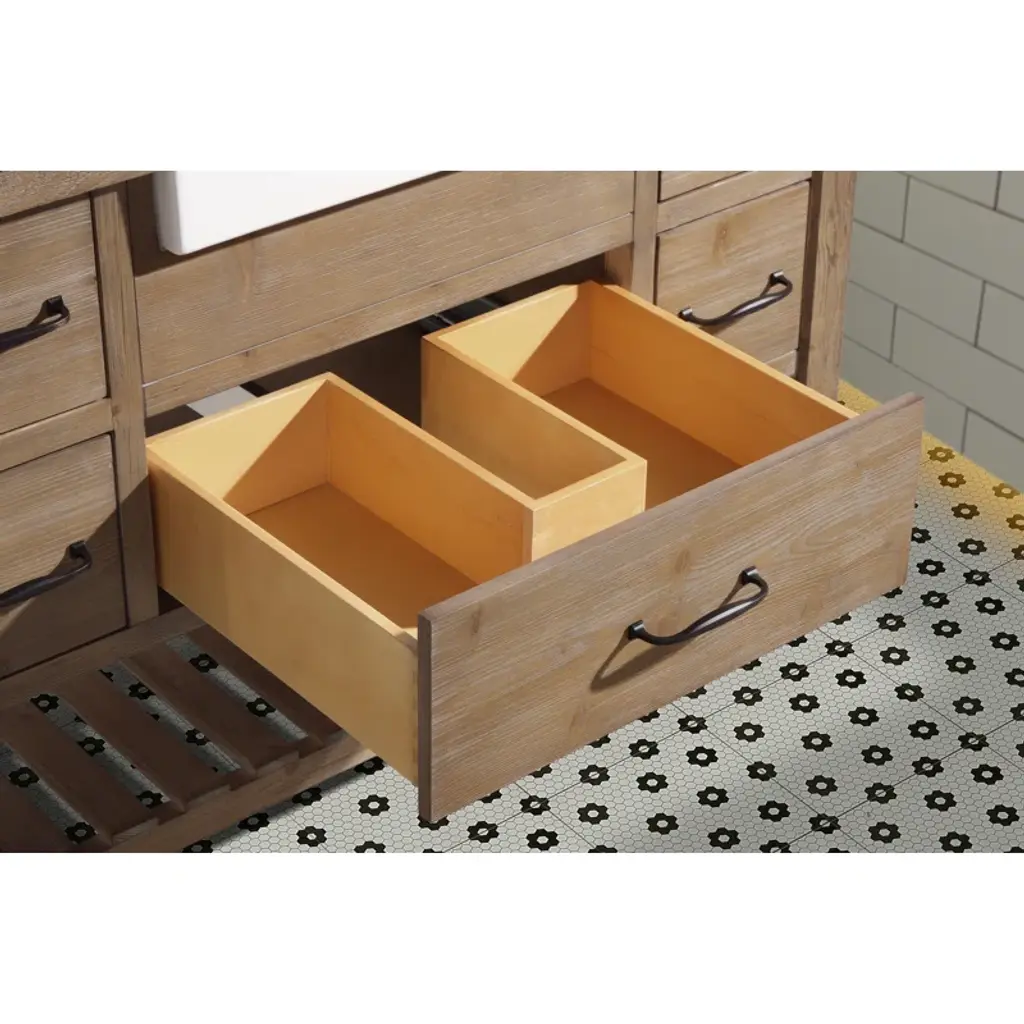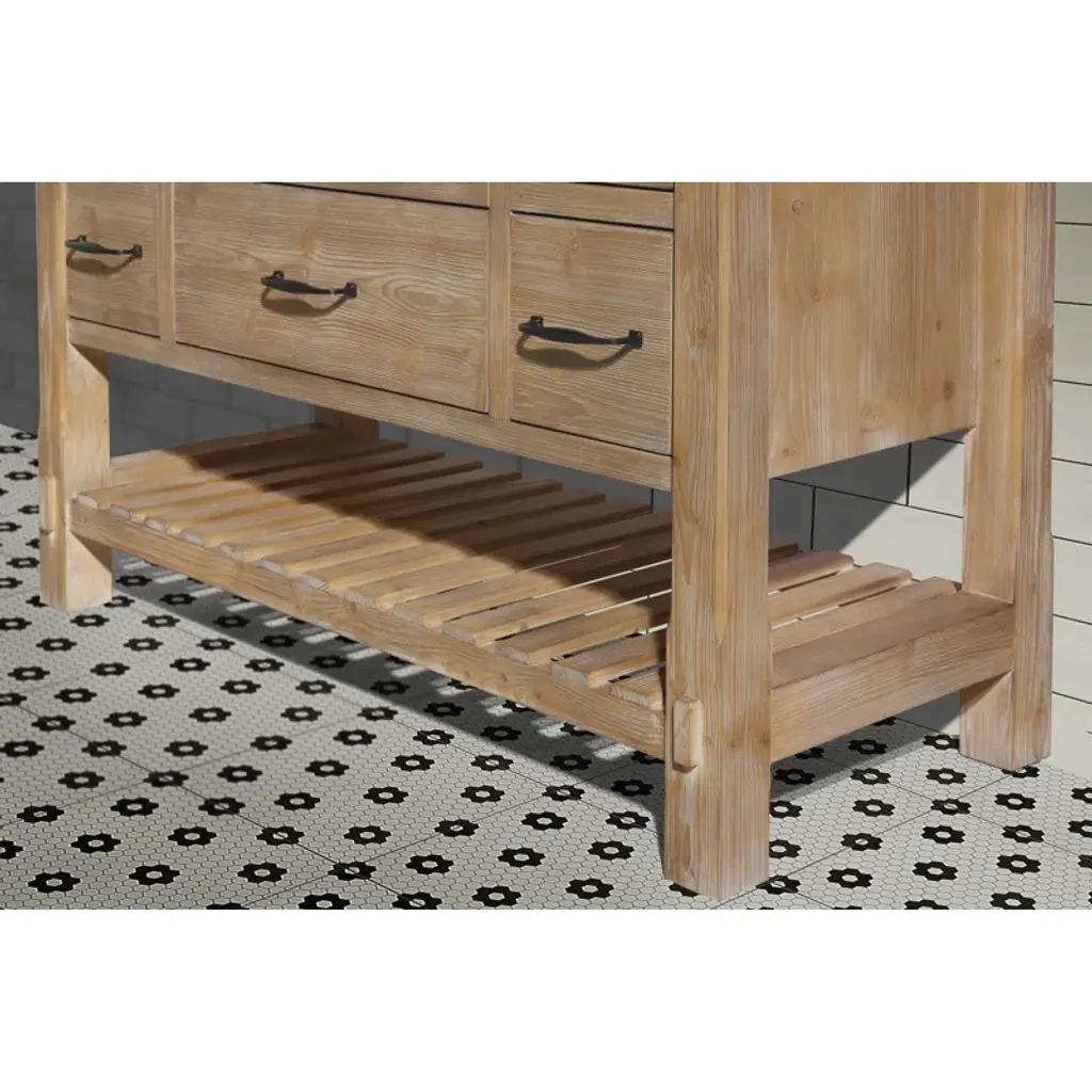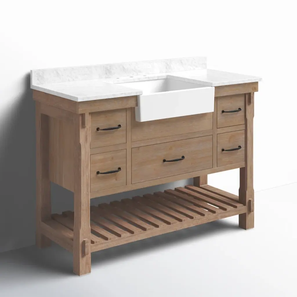 The distressed finish on this sleek 48" single bathroom vanity set brings tons of coastal charm to your space. Its freestanding frame is made from solid wood with an ash brown finish and wood scoring throughout for a rustic look. The white polished Carrara marble surface accommodates a farmhouse-style sink (faucet sold separately), and it has a backsplash that protects your walls from splashes. Five functional drawers give you a spot for toiletries and various bathroom essentials, while an open-slatted shelf is an ideal place to store freshly laundered towels. Plus, this vanity set arrives fully assembled.