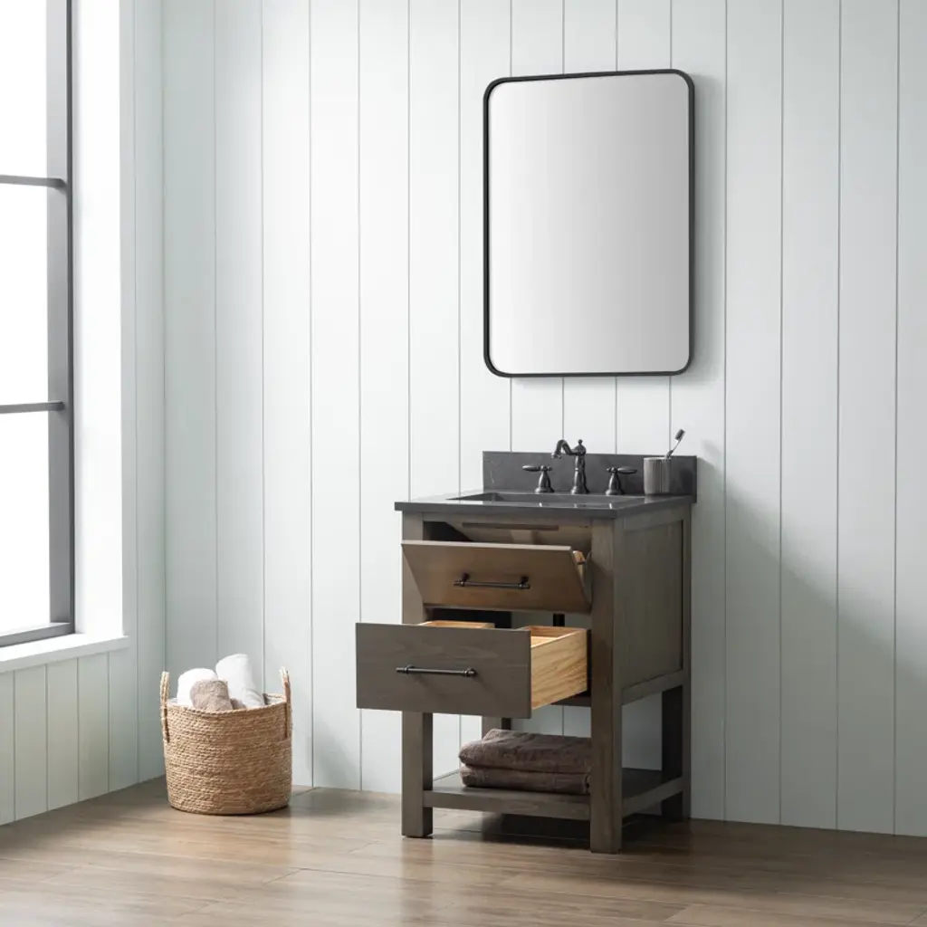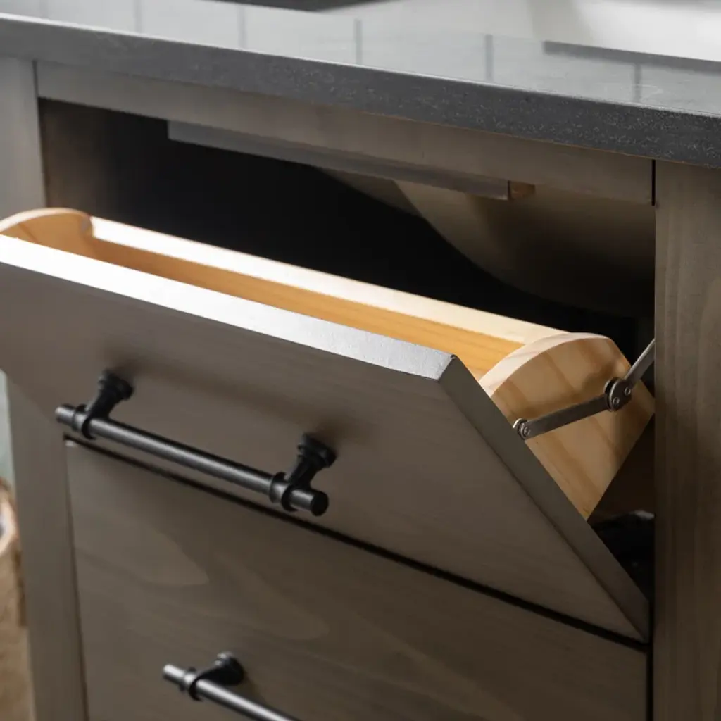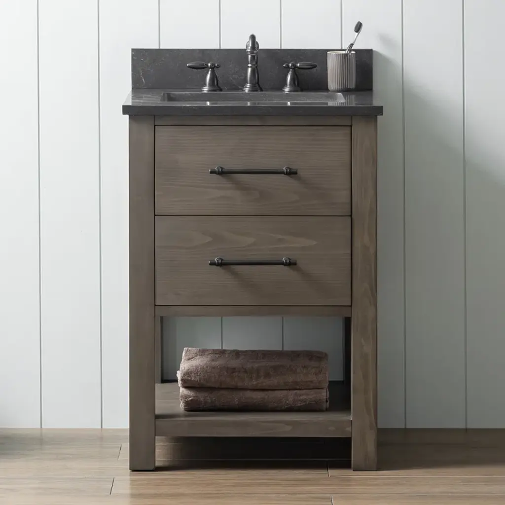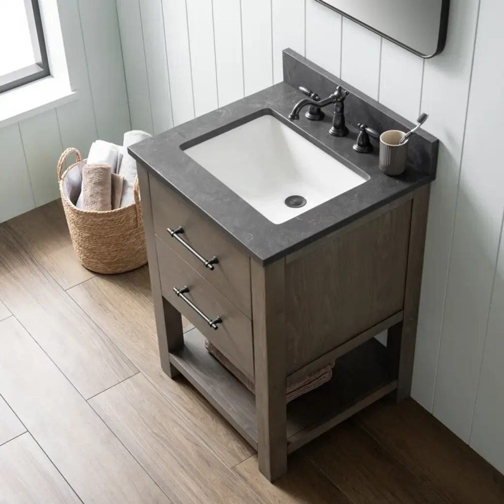 With its natural tones + vintage-inspired hardware, this single vanity brings a grounded, rustic feel to your bathroom. The base features a tilt-out tray, soft-close drawer, and open shelf to hold essentials; it’s a countertop with a ceramic undermount sink. Faucet sold separately.