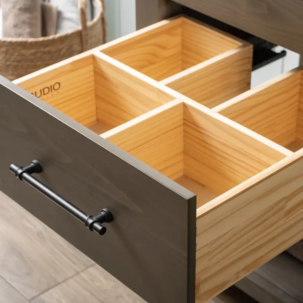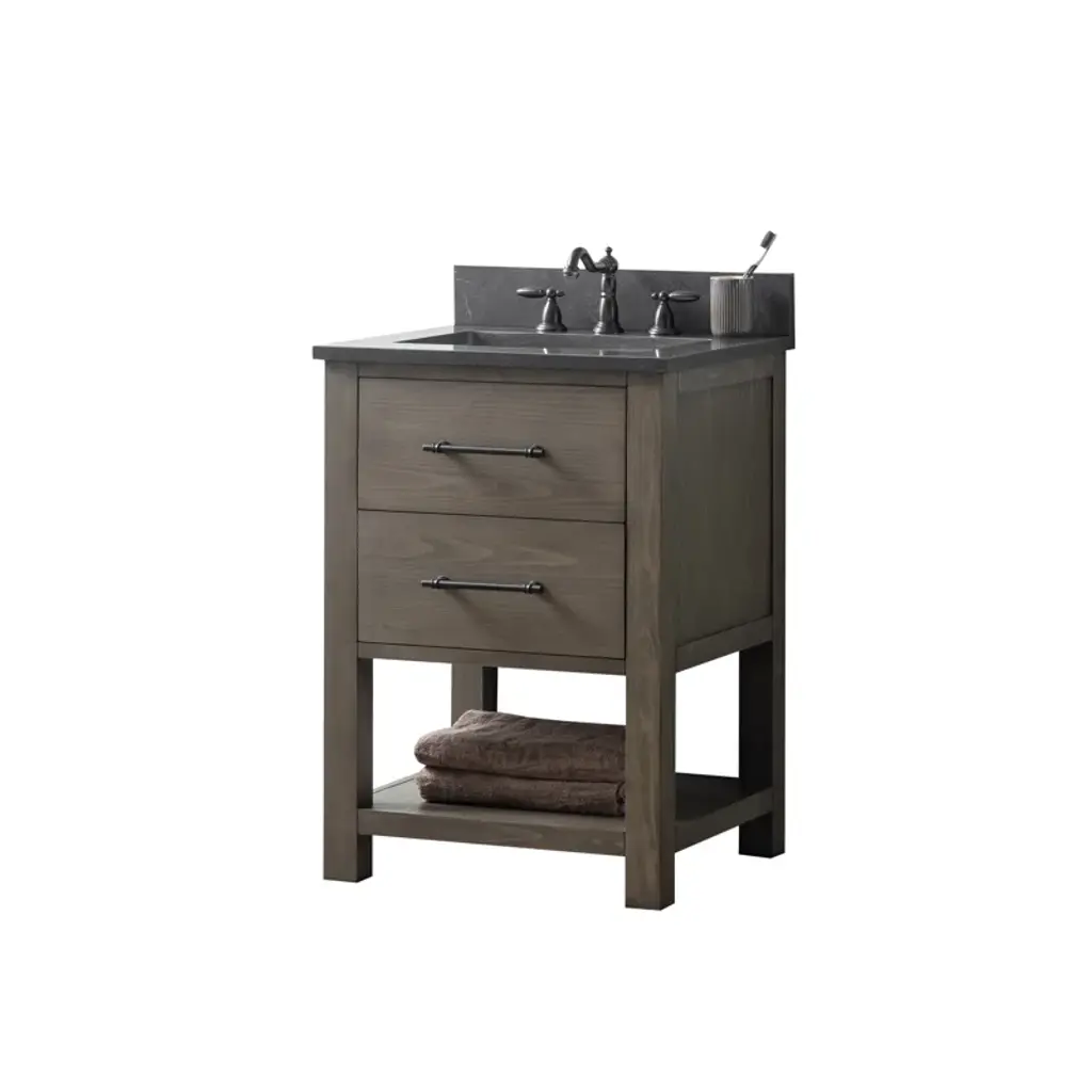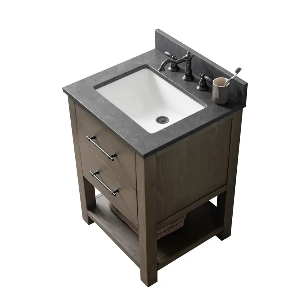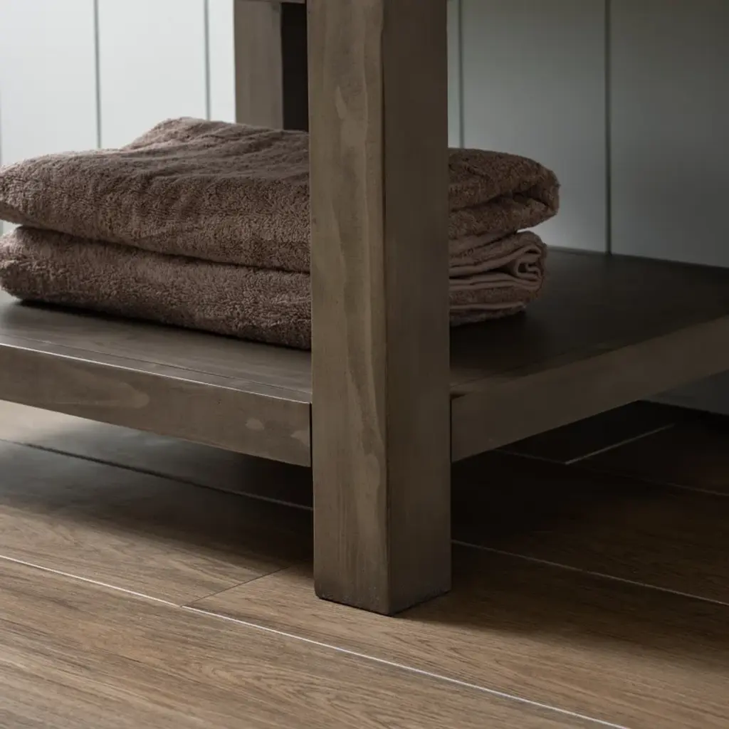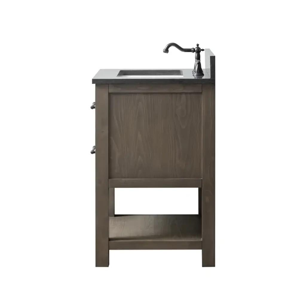 With its natural tones + vintage-inspired hardware, this single vanity brings a grounded, rustic feel to your bathroom. The base features a tilt-out tray, soft-close drawer, and open shelf to hold essentials; it’s a countertop with a ceramic undermount sink. Faucet sold separately.