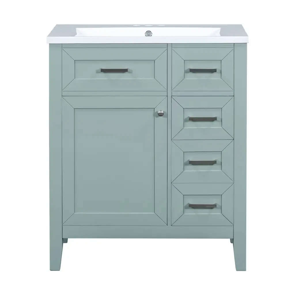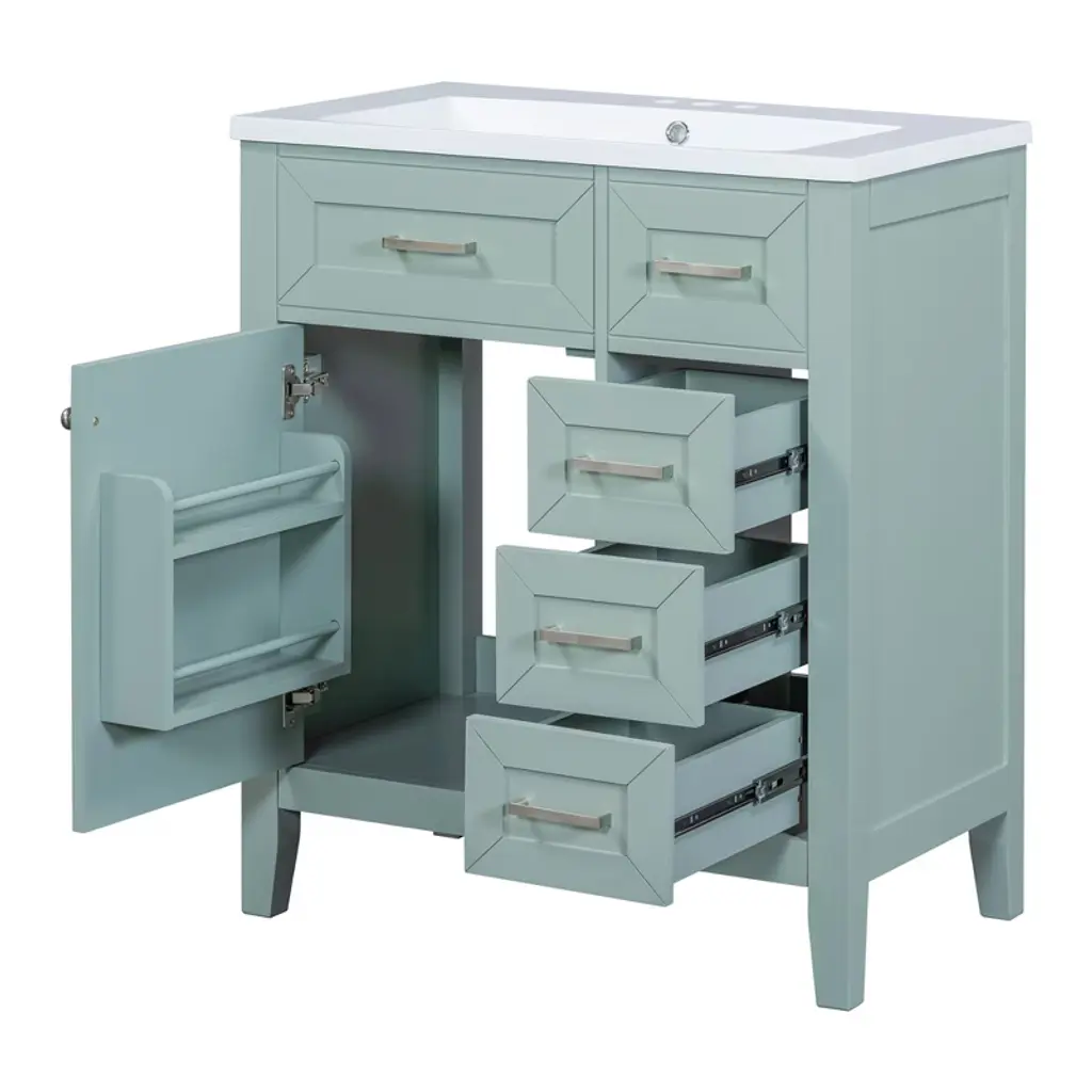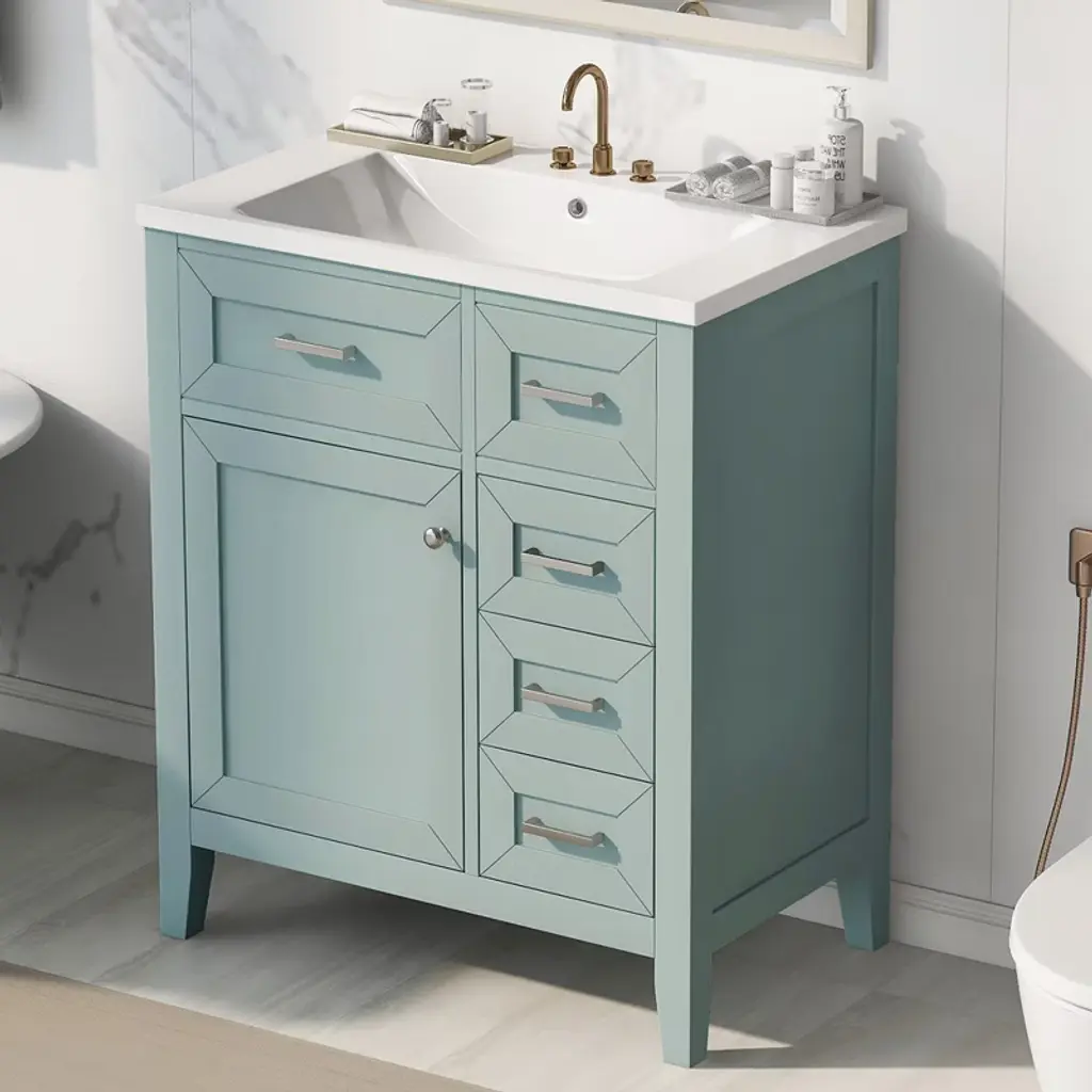 This 30" bathroom vanity is suitable for bathroom in any decoration style. Freestanding green vanity cabinet with silver handles complies with your bathroom facilities. The groove design on the door and drawer increases the artistry and aesthetics of the home environment. If you're looking for a simple but stylish bathroom sink vanity, our product will be a great choice to upgrade your bathroom.