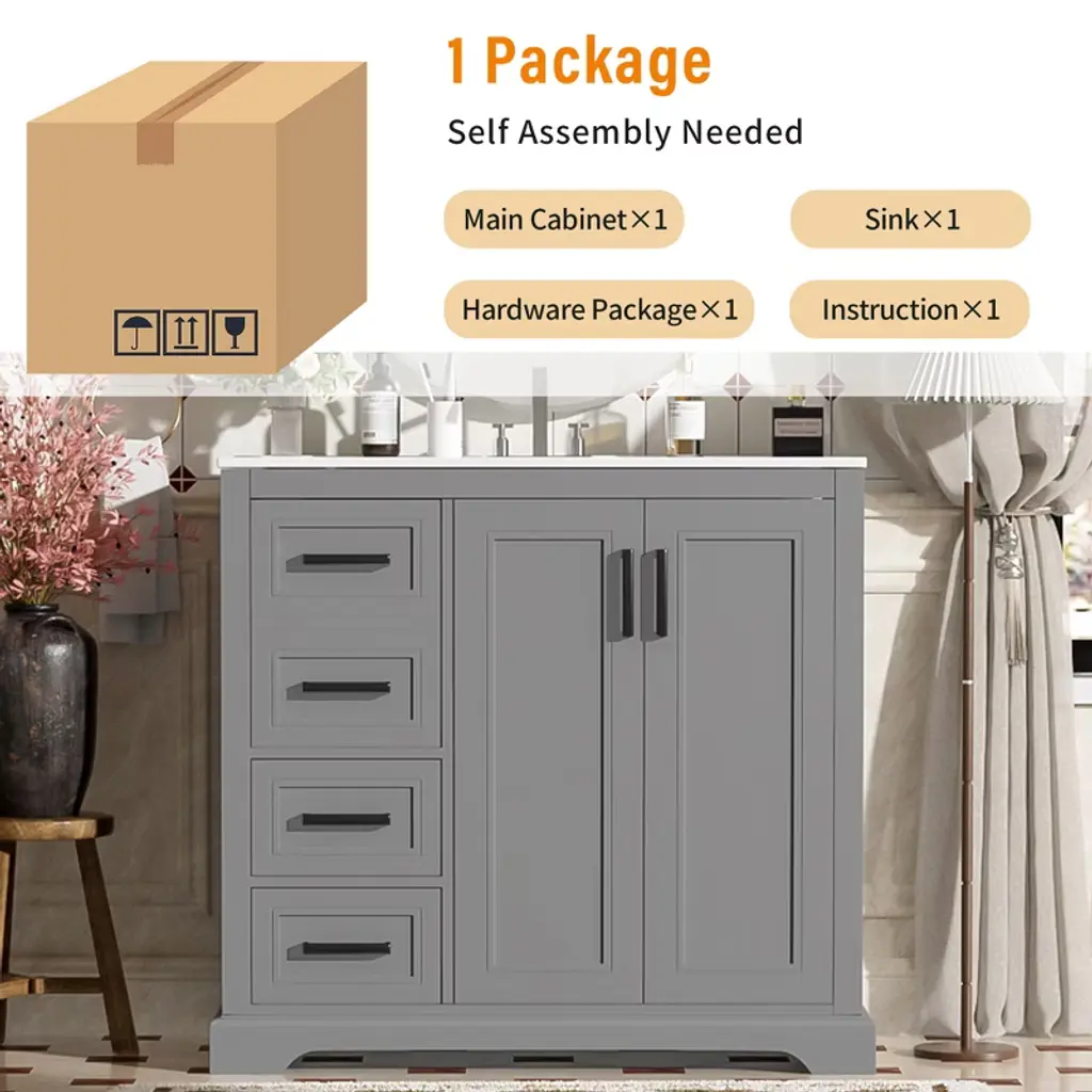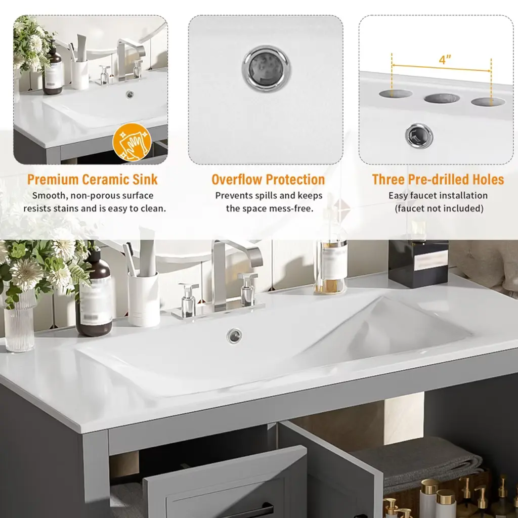 Ktmbdw 36" Bathroom Vanity With Single Sink Combo, 3 Drawers And Cabinet, Freestanding Bathroom Vanities, Soft Closing, Solid Wood Frame, Gray