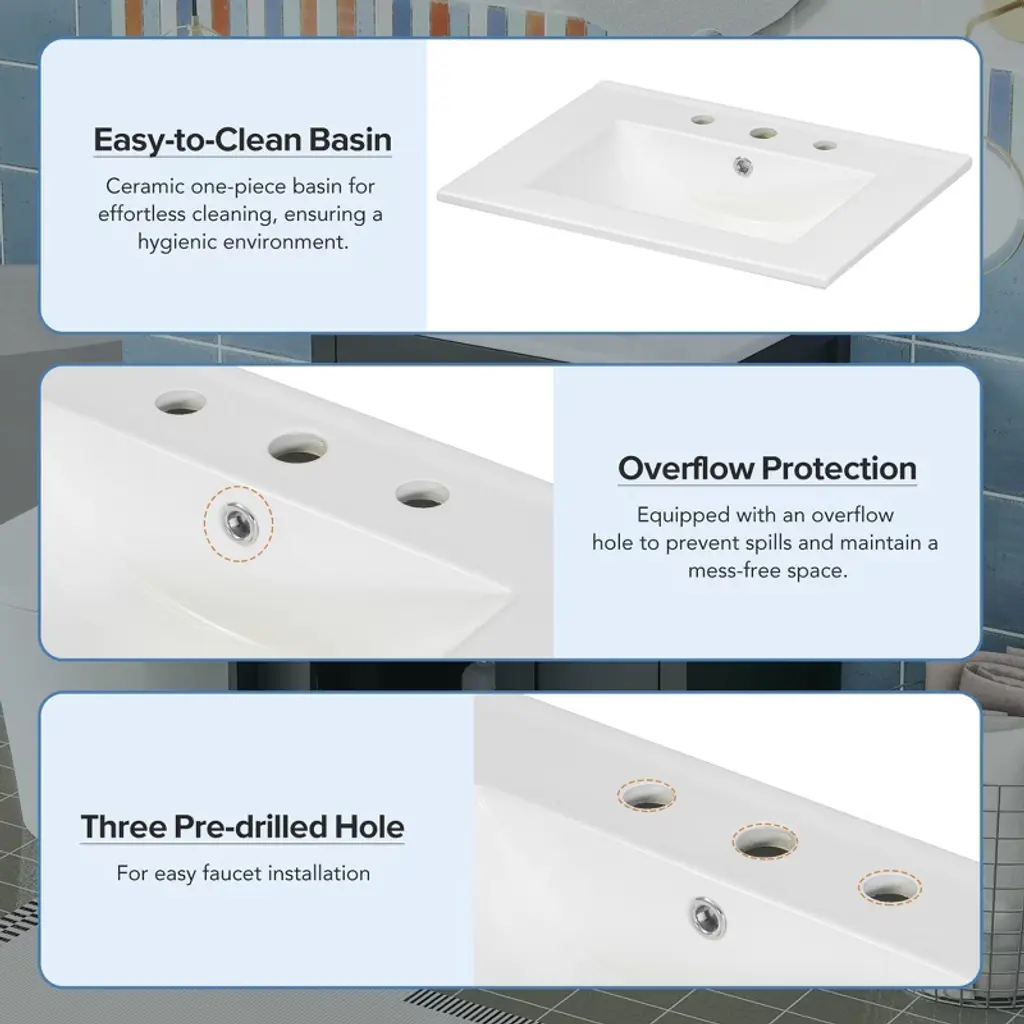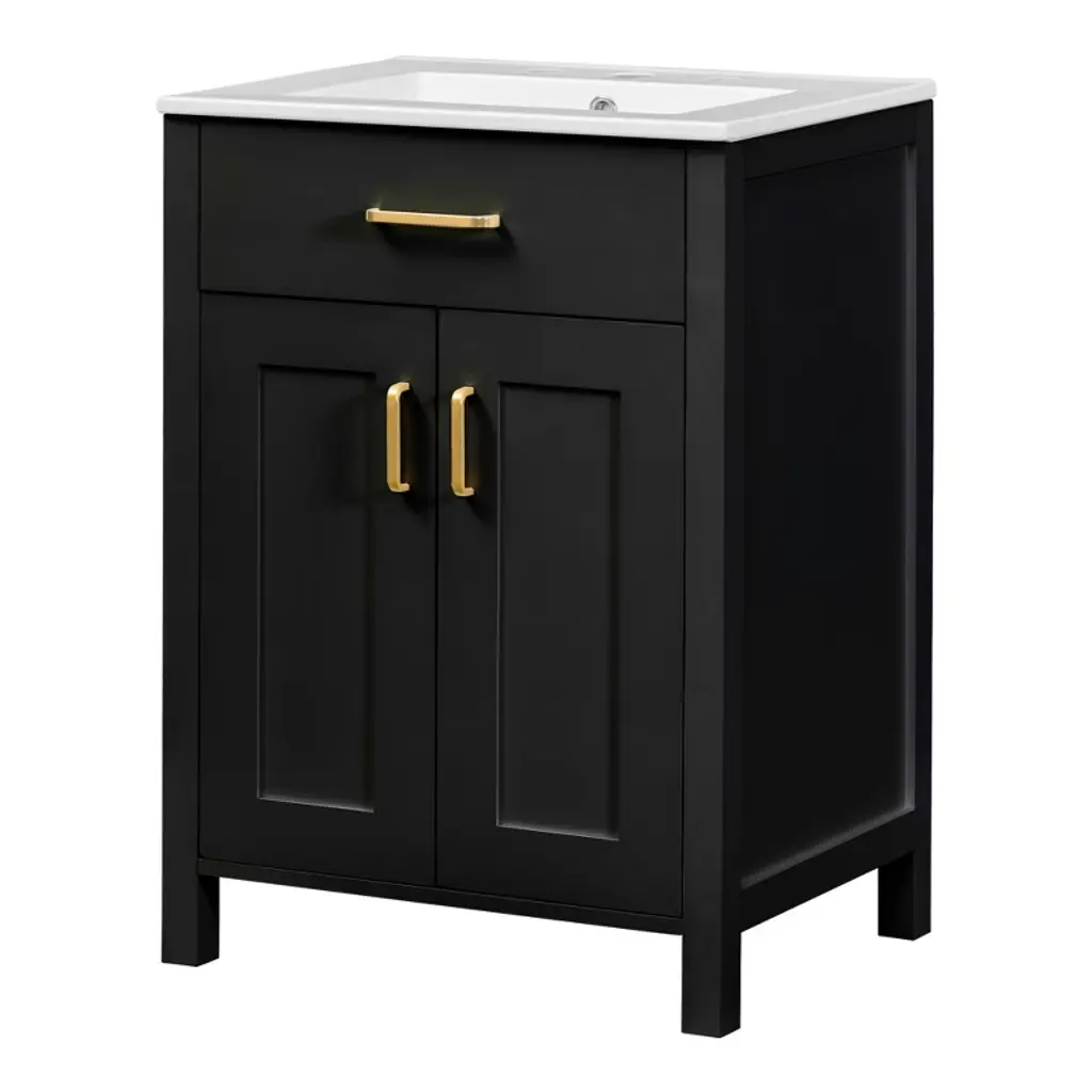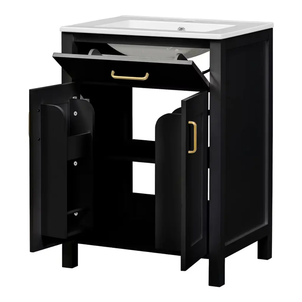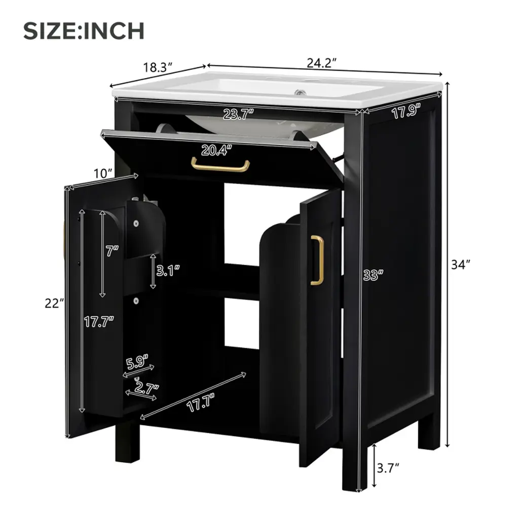 Kwpzqeb 24" Bathroom Vanity Combo With Ceramic Sink, Modern Vanity With Dual-tier Shelving & Flip Drawer, Freestanding Bathroom Cabinet, Black