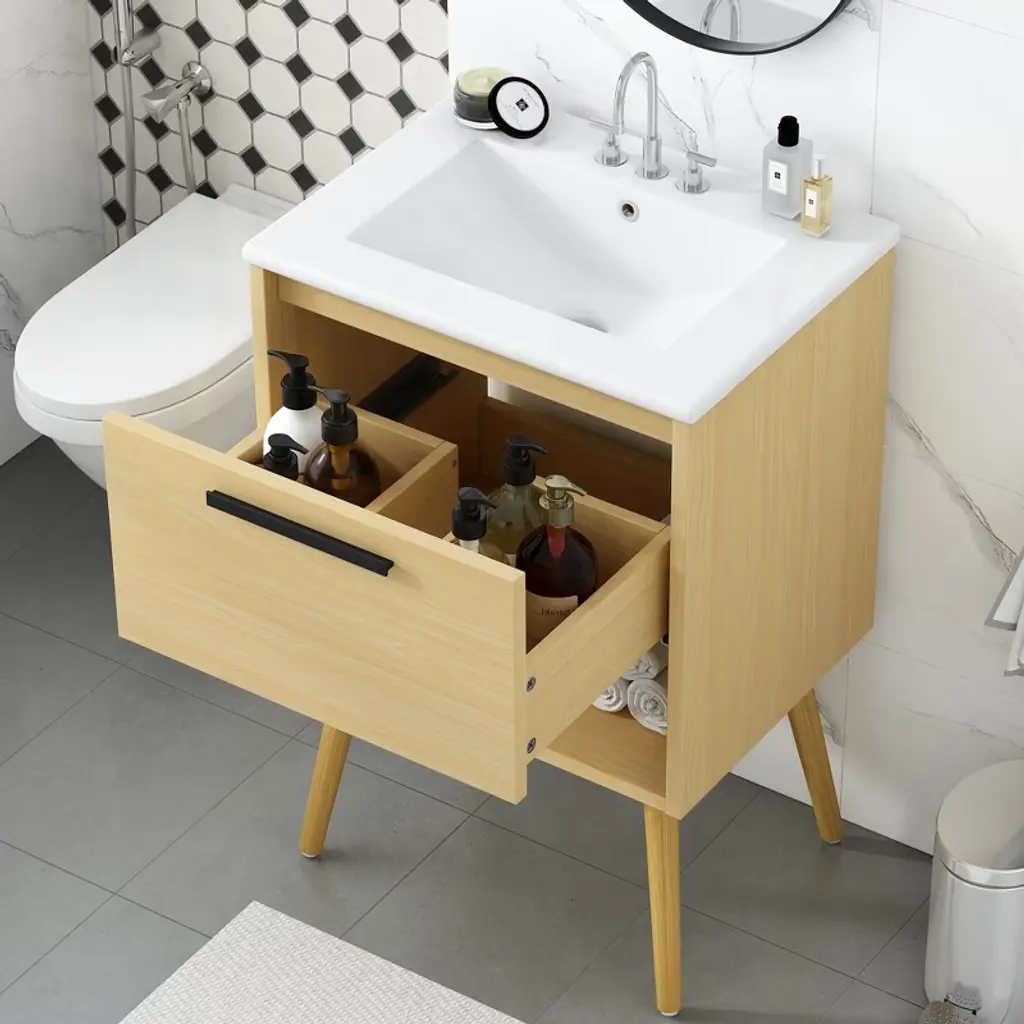 This bathroom sink is made of durable ceramic with a smooth, waterproof surface that virtually avoids water stains. Three holes are pre-drilled in the top to accommodate a 4-inch center-mounted faucet (not included). A metal ring prevents spills if you forget to turn off the faucet. The drawer's irregular interior design creates compartments of varying sizes, perfect for storing cosmetics and other essentials. Additionally, open storage beneath the drawer allows for easy placement of unused items.