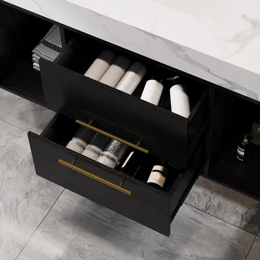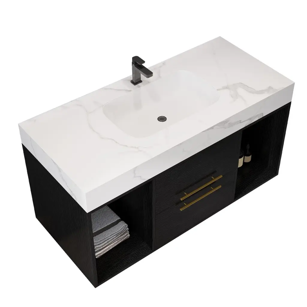 This bathroom vanity features a sintered stone countertop and multi-layered solid wood for durability. The modern floating basin design frees up floor space, allowing you to easily clean corners and store cleaning supplies. It also offers two drawers and two open storage spaces, easily solving your storage challenges. The smooth storage path allows you to store or access whatever you need in seconds.