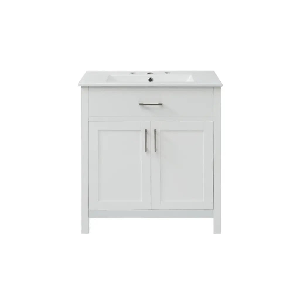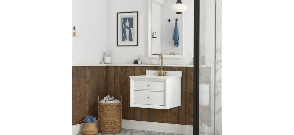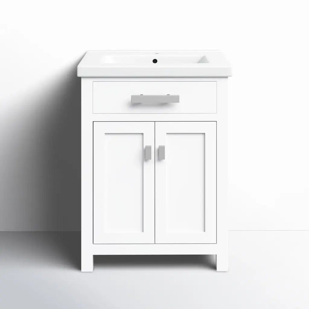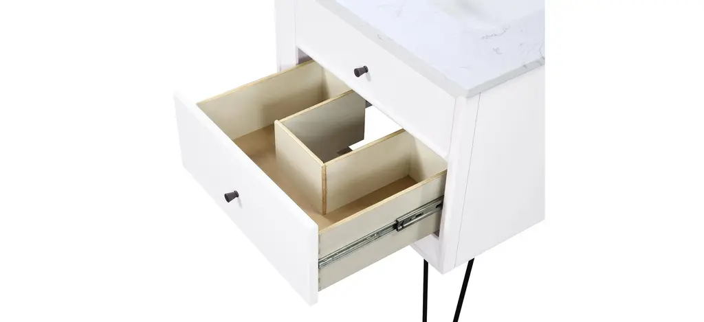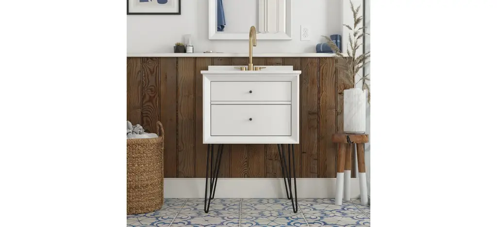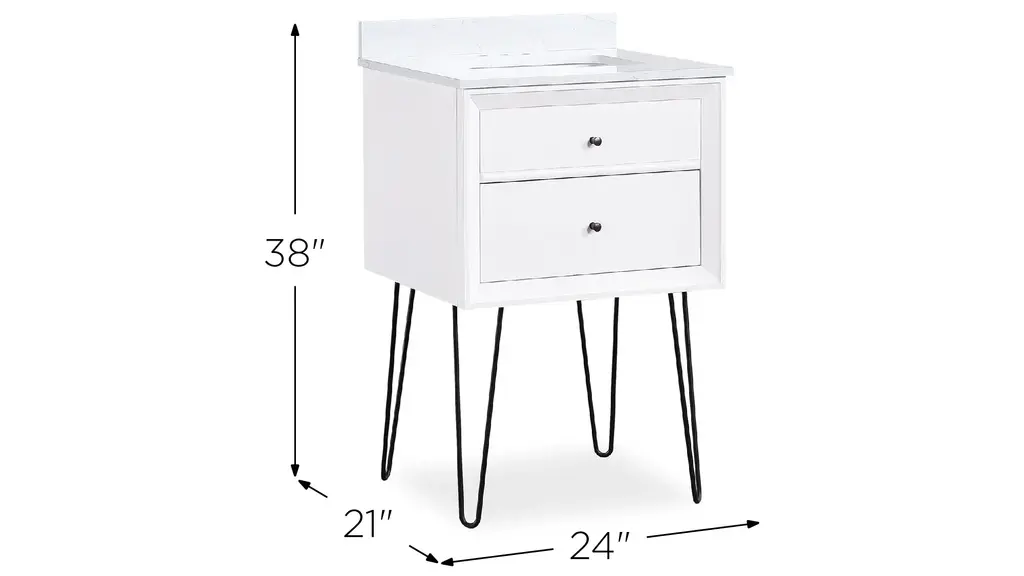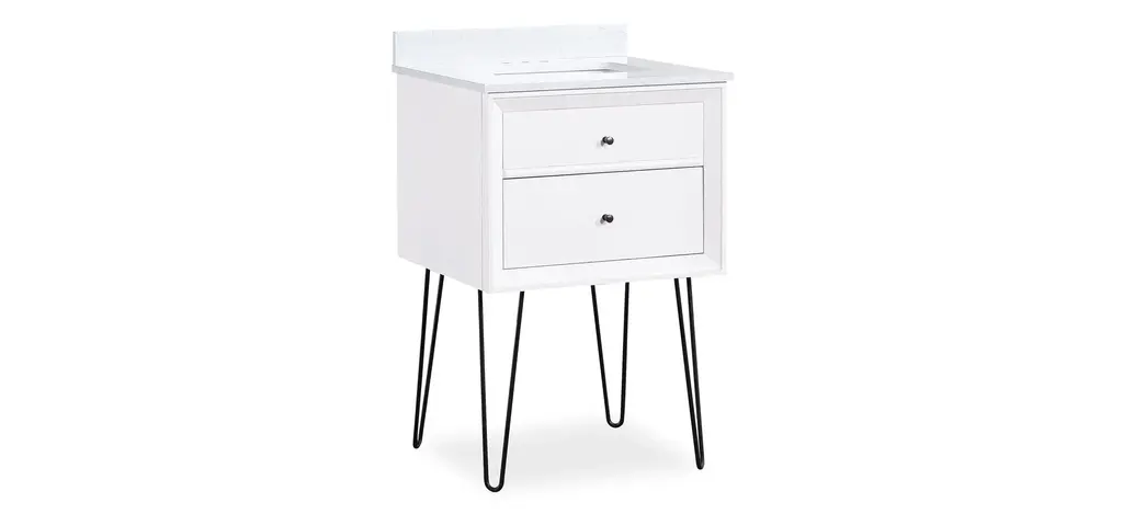 The Lander 24" Bathroom Vanity thinks outside the box! The midcentury modern style inspired bathroom vanity has beautiful metal hairpin legs that are optional to fit with your bathroom style. This means that the vanity must be mounted to the wall as the legs are simply a design feature. Crafted with a mixture of solid wood, engineered wood and fine wood veneer, the Lander includes one working drawer, metal knobs, a rectangular ceramic sink, a composite granite top and backsplash and pre-drilled faucet holes. Faucet sold separately. The composite granite counter top is resilient, non-porous and easy to clean. As for the rest of the vanity, it is finished with multiple paint coats, as well as a lacquer coating for extra durability.