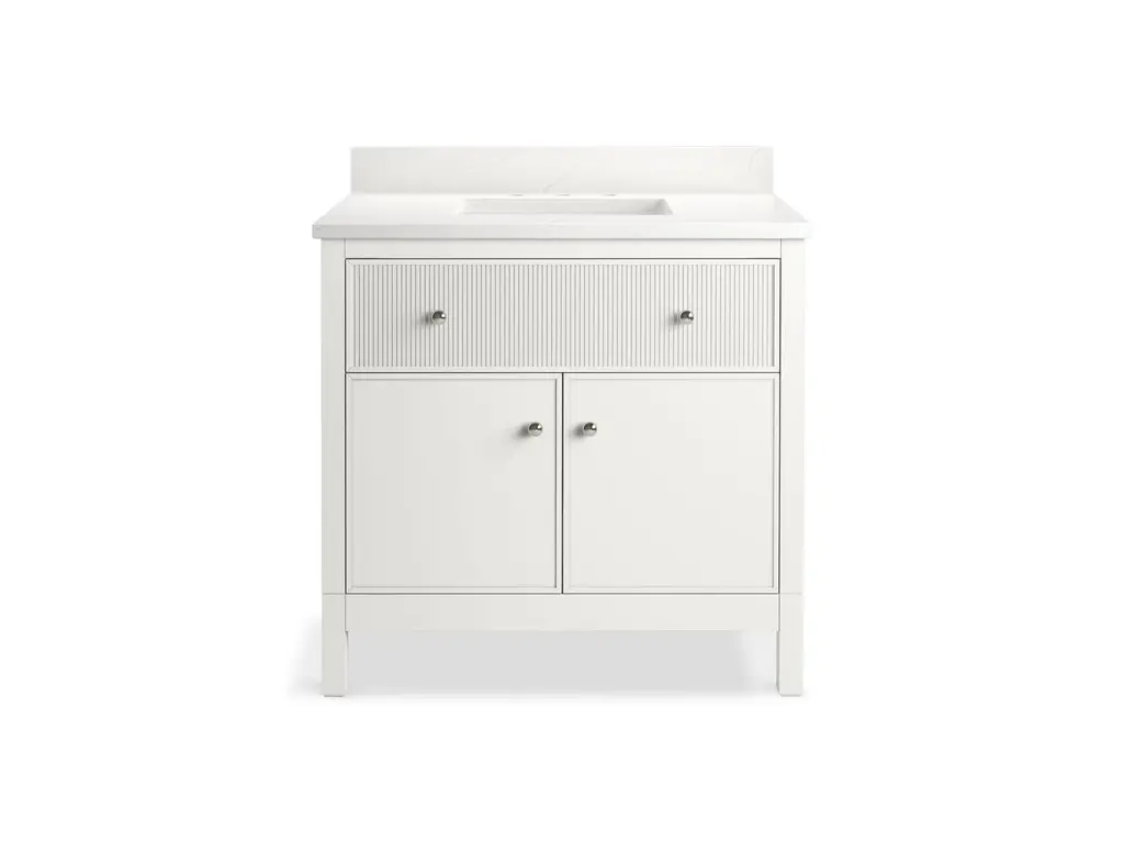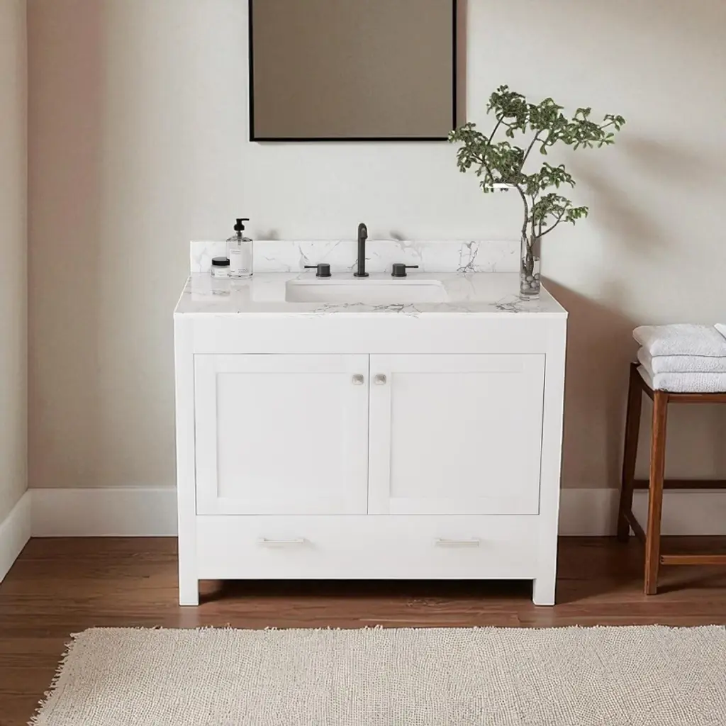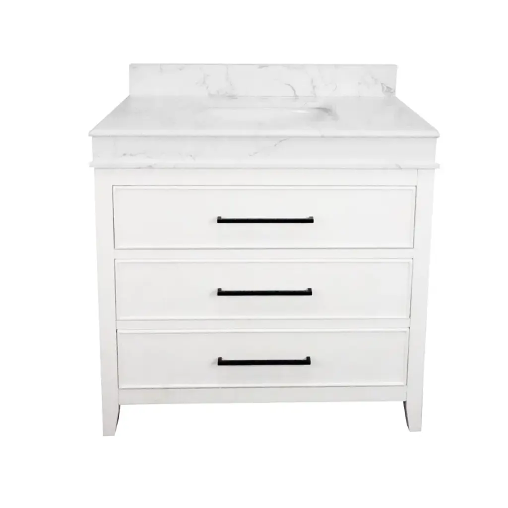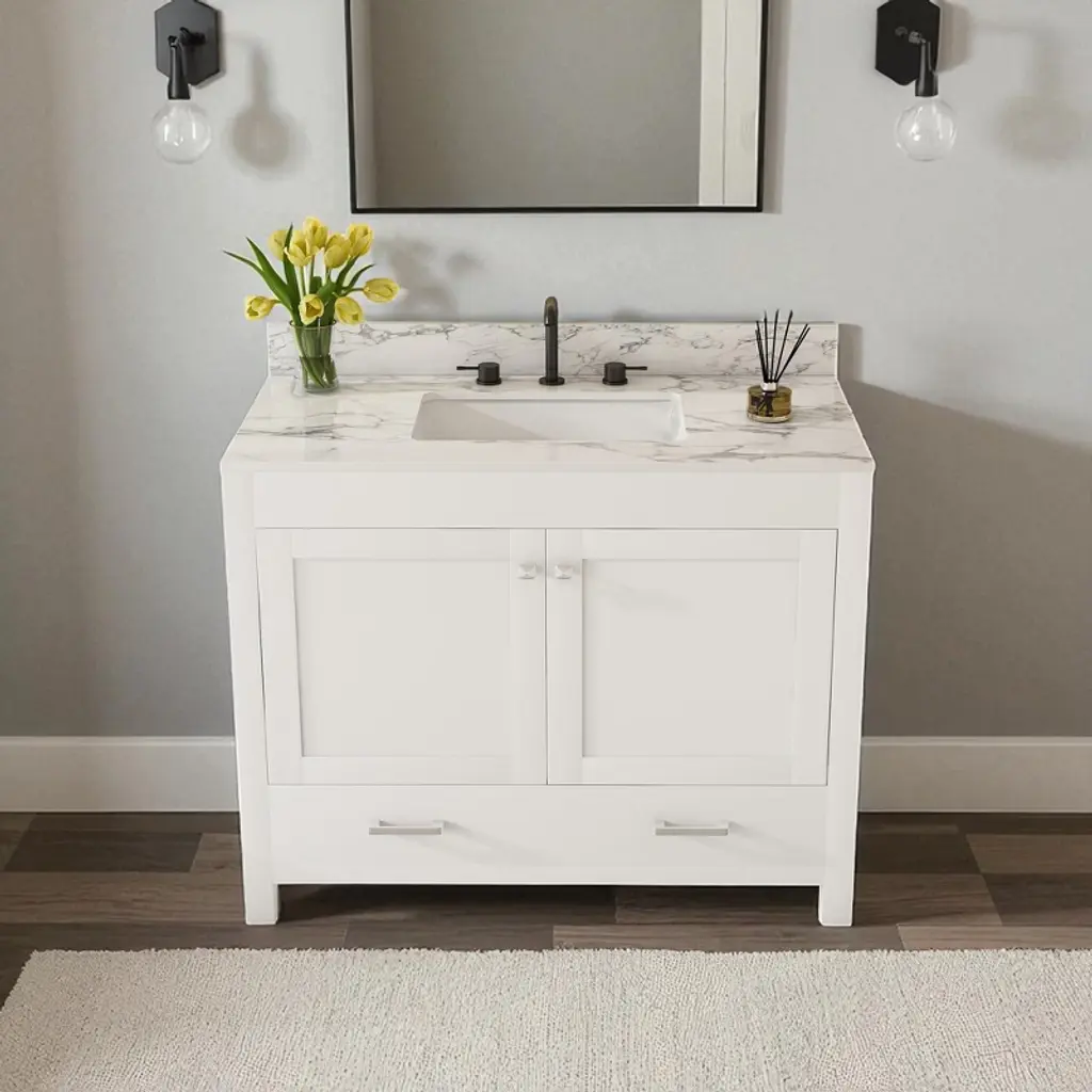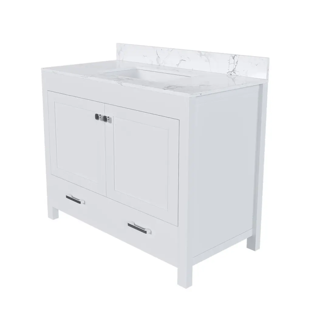 The Lander 24" Bathroom Vanity thinks outside the box! The midcentury modern style inspired bathroom vanity has beautiful metal hairpin legs that are optional to fit with your bathroom style. This means that the vanity must be mounted to the wall as the legs are simply a design feature. Crafted with a mixture of solid wood, engineered wood and fine wood veneer, the Lander includes one working drawer, metal knobs, a rectangular ceramic sink, a composite granite top and backsplash and pre-drilled faucet holes. Faucet sold separately. The composite granite counter top is resilient, non-porous and easy to clean. As for the rest of the vanity, it is finished with multiple paint coats, as well as a lacquer coating for extra durability.