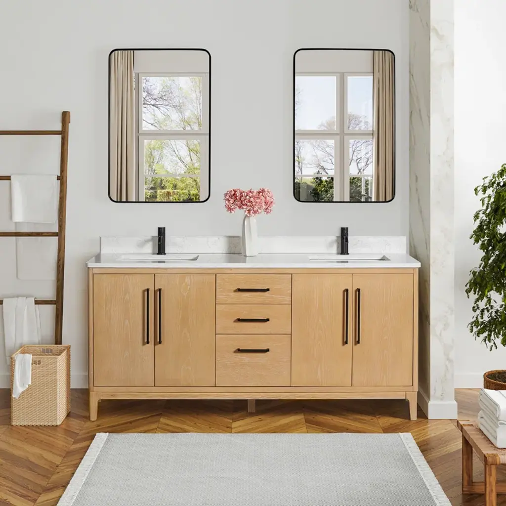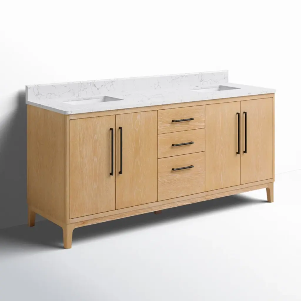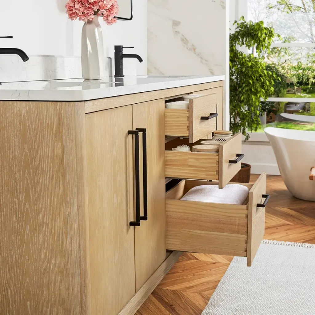 Whether you’re building a new bathroom or upgrading your existing one, our Langosta Series Vanity brings contemporary sophistication to your space. This piece is meticulously crafted from solid wood and crowned with a stunning quartz stone top, ensuring enduring performance and beauty. You’ll love the generous storage, too, complete with built-in organizers that keep toiletries tidy and within easy reach.