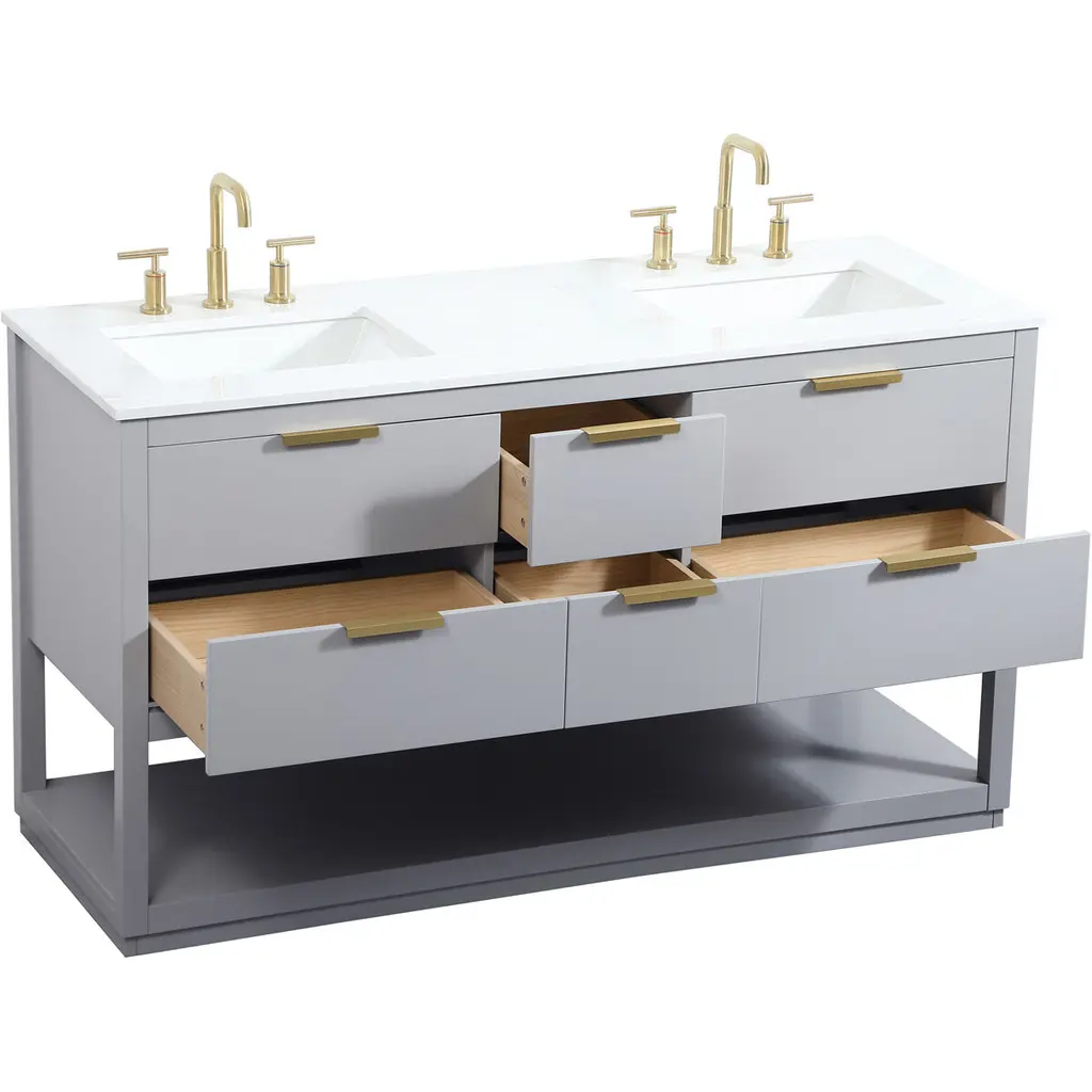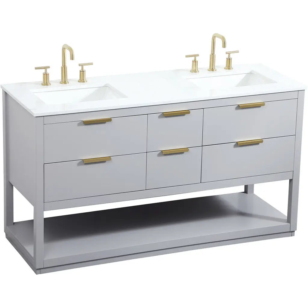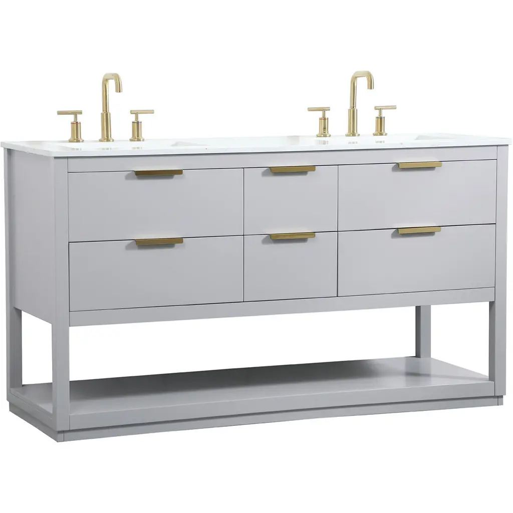 Live in modern comfort with this 60" gray finish double vanity. Dressed in a gray and sleek gold metal hardware, its contemporary style will have your bathroom or powder room elevated in modern sophistication. The open shelf at the base and five drawers reveal ample storage space for your bathroom essentials and miscellany. Clean lines create its own visual interest, adding trendy looks to your already chic room.