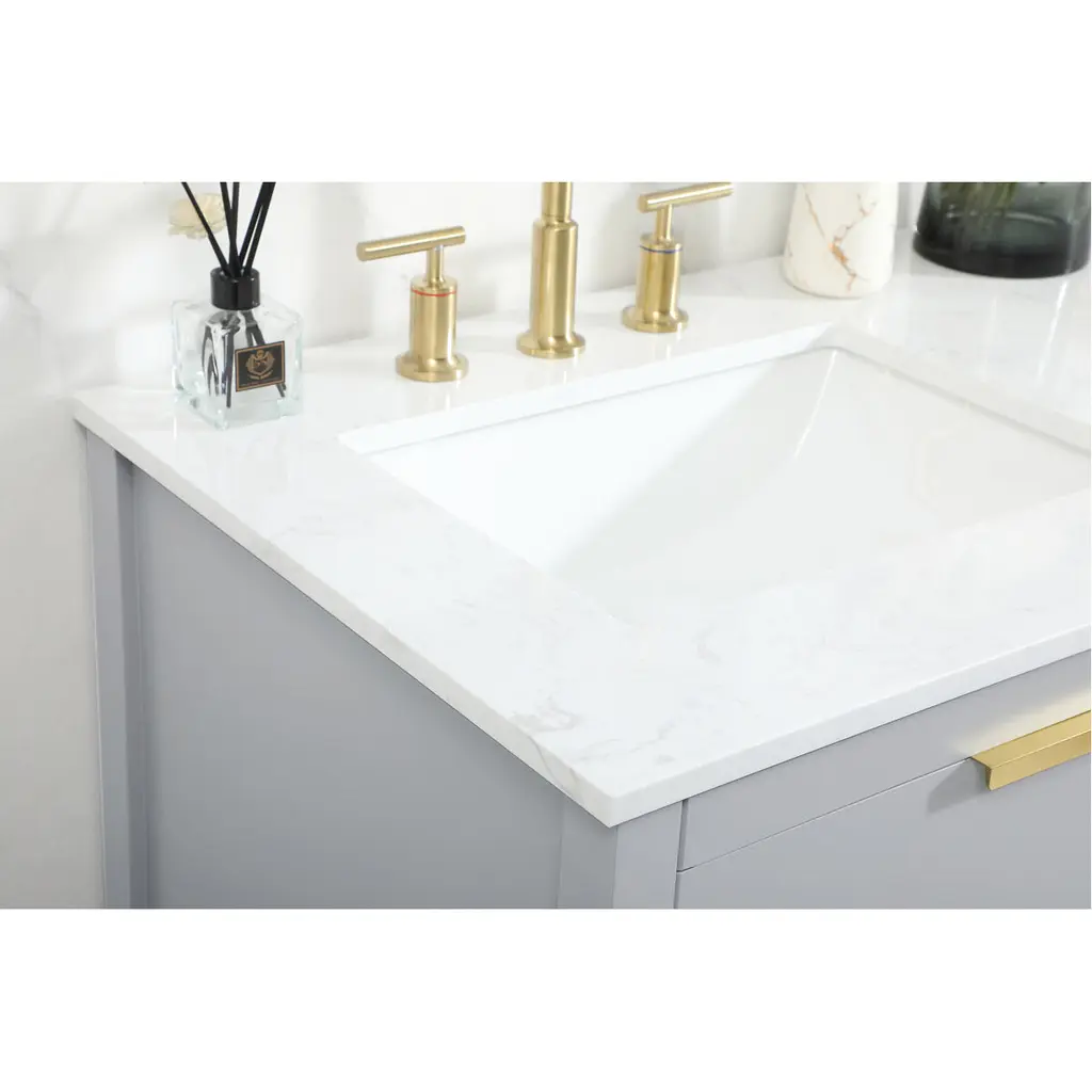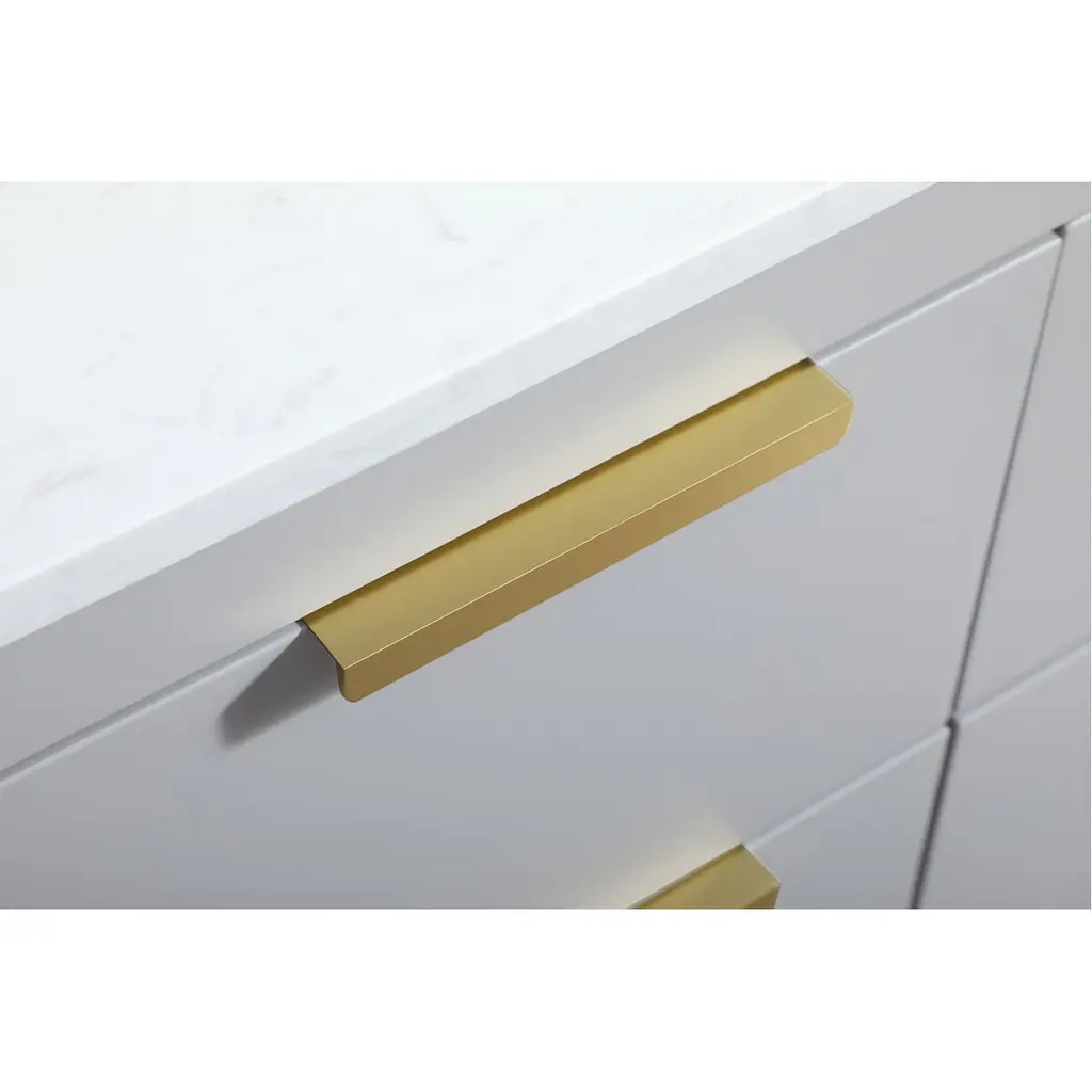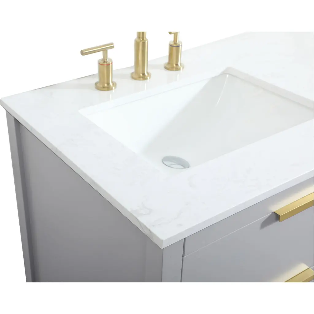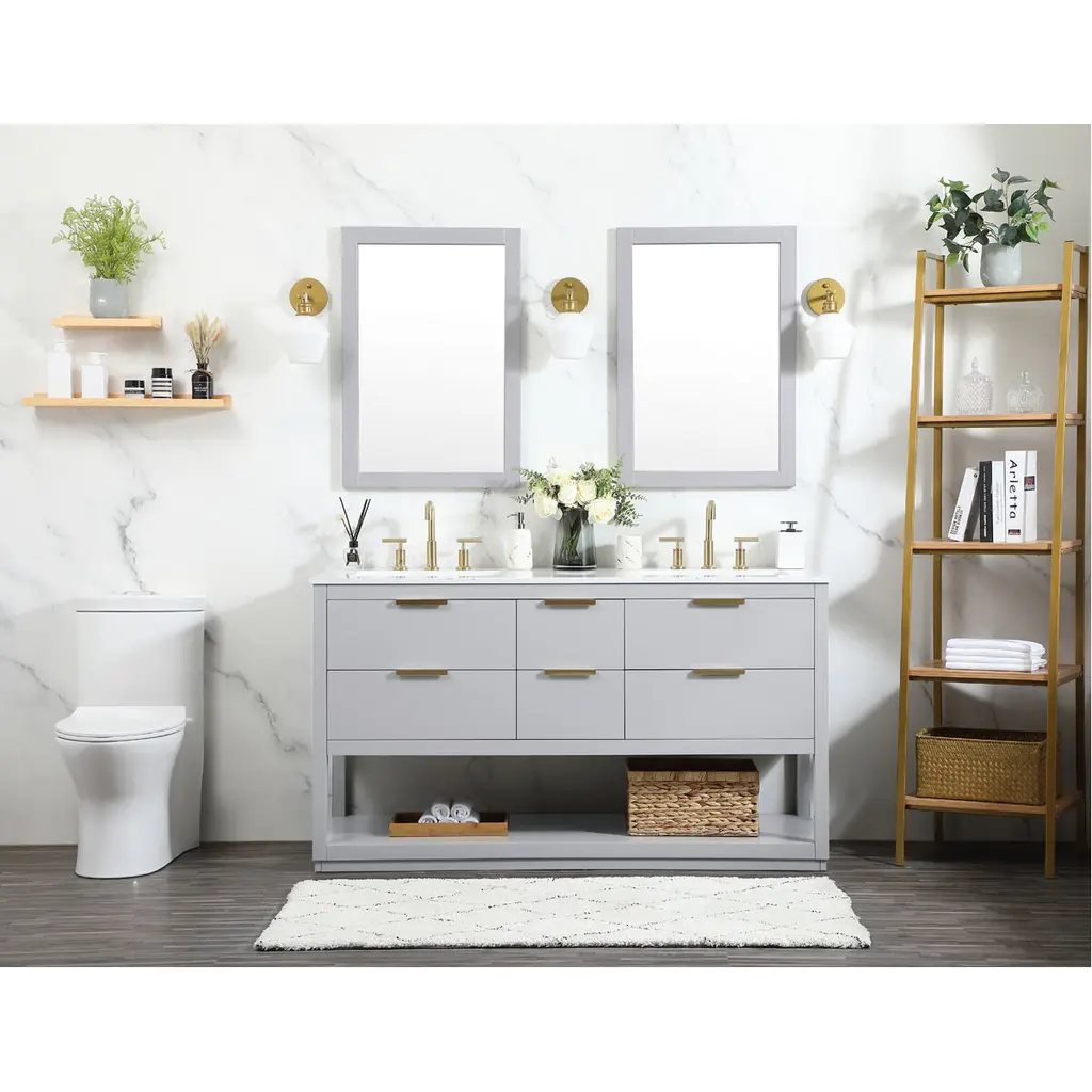 Live in modern comfort with this 60" gray finish double vanity. Dressed in a gray and sleek gold metal hardware, its contemporary style will have your bathroom or powder room elevated in modern sophistication. The open shelf at the base and five drawers reveal ample storage space for your bathroom essentials and miscellany. Clean lines create its own visual interest, adding trendy looks to your already chic room.