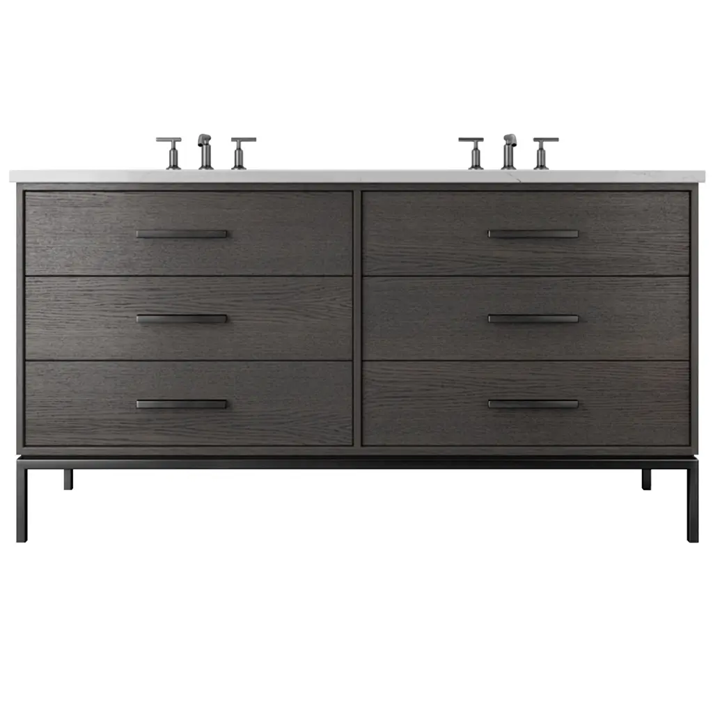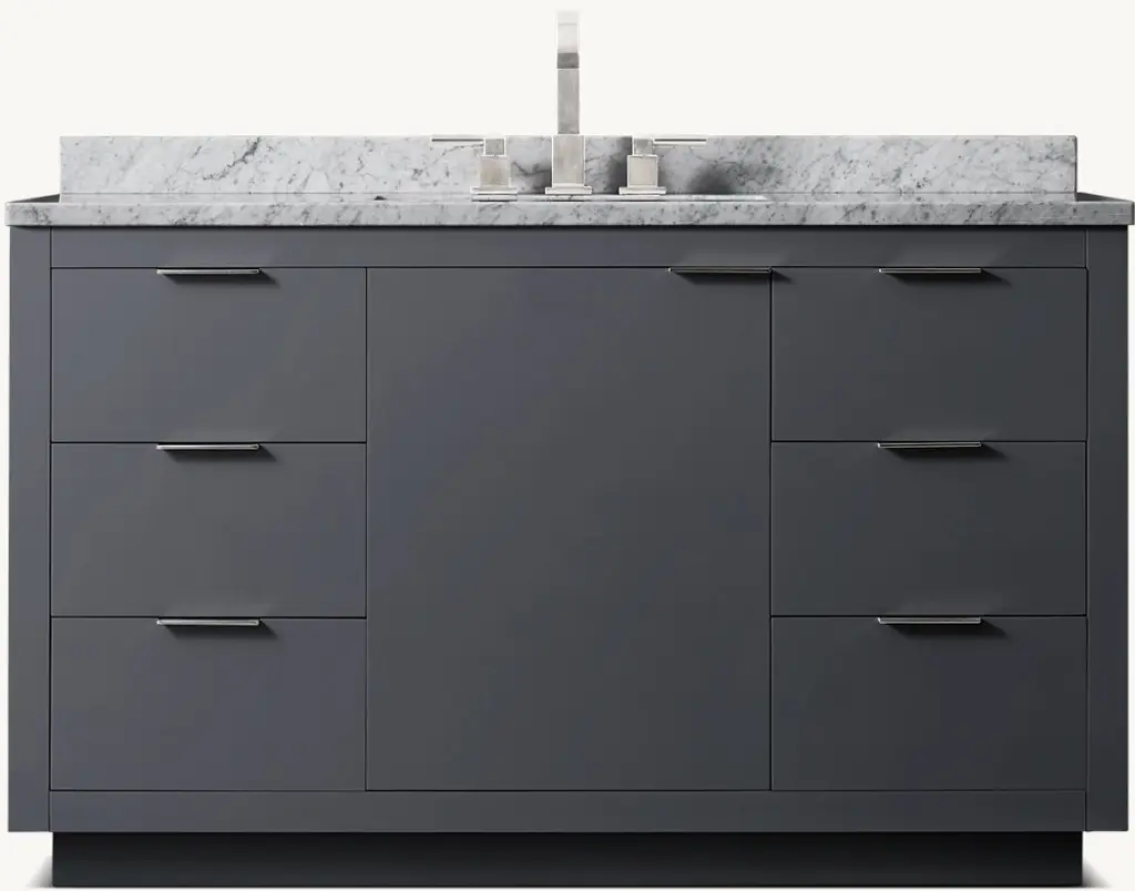 Our collection's clean, calm lines and bold proportions bring a minimal aesthetic to the bath. Handcrafted of wood with a moisture-resistant finish, the vanity features slender metal hardware – integrated and unobtrusive – that adds a refined accent to the streamlined façade, while its plinth base creates the illusion of floating.