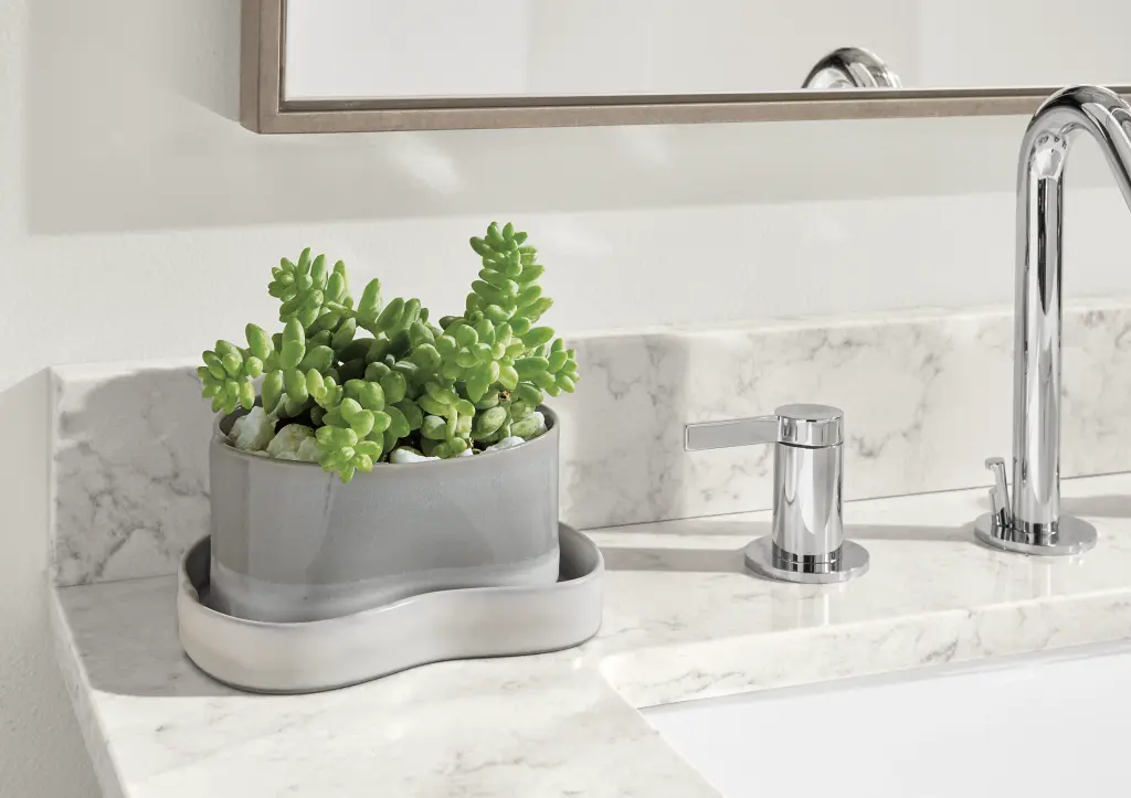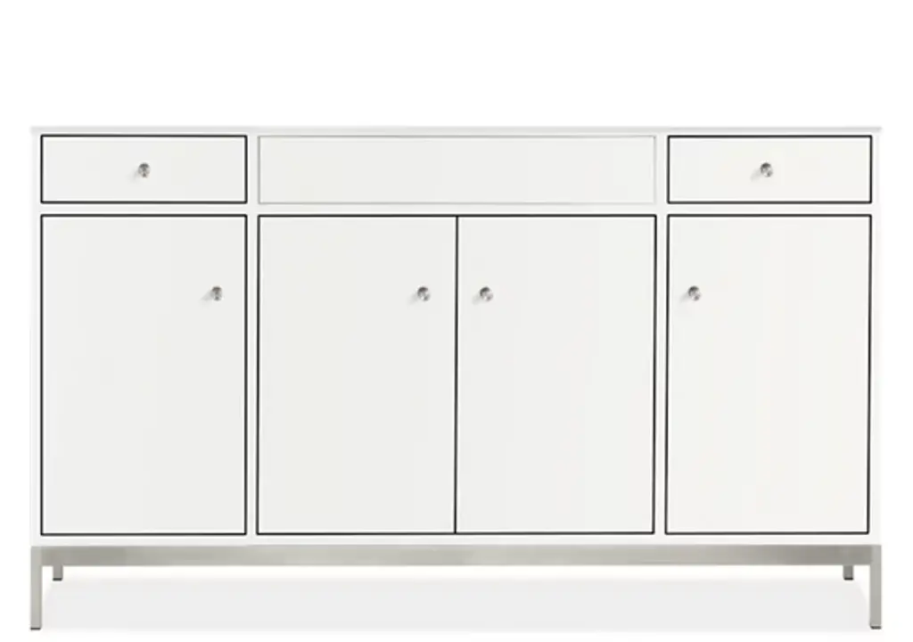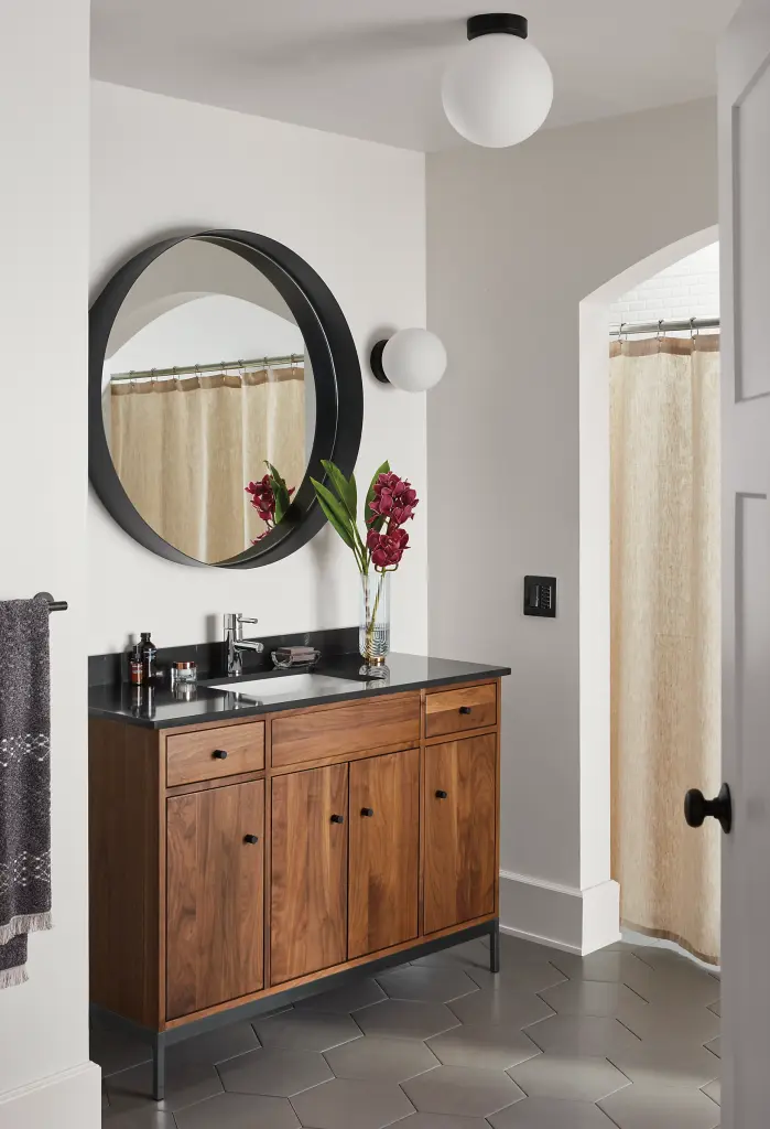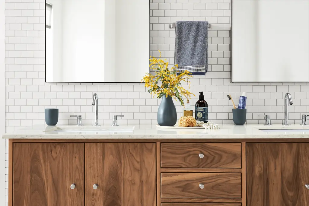 Crafted in a Wisconsin woodworking shop, our Linear bathroom vanity with steel base is made from veneer and solid wood that's sustainably harvested in the U.S. This modern vanity features soft-close drawers and doors plus an optional quartz top with customizable options. The Linear collection has been a Room & Board cornerstone since 1991.