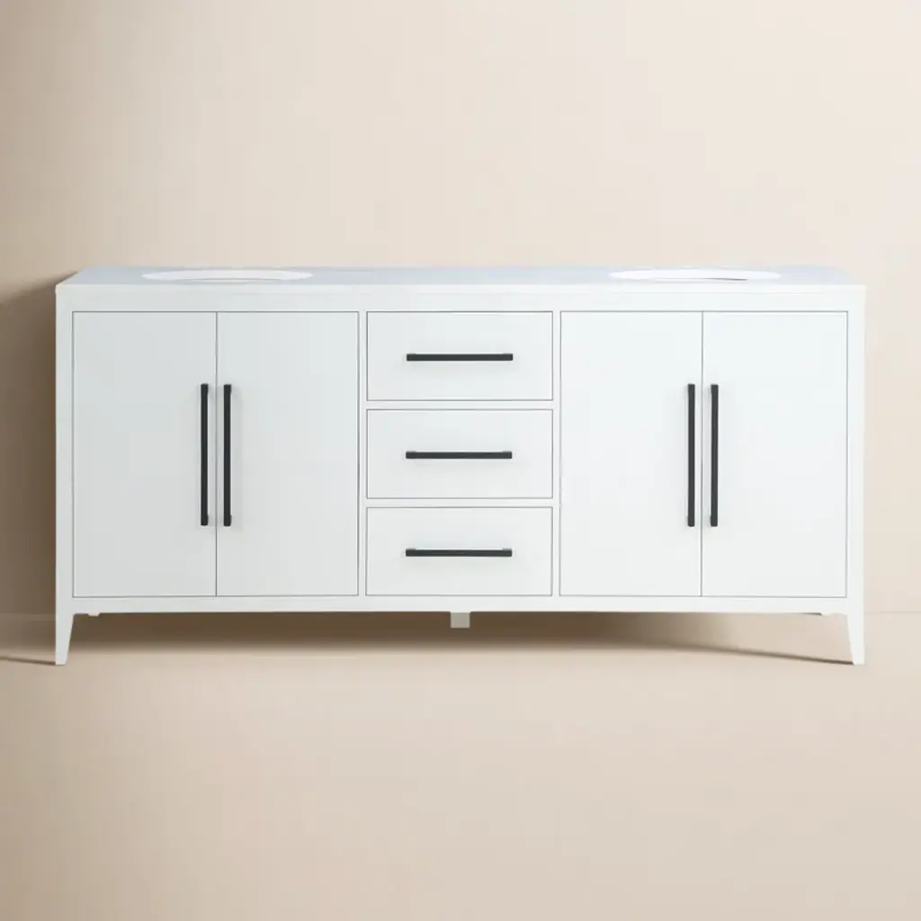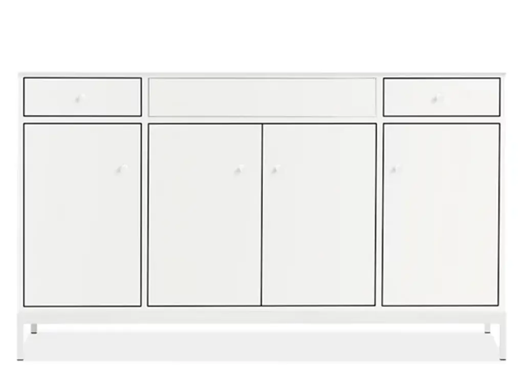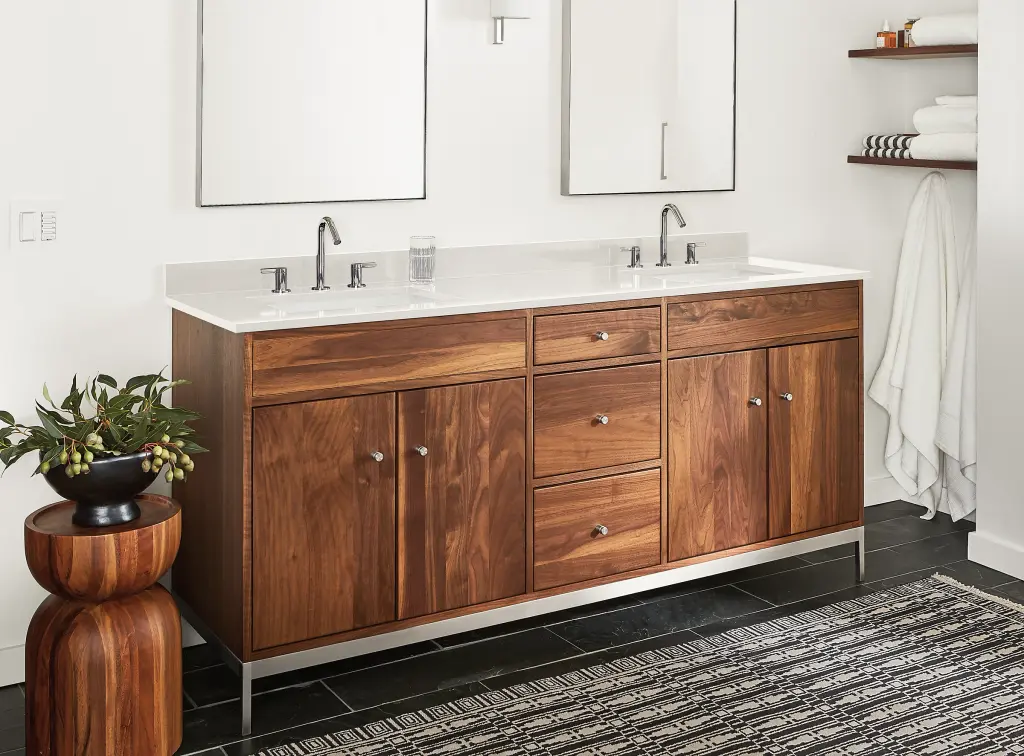 Crafted in a Wisconsin woodworking shop, our Linear bathroom vanity with steel base is made from veneer and solid wood that's sustainably harvested in the U.S. This modern vanity features soft-close drawers and doors plus an optional quartz top with customizable options. The Linear collection has been a Room & Board cornerstone since 1991.