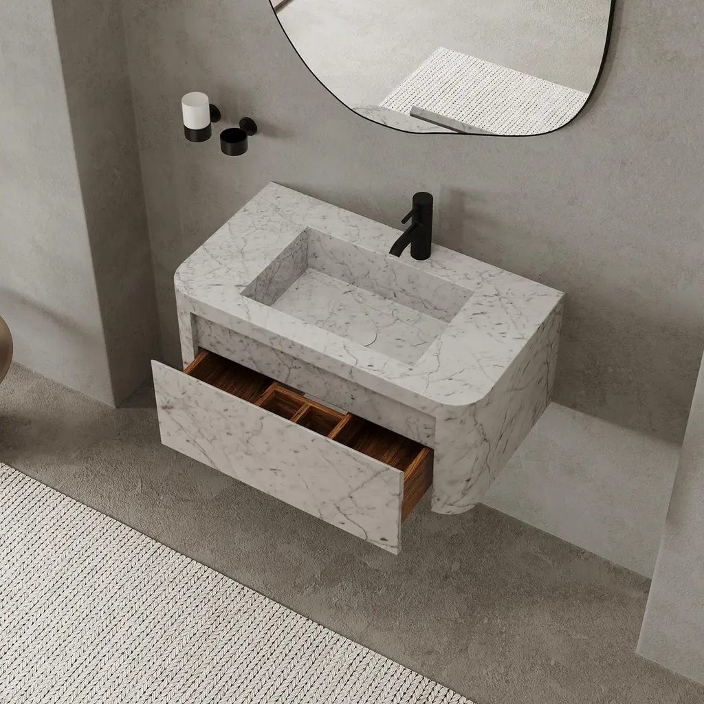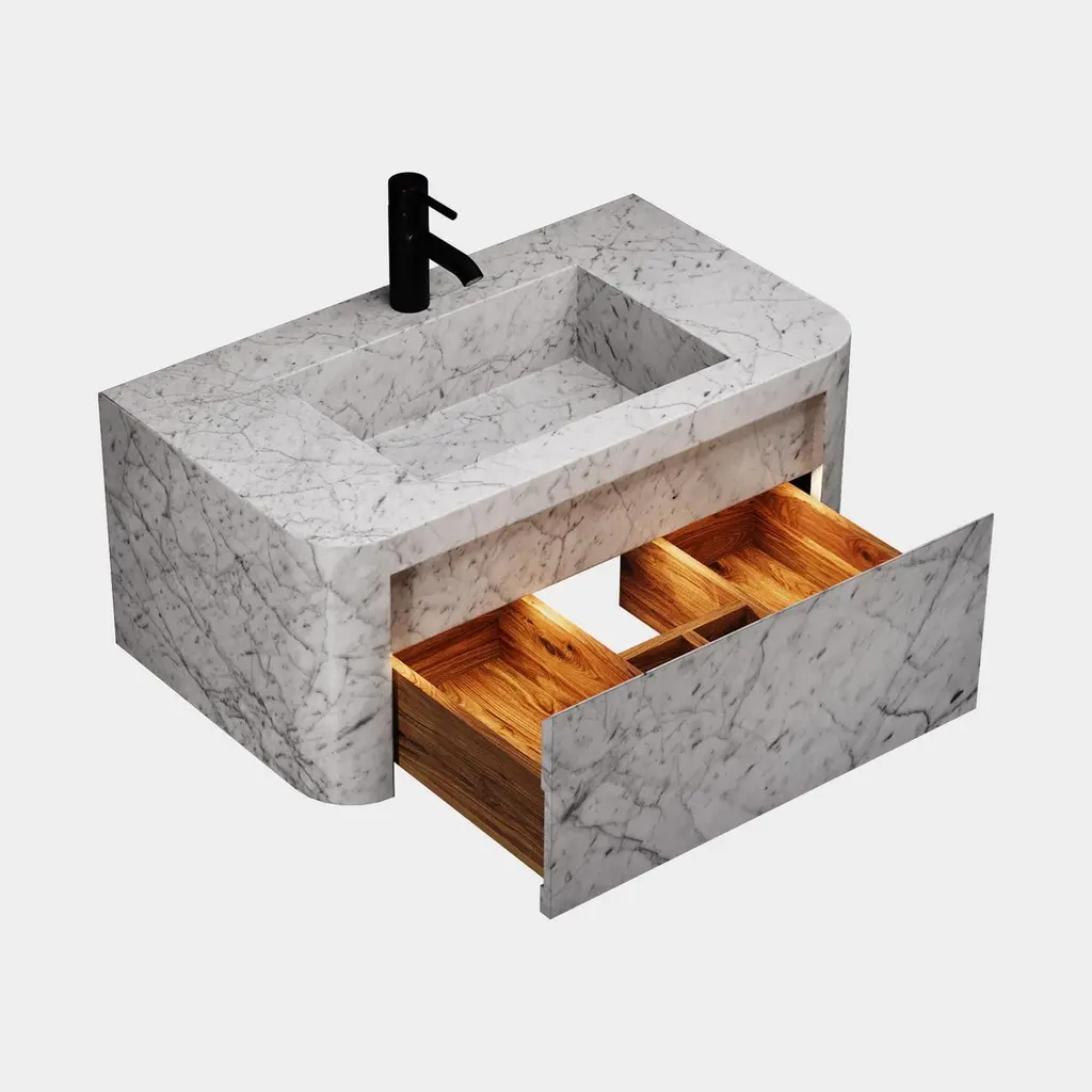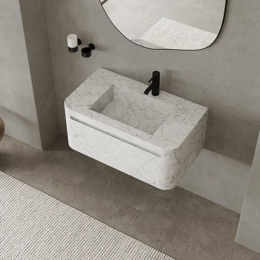 Our Lyke floating vanity features a beautiful veined marble that adds depth and character to your bathroom aesthetics.The exterior is crafted entirely from premium marble, with the interior crafted in solid wood—this vanity combines a sleek rectangular basin with an integrated soft-touch drawer storage solution. A perfect fusion of minimalist design and natural elegance.Its smooth, honed surface and beveled edges highlight the unique veining and texture of the marble while offering a touch of luxury. This model features one drawer with four compartments, an easy-close drawer mechanism, and smart LED lighting integration.Available in a variety of marble options, allowing you to select the perfect color and texture to match your unique design vision. The water supply kit, drain assembly, and faucets are not included; however, our installation manual is included to assist!As marble is a natural material, variations in background color, veining distribution, and patterns are to be expected, making each piece uniquely beautiful.DELIVERY LEAD TIME.THIS ITEM IS IN TRANSIT- 4-6 WeeksDimensions: 80 x 45 x 35 CM