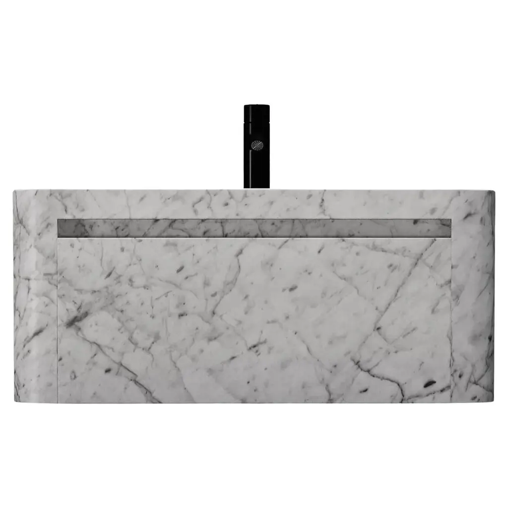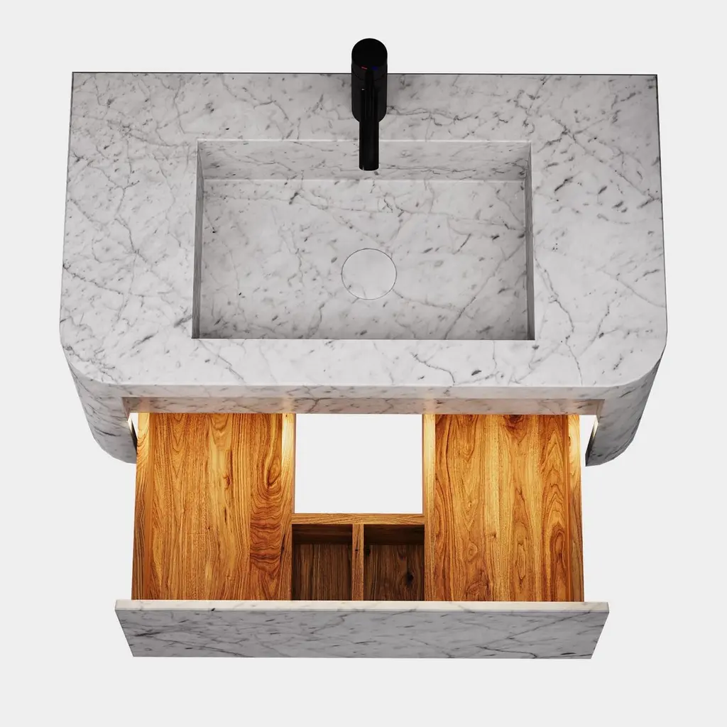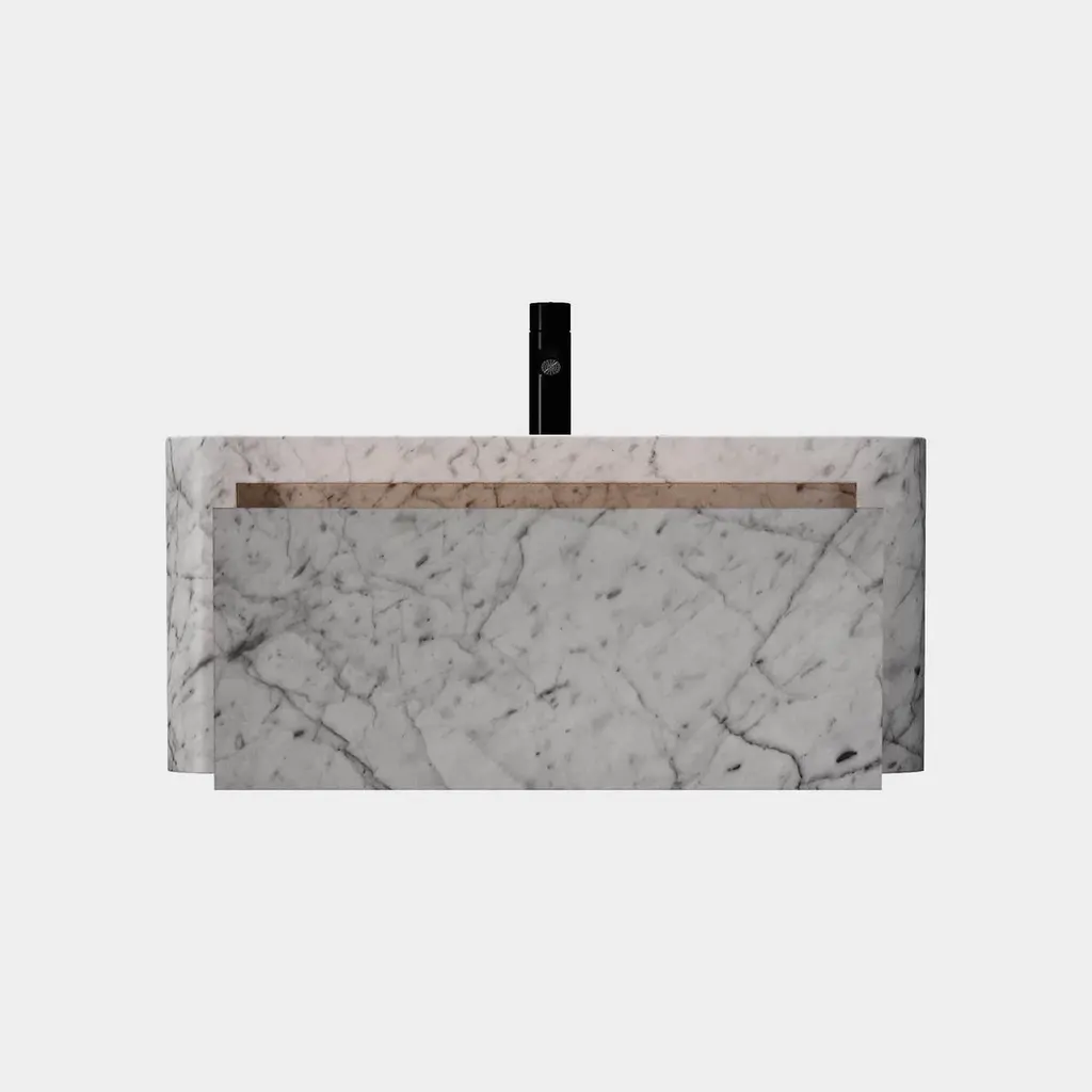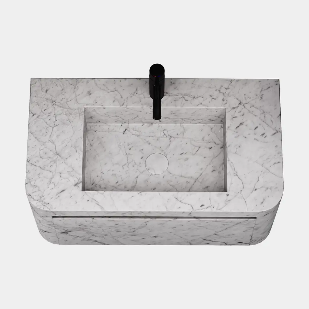 Our Lyke floating vanity features a beautiful veined marble that adds depth and character to your bathroom aesthetics.The exterior is crafted entirely from premium marble, with the interior crafted in solid wood—this vanity combines a sleek rectangular basin with an integrated soft-touch drawer storage solution. A perfect fusion of minimalist design and natural elegance.Its smooth, honed surface and beveled edges highlight the unique veining and texture of the marble while offering a touch of luxury. This model features one drawer with four compartments, an easy-close drawer mechanism, and smart LED lighting integration.Available in a variety of marble options, allowing you to select the perfect color and texture to match your unique design vision. The water supply kit, drain assembly, and faucets are not included; however, our installation manual is included to assist!As marble is a natural material, variations in background color, veining distribution, and patterns are to be expected, making each piece uniquely beautiful.DELIVERY LEAD TIME.THIS ITEM IS IN TRANSIT- 4-6 WeeksDimensions: 80 x 45 x 35 CM