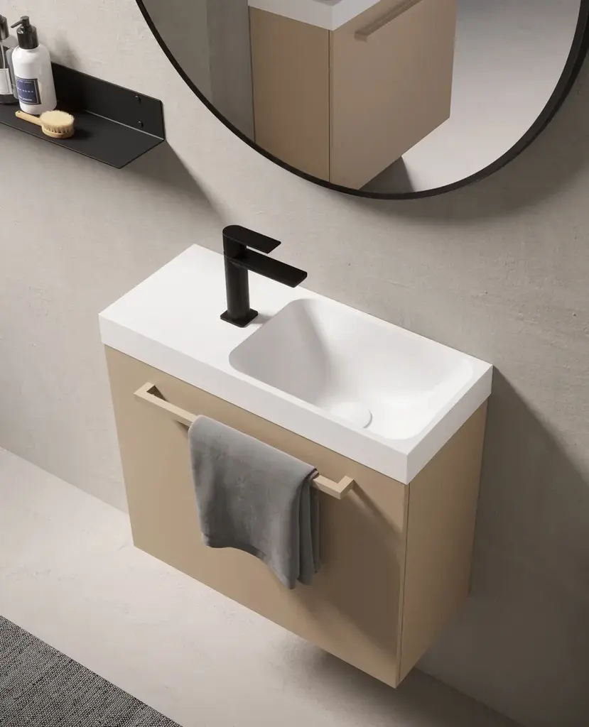 MAKE 23 is a bathroom composition which includes:- ALB60 round mirror with metal frame and black eco-leather string- SPAZIO02 matt white Tecnoril washbasin- MK357 washbasin top with door and open unit