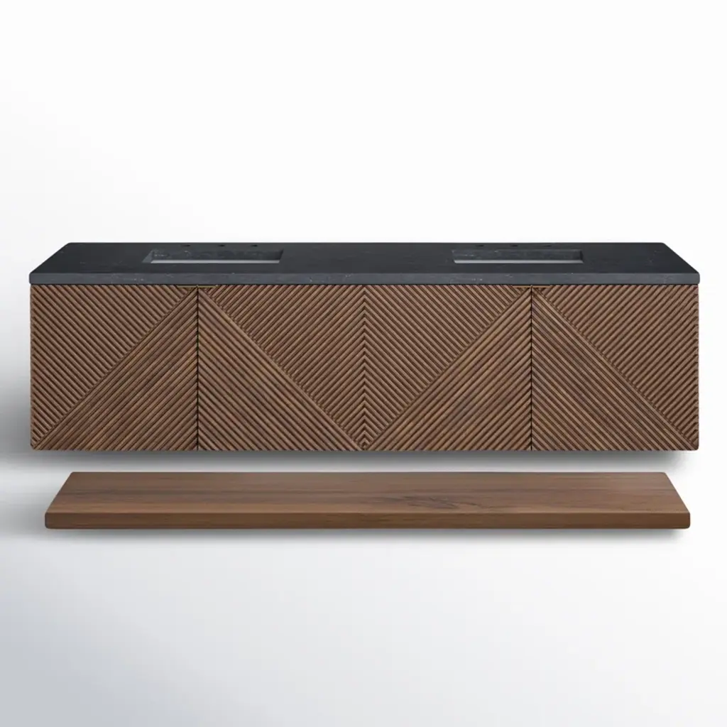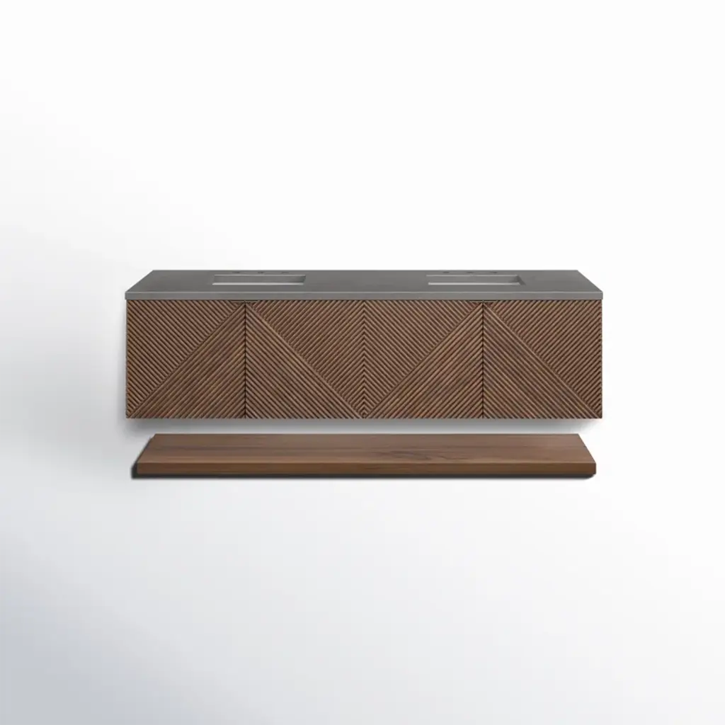 Our Marcello wall-mounted vanity collection's clean lines and geometric design will add a touch of mid-century modern charm to your bathroom. The warm chestnut finish adds timeless elegance, while the pattern play detail of the reeded front adds visual interest to this masterpiece. The wall-hanging feature contemporizes the look with an easy-to-install bracket system included. The Marcello collection features pairs of doors accented in champagne brass finish tab-style door pulls that reveal internal drawer storage and a generous internal shelf. A floating shelf, perfect for folded towels, adds a spa feel.