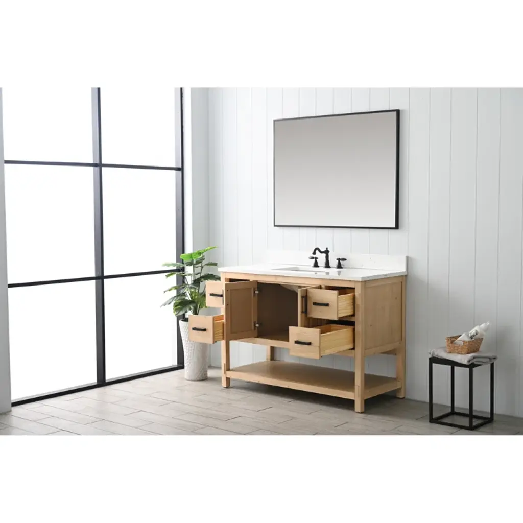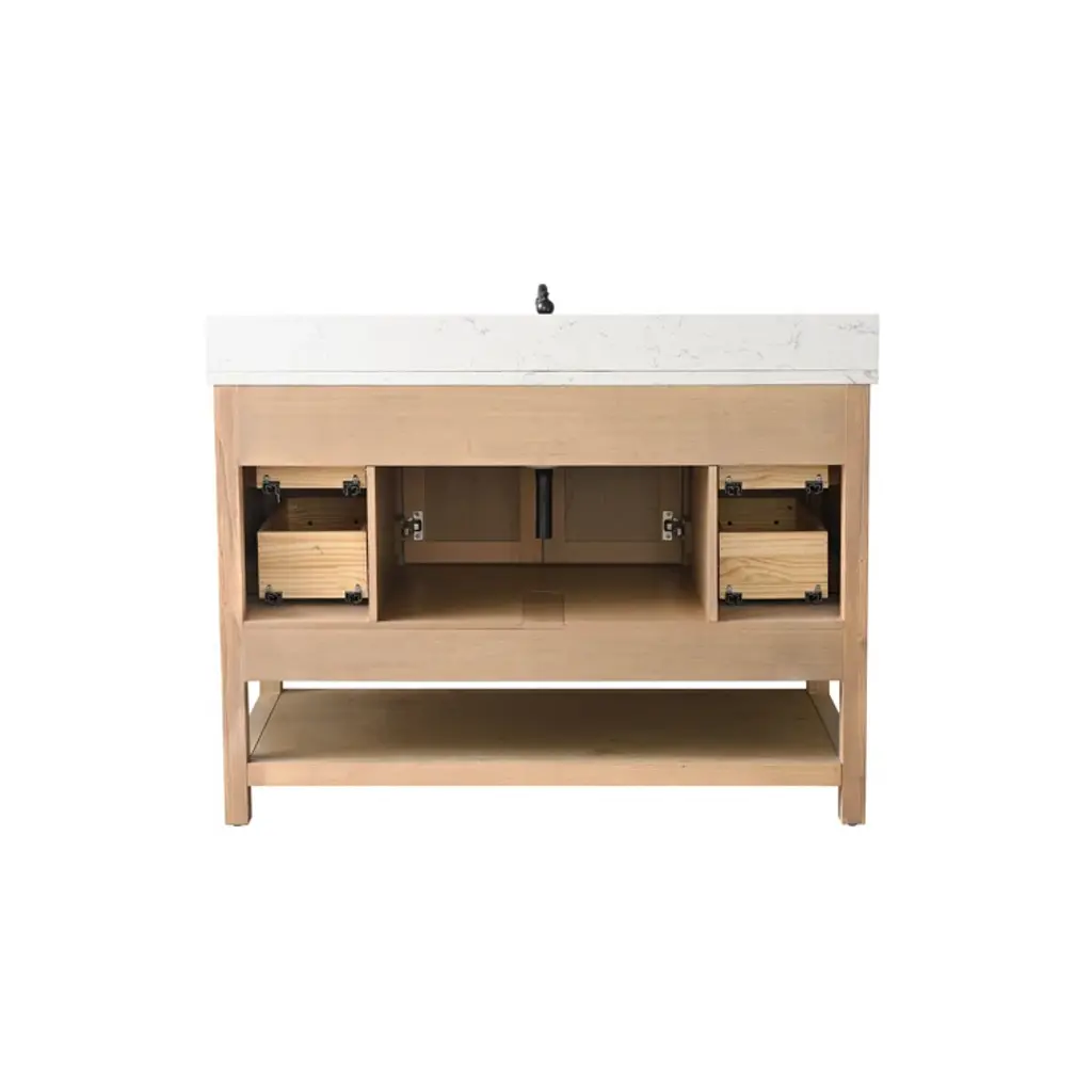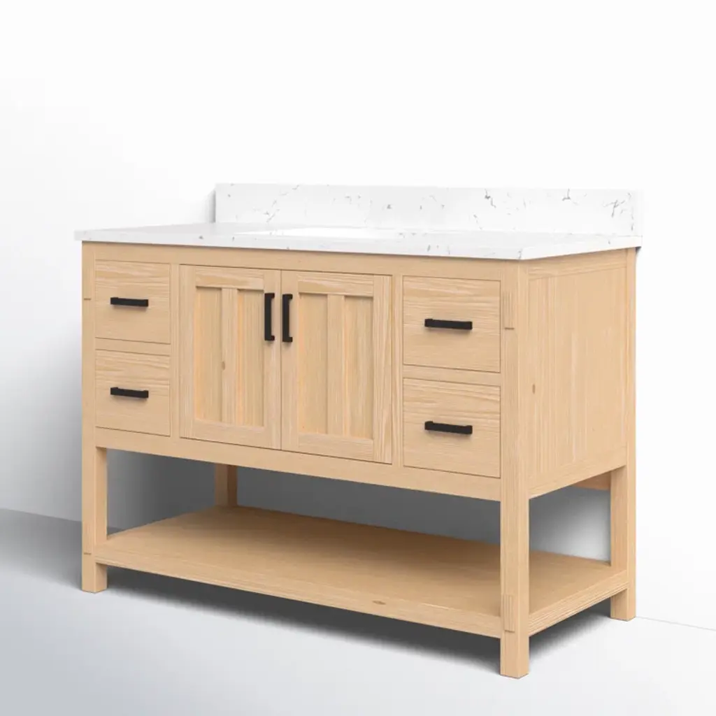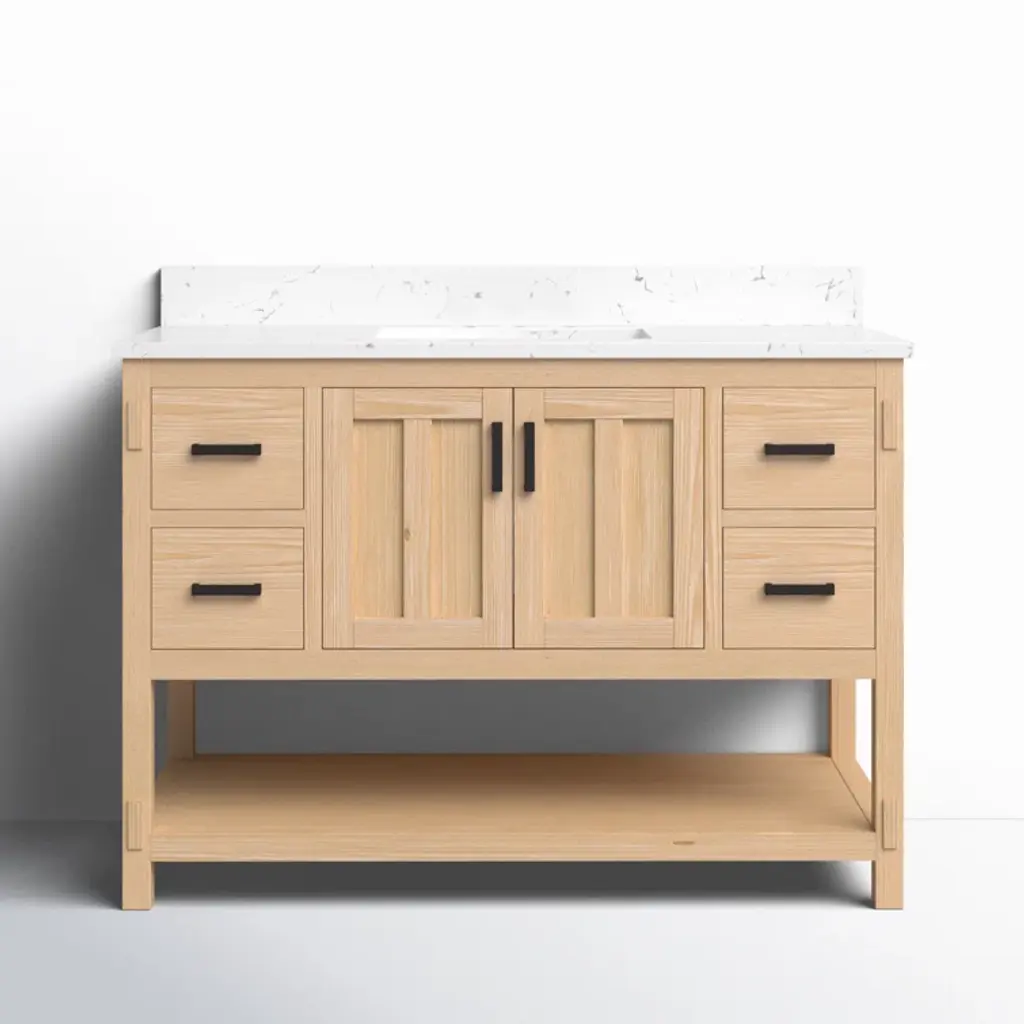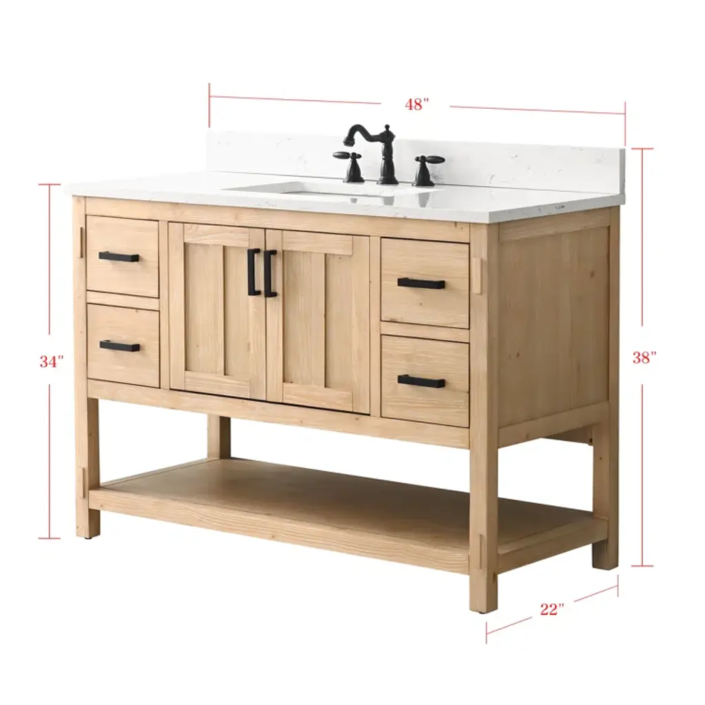 This 48" single bathroom vanity adds a modern rustic look to your space, thanks to its clean lines and country-inspired aesthetics. It has a freestanding solid and engineered wood base, with rich white-washed finishes that highlight the wood grain for a fresh spot to get ready for the day. Four drawers and a central cabinet with two double doors give you plenty of room to tuck away toiletries and other bathroom essentials. There's also an open lower shelf for fresh towels. This vanity features a white quartz countertop with a rectangular ceramic undermount sink (faucet sold separately). Best of all, it arrives fully assembled.