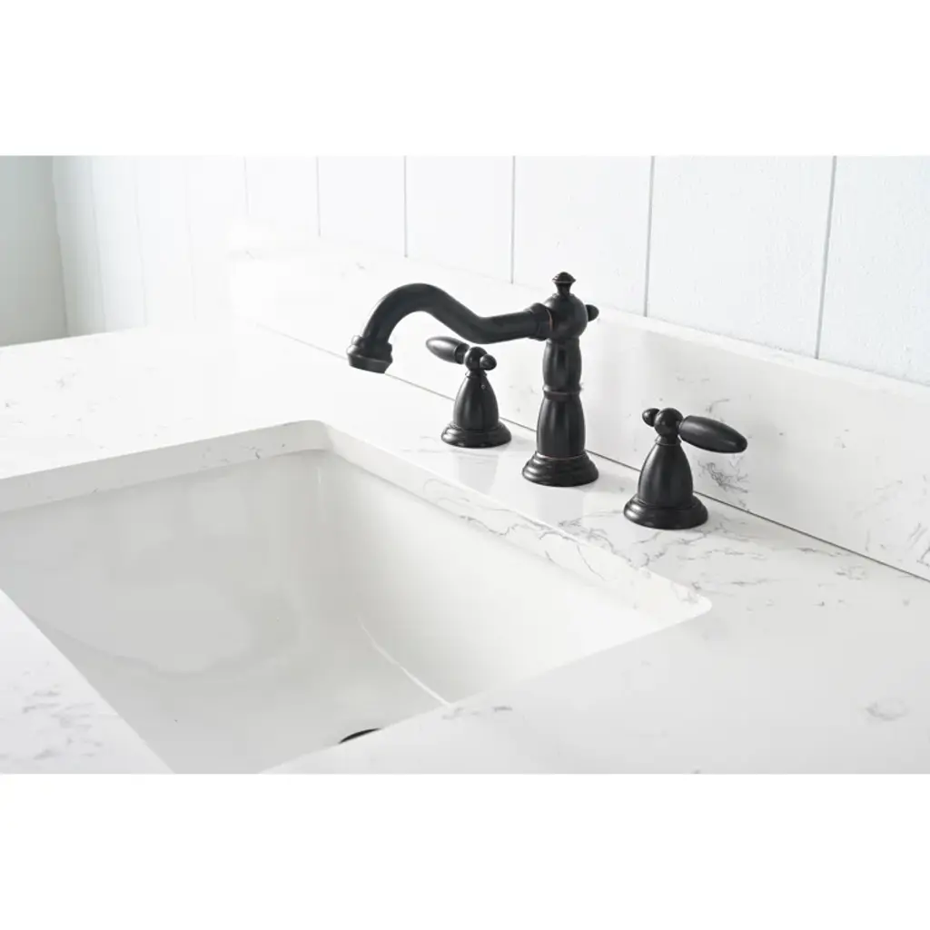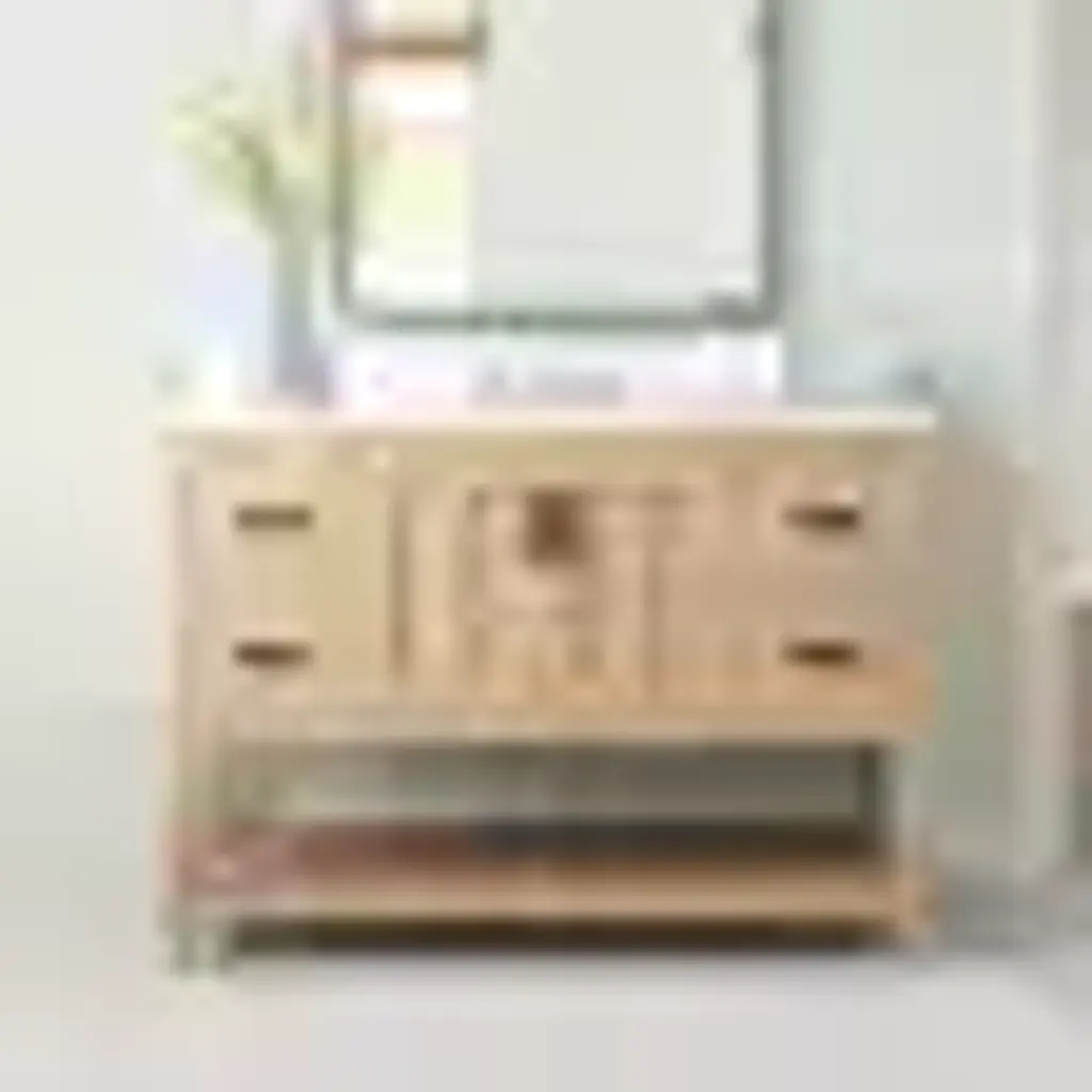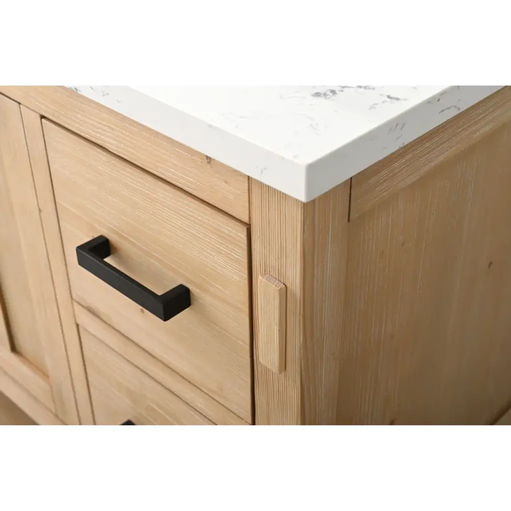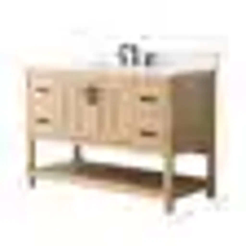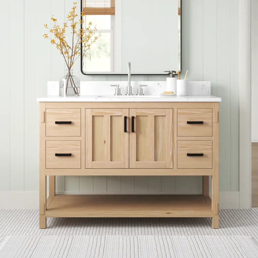 This 48" single bathroom vanity adds a modern rustic look to your space, thanks to its clean lines and country-inspired aesthetics. It has a freestanding solid and engineered wood base, with rich white-washed finishes that highlight the wood grain for a fresh spot to get ready for the day. Four drawers and a central cabinet with two double doors give you plenty of room to tuck away toiletries and other bathroom essentials. There's also an open lower shelf for fresh towels. This vanity features a white quartz countertop with a rectangular ceramic undermount sink (faucet sold separately). Best of all, it arrives fully assembled.