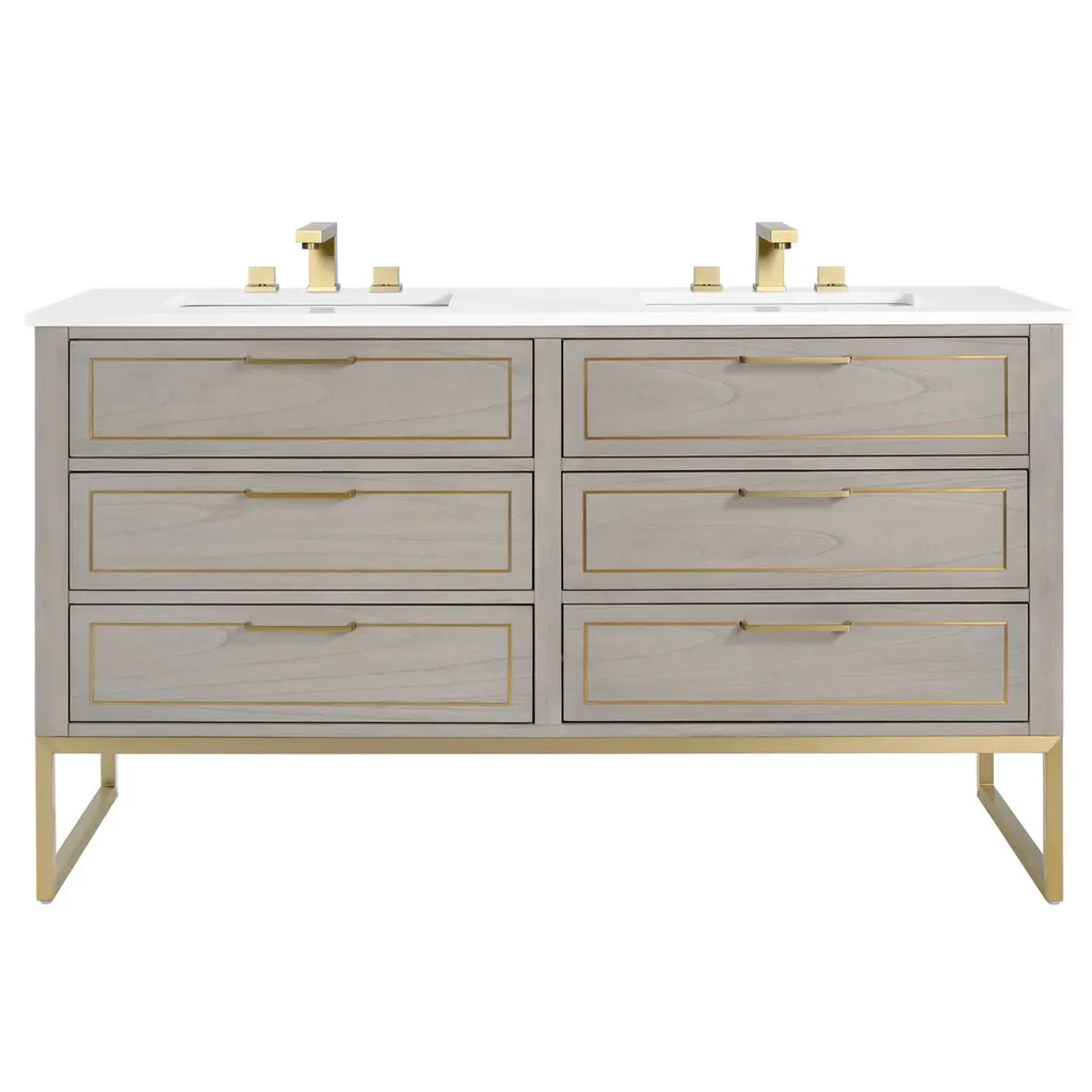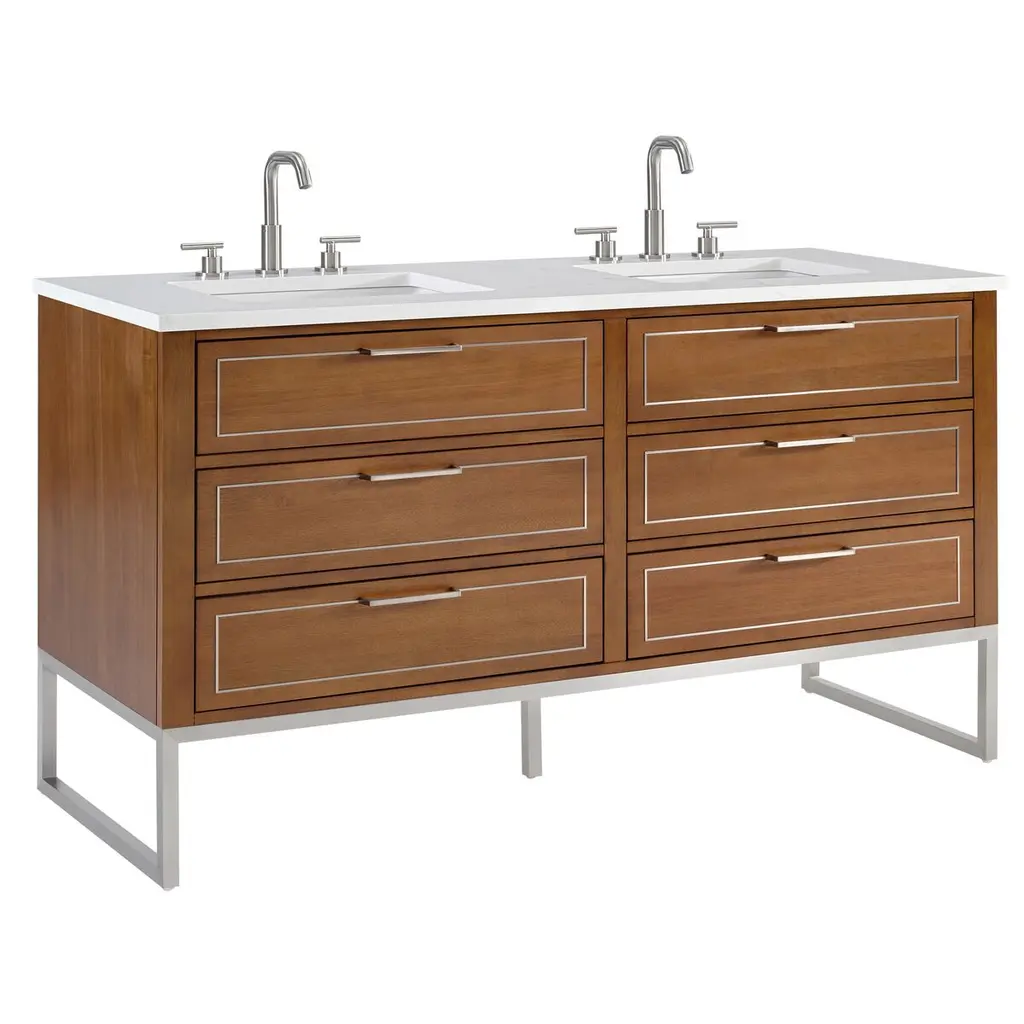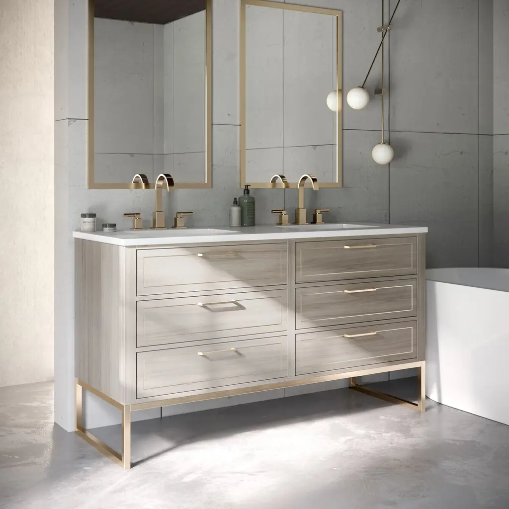 The Markham Bathroom Vanity collection exudes stately elegance, characterized by its clean lines and striking material contrasts. Each vanity features a three to six-drawer cabinet that traces every angle with urbane style and presence. Elevated on a sophisticated frame, the drawers are adorned with real wood veneer, offering a choice of finishes that enhance its refined appeal. Slim, soft-glide horizontal pulls and delicate metal inlays accentuate the facade, adding to its sophisticated charm. This collection is designed to bring a touch of luxury and timeless elegance to any bathroom setting. (Faucet not included)