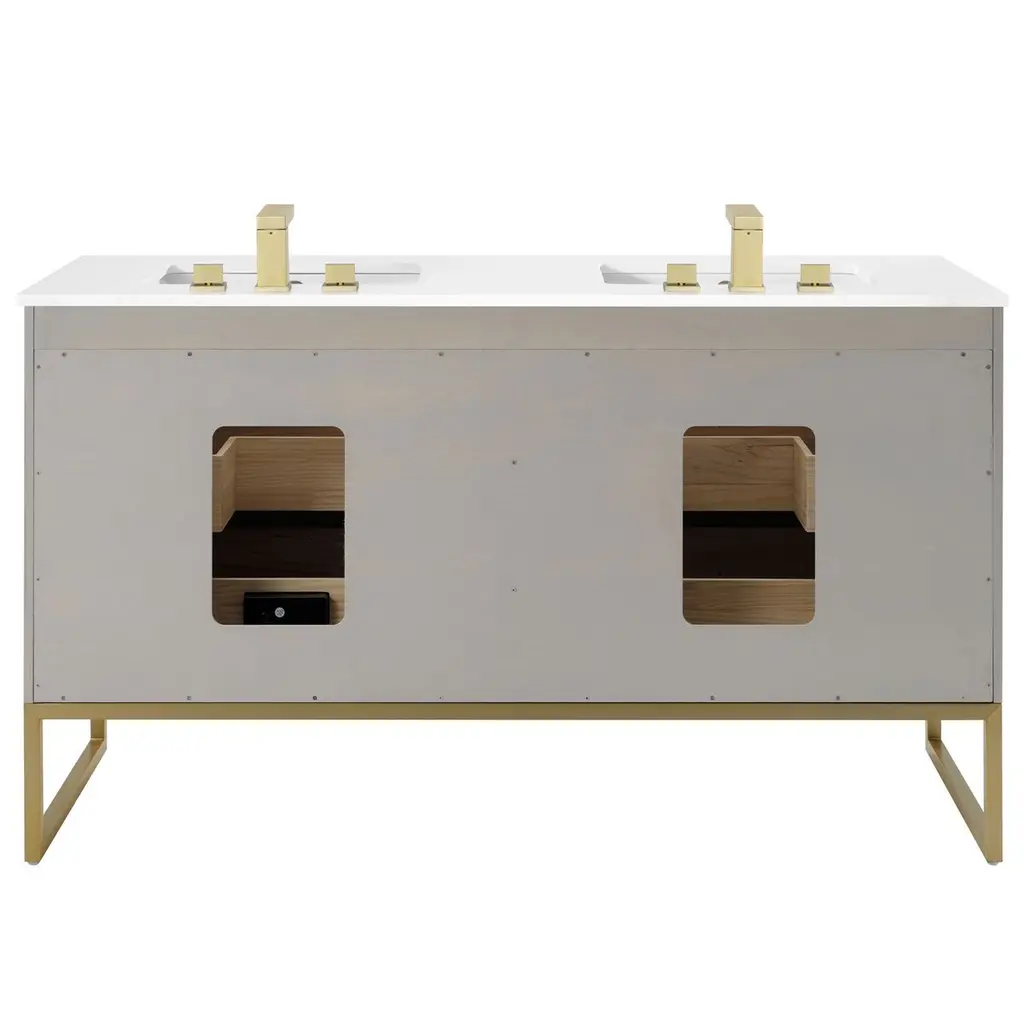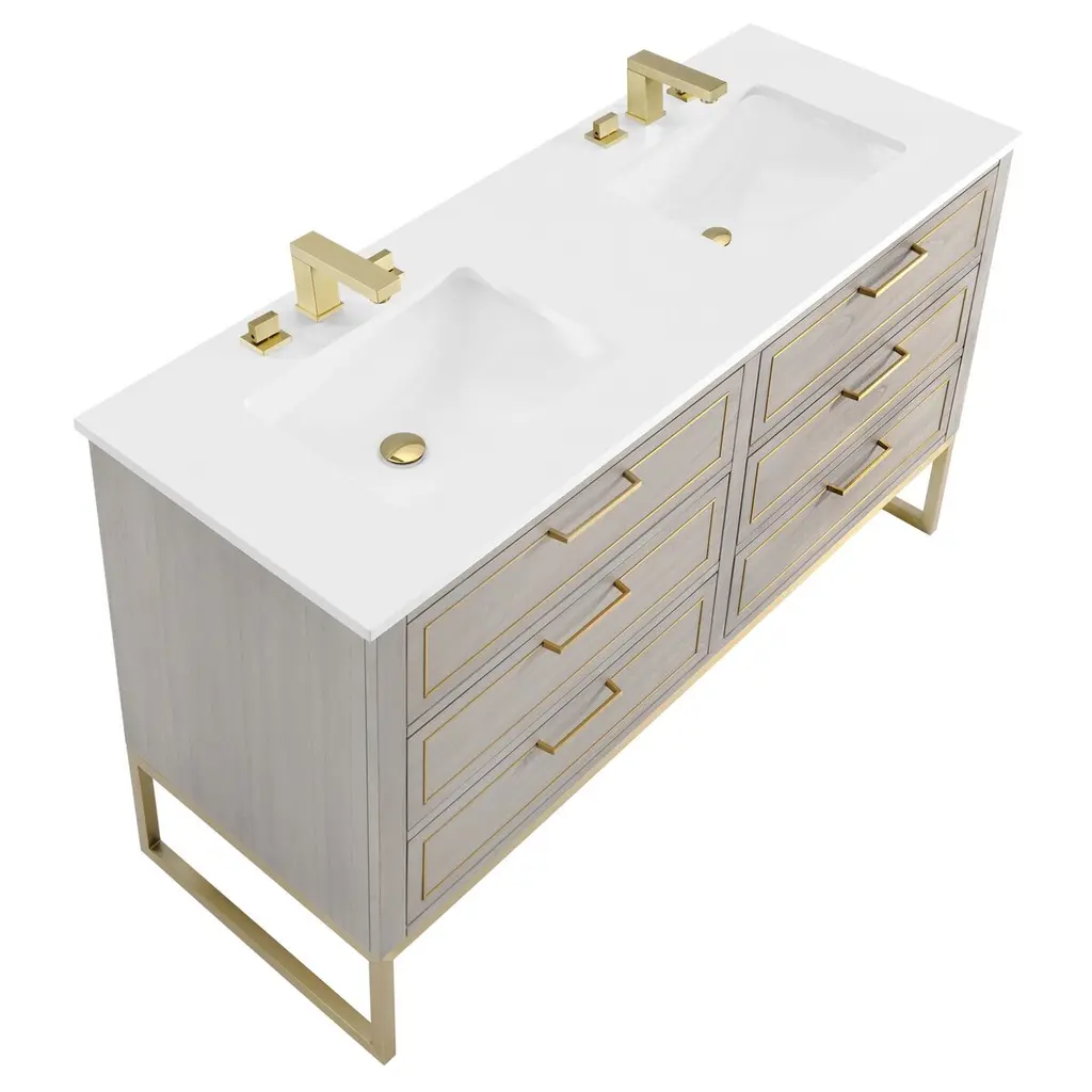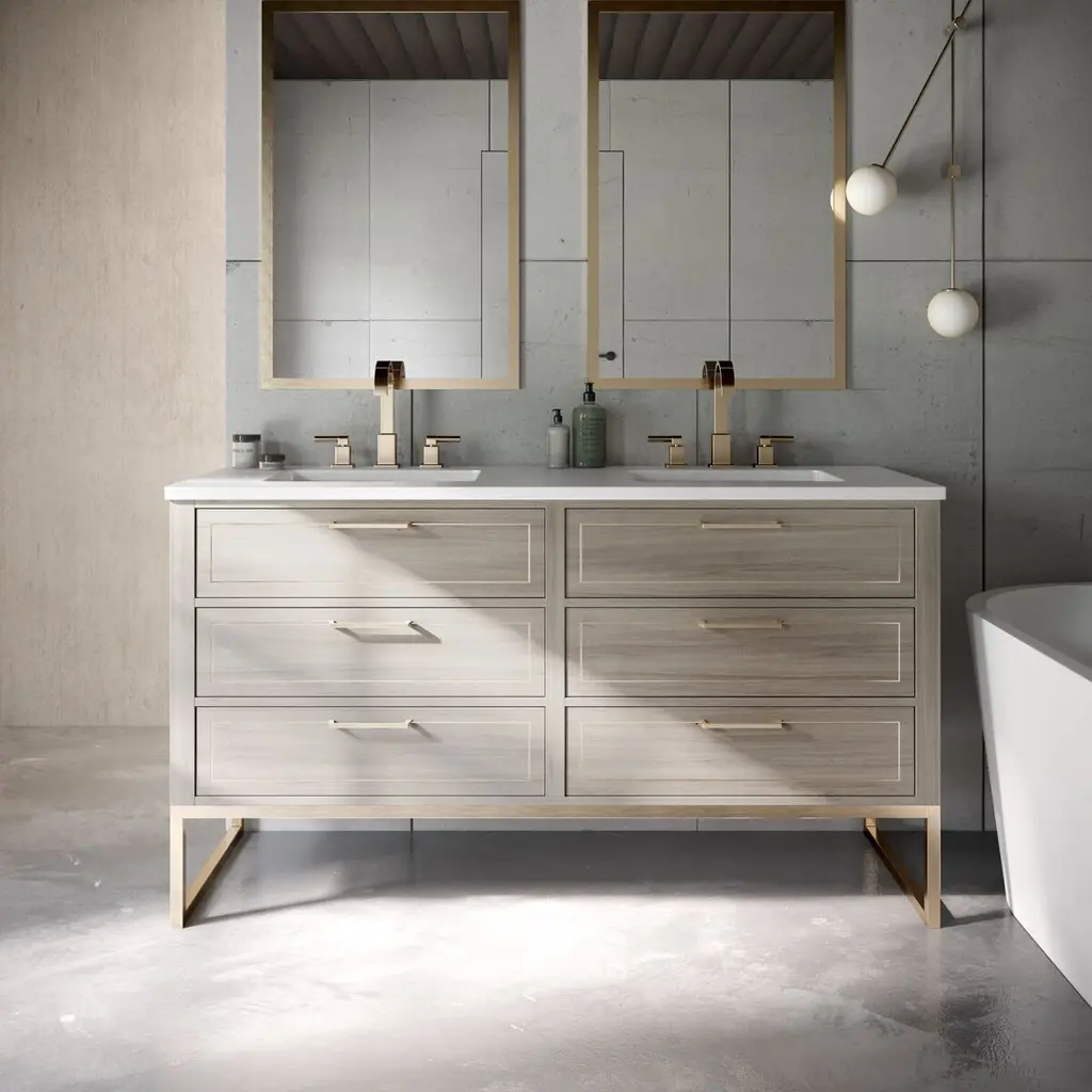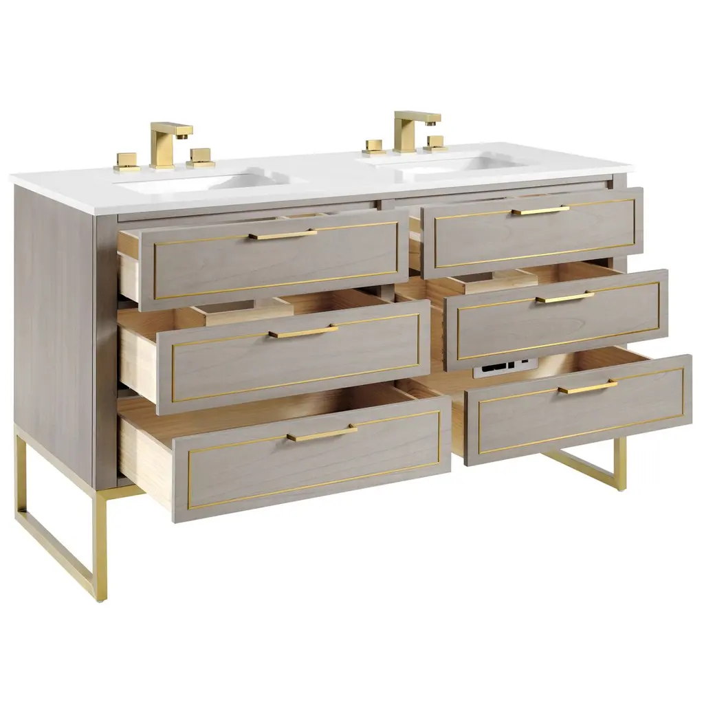 The Markham Bathroom Vanity collection exudes stately elegance, characterized by its clean lines and striking material contrasts. Each vanity features a three to six-drawer cabinet that traces every angle with urbane style and presence. Elevated on a sophisticated frame, the drawers are adorned with real wood veneer, offering a choice of finishes that enhance its refined appeal. Slim, soft-glide horizontal pulls and delicate metal inlays accentuate the facade, adding to its sophisticated charm. This collection is designed to bring a touch of luxury and timeless elegance to any bathroom setting. (Faucet not included)