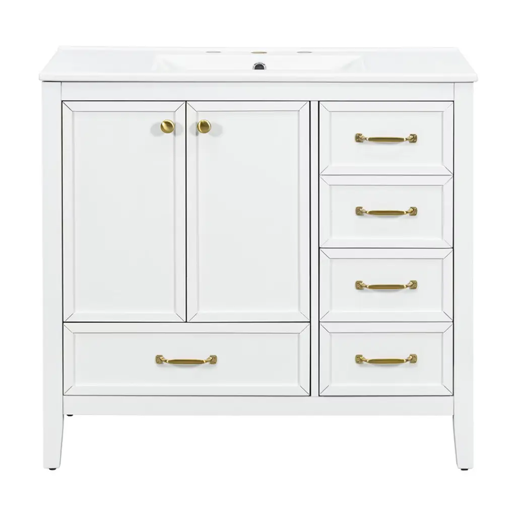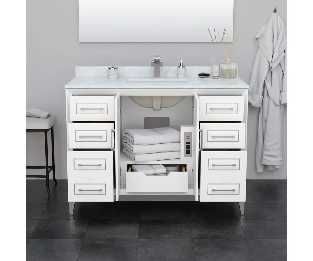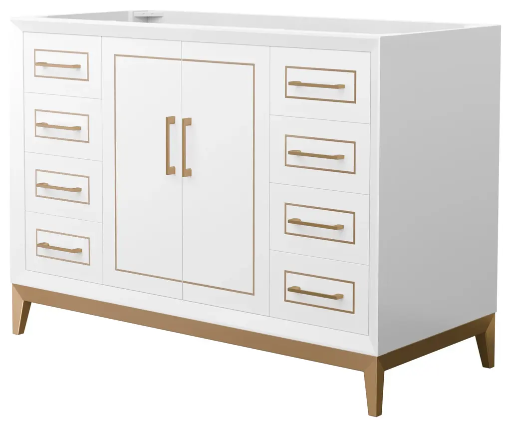 Classic luxurious elegance with clean and contemporary styling are the hallmarks of the beautiful Marlena vanity by Wyndham Collection, perfect for most home decors. Offered in a range of sizes, cabinet colors and metal trim options, you're sure to find the ideal fit for your home. There's plenty of storage space, soft-close doors and drawers, and the convenience of a 110V outlet and USB charger just inside the door. The vanity cabinet also features a cutout back for easy access to plumbing and electrical as well as interior drawers for additional organized storage. Manufacturing Model #: WCH515148SWZCXSXXMXXPRODUCT FEATURES:Constructed of environmentally friendly zero emissions plywood and veneer, engineered for durability and to prevent warping. Unique and striking contemporary floor standing designFully-extending undermount 3D adjustable soft-close drawer slides. Minimal assembly required. Deep Dovetailed drawersFully-extending undermount soft-close drawer slides. Concealed soft-close door hinges. Faucet(s) not includedMetal exterior hardware with satin bronze finish. Two (2) functional doors. Seven (7) functional drawersBack cutout saves install time and allows easy access to plumbing and electrical hookups. Integrated electrical outlet also comes with two USB ports. Plenty of storage and counter space. 2-Year Limited Warranty