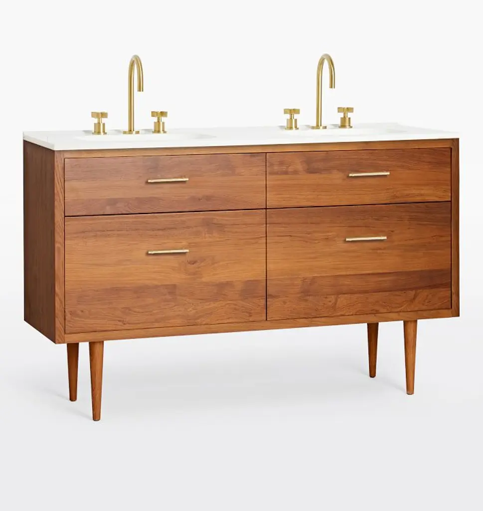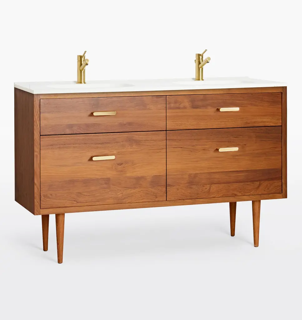 With plenty of storage and a classic Mid-Century design, our Marquam Double Vanity makes a sleek update to any bathroom. Crafted with high-quality, FSC-certified teak wood, generous drawers for easy storage, and a highly durable matte white solid surface countertop with your choice of widespread or monohole drilling. Complete your set with your choice of hardware, available in several styles and finishes. Details You'll Appreciate Streamlined Mid-Century-inspired design Generous drawers for easy storage Made with FSC®-certified (Forest Stewardship Council) wood. Your purchase helps support healthy forests and ecosystems worldwide for generations to come. Product Specifications FSC-certified teak console; solid surface countertop with integrated bowl Faucet sold separately Split top drawer to accommodate plumbing Console made in Indonesia Please note: Variations in color, shade, surface texture and size are natural characteristics of all our products and should be expected. Images shown are representative, but may not indicate all variations in these characteristics.