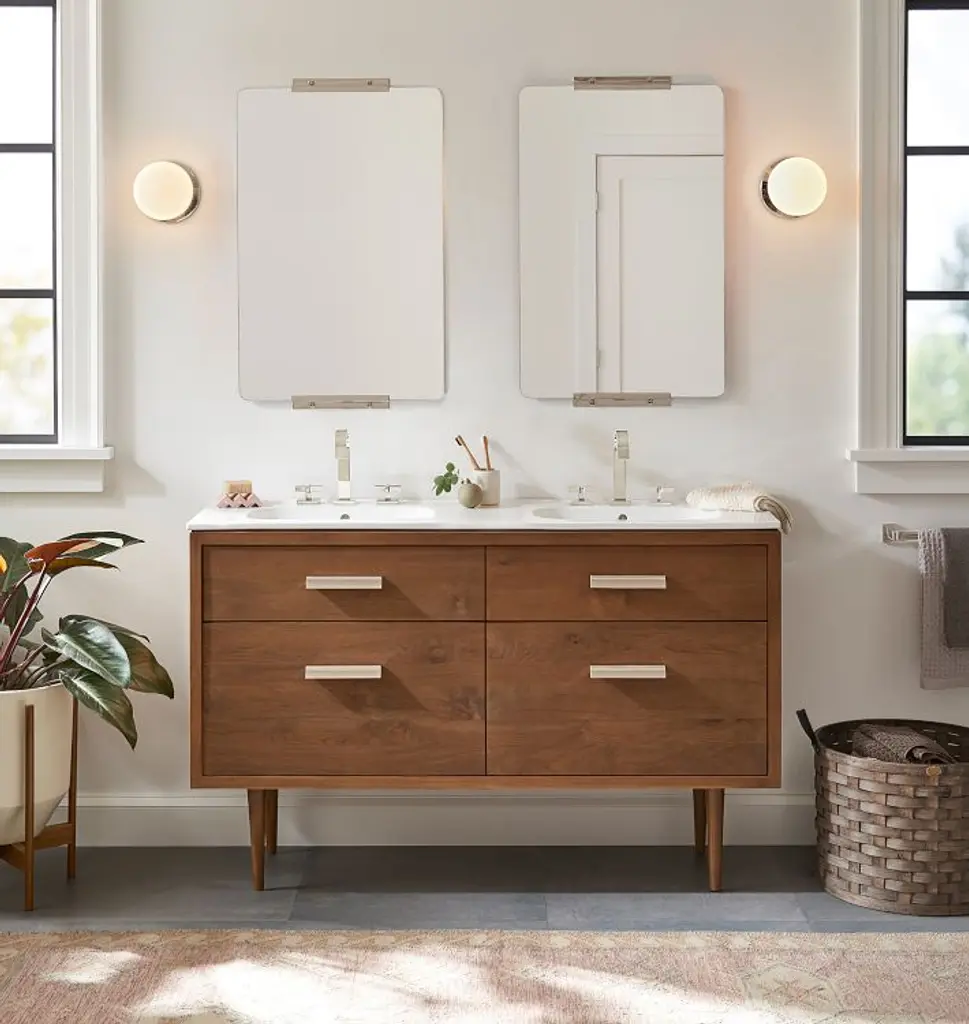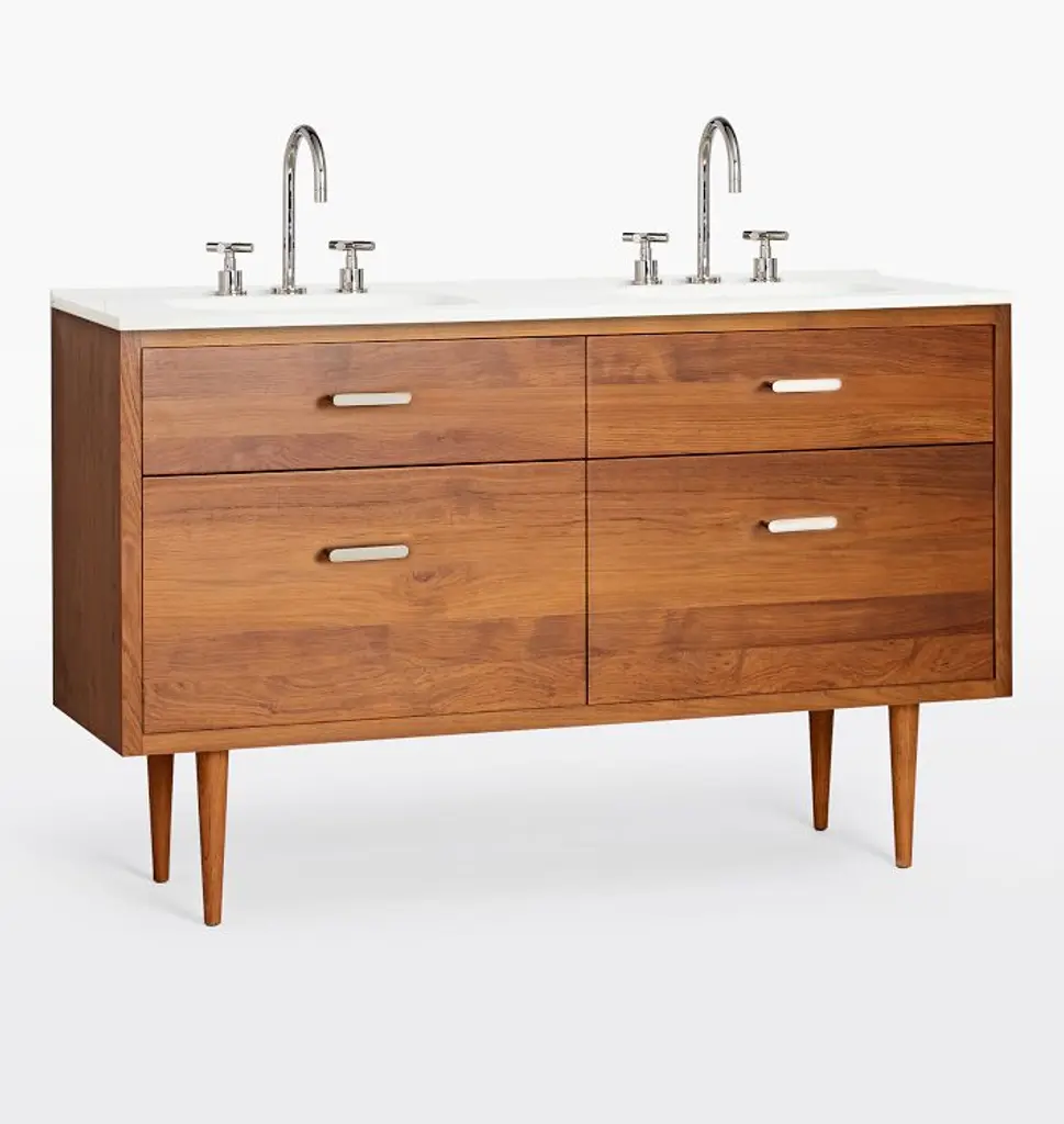 With plenty of storage and a classic Mid-Century design, our Marquam Double Vanity makes a sleek update to any bathroom. Crafted with high-quality, FSC-certified teak wood, generous drawers for easy storage, and a highly durable matte white solid surface countertop with your choice of widespread or monohole drilling. Complete your set with your choice of hardware, available in several styles and finishes. Details You'll Appreciate Streamlined Mid-Century-inspired design Generous drawers for easy storage Made with FSC®-certified (Forest Stewardship Council) wood. Your purchase helps support healthy forests and ecosystems worldwide for generations to come. Product Specifications FSC-certified teak console; solid surface countertop with integrated bowl Faucet sold separately Split top drawer to accommodate plumbing Console made in Indonesia Please note: Variations in color, shade, surface texture and size are natural characteristics of all our products and should be expected. Images shown are representative, but may not indicate all variations in these characteristics.