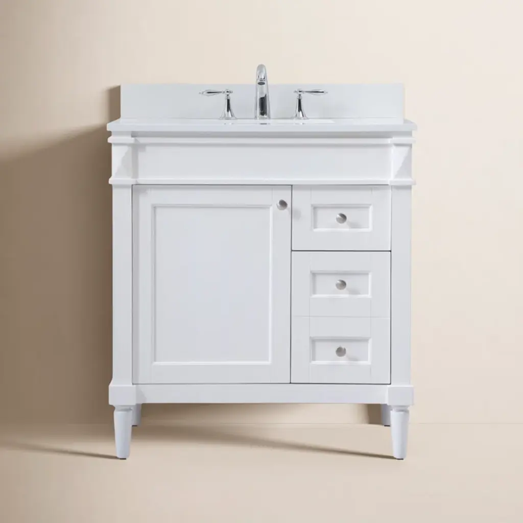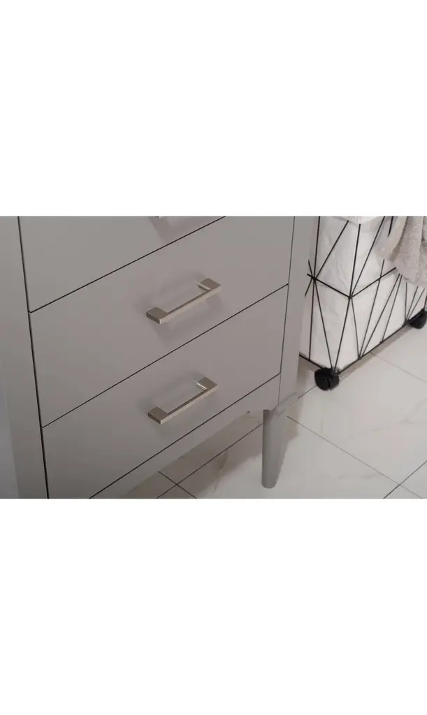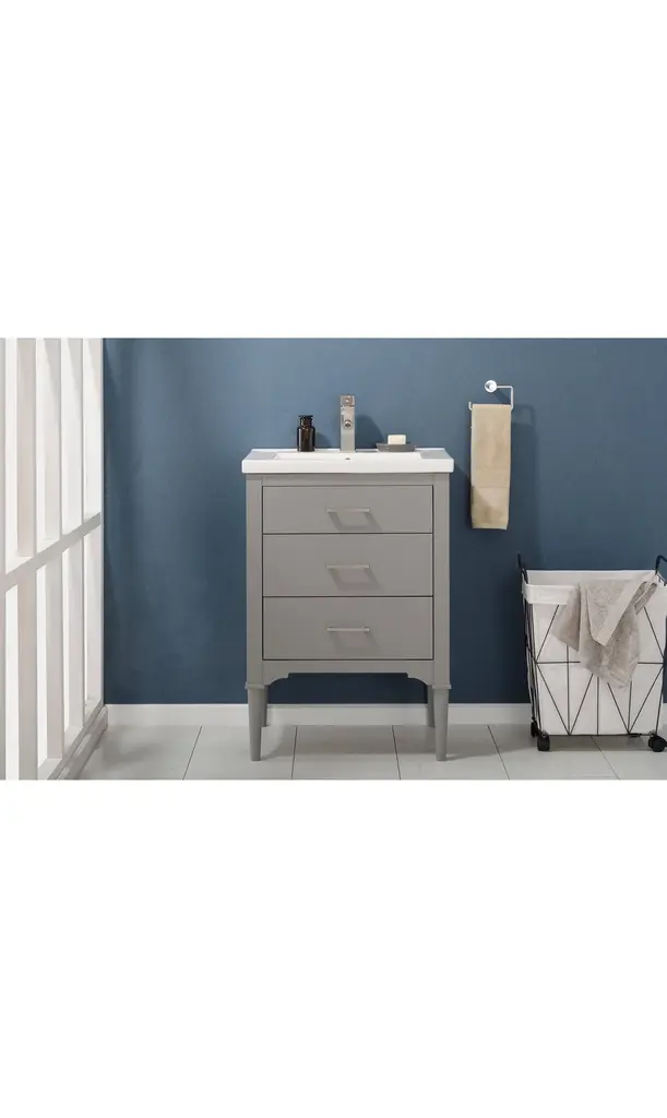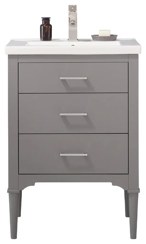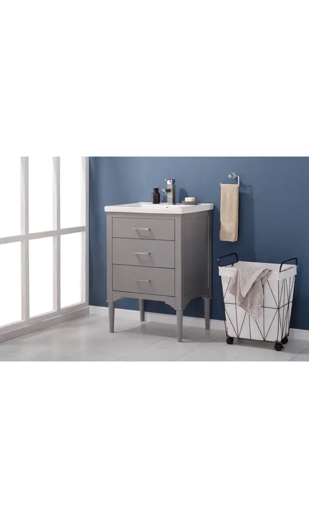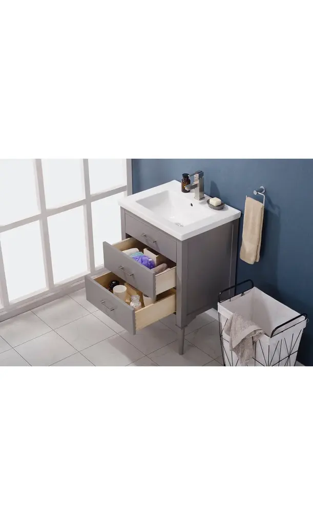 The Mason 24" Single Sink Vanity by Design Element provides the perfect finishing touch to your bathroom remodel project. Constructed of solid hardwood, this vanity will maintain its beauty and functionality year after year. The porcelain countertop and integrated sink with overflow perfectly matches the styling of the cabinet, and is extremely simple to maintain. Each of the 2 fully functional drawers are constructed with dovetail joints and soft close glides. The included satin nickel hardware perfectly complements the gray cabinet. Faucet and drain are not included.Number sink: One SinkHeight: 34 to 35 InchesWidth: 20 to 24 InchesDepth: 16 to 18 InchesFinish: GrayType vanity mount: FreestandingFor sink: IntegratedFeatures bathroom vanity: Hardware IncludedFeatures bathroom vanity: Soft-Close DrawersWith sink material: CeramicNumber drawers: 2Number Doors: 0Material: WoodMaterial tabletop: CeramicVanity type: Vanity with Top