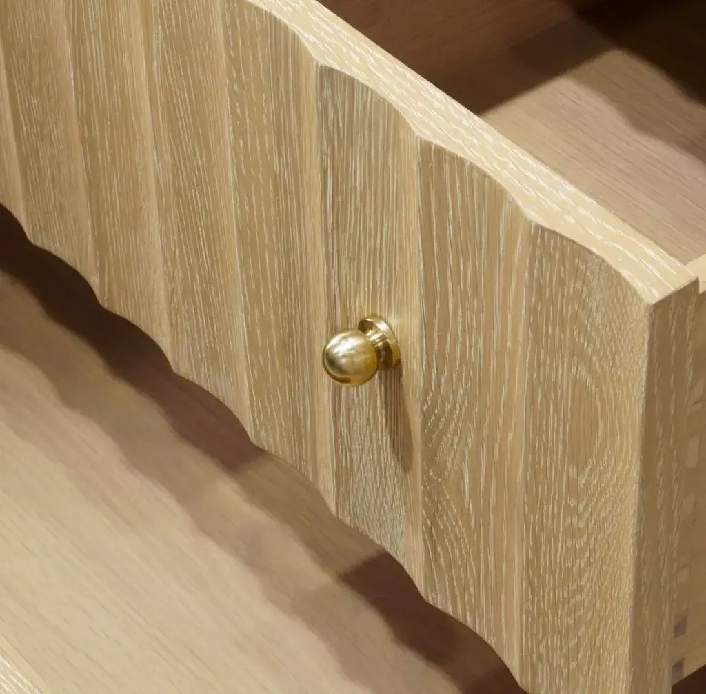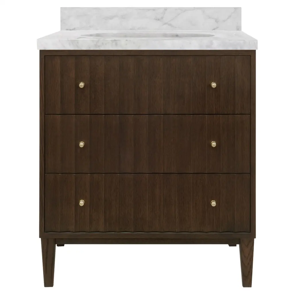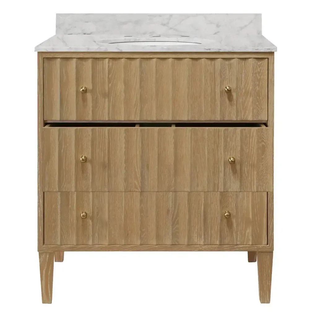 Matthew Izzo Home Odin Fluted Cerused Oak, Two Drawer, Single Sink Bathroom Vanity - Carrara Marble Top, Porcelain Sink, Brass Hardware
