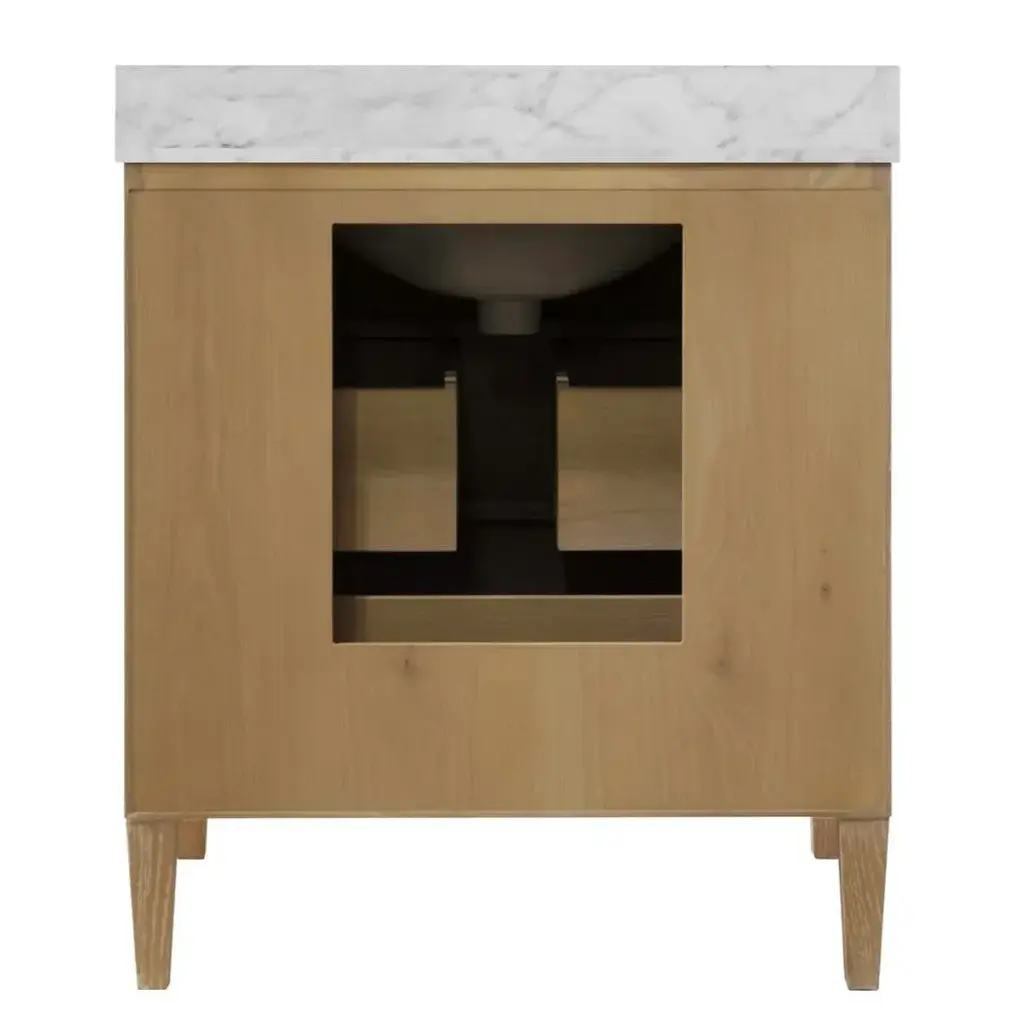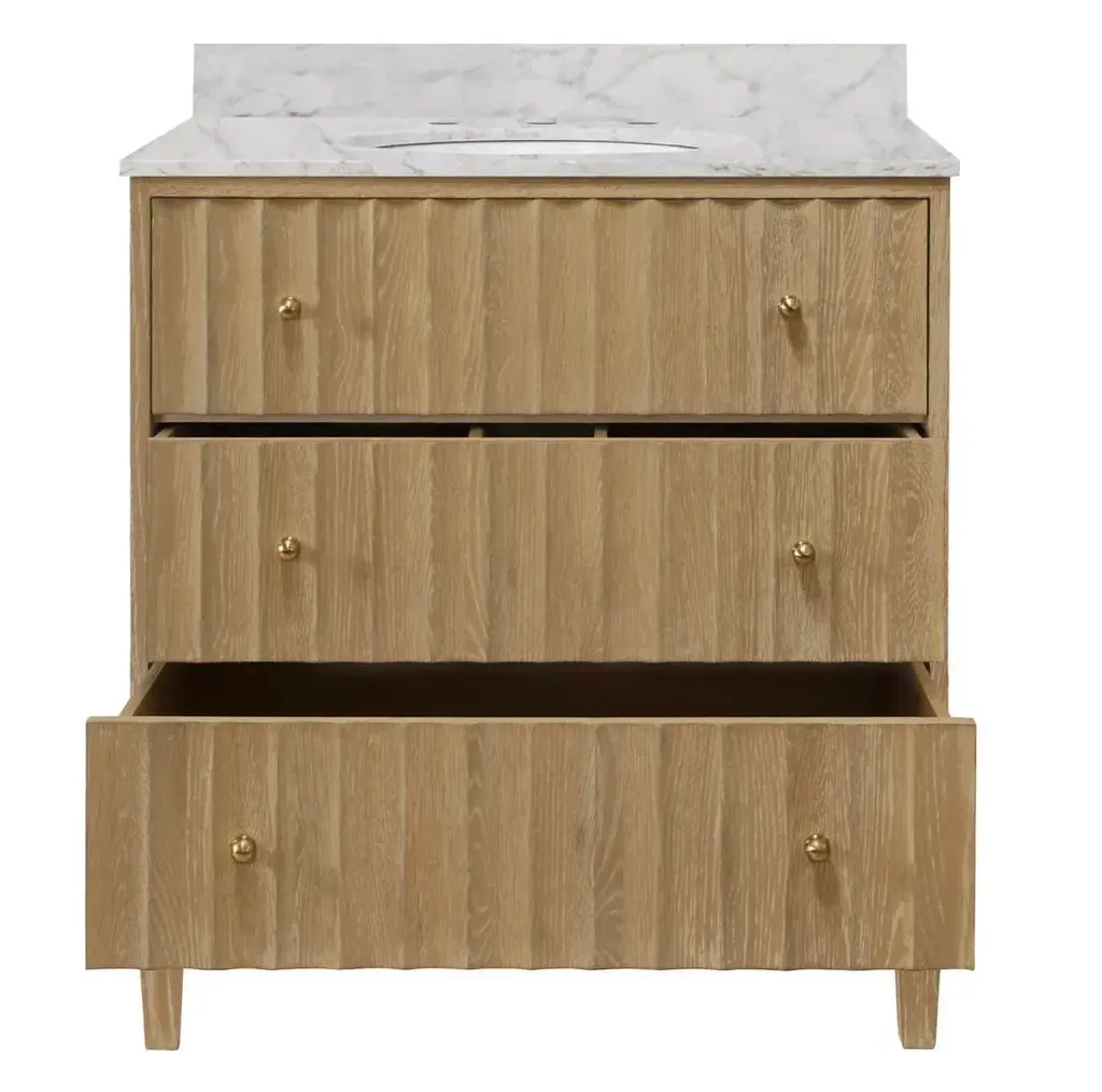 Offering both Ancient Greek details and an organic finish, the Odin CO will transform your bath or powder room into a haven! Crowning the natural cerused oak base is a white Carrara marble top seamlessly integrated with an attached porcelain sink basin. Employ the polished brass knobs to gently open and experience the smooth functionality of the soft-close feature on each of the two working drawers. BACKSPLASH IS 4" HIGH, FULL WIDTH OF PRODUCT. INCLUDED BUT NOT ATTACHED FOR USE WITH 8" WIDESPREAD FAUCET (NOT INCLUDED) *Wood has natural variations and may differ slightly between panels. 30.5" W X 34.25" H X 21.63" D