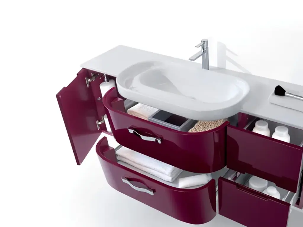 METROPOLIS 10 by Lasa Idea is a washbasin cabinet.Finish: G74 aubergine red glossy lacquered - Top: glossy TecnorilMetropolis, a collection based on the contemporary architecture, on rigorous volumes, with alternation of full and empty ones , played by natural tonalities, refined chromatisms or purity of absolute white. In addition to the new Metropolis washbasin top made of matt or gloss Tecnoril, the collection also proposes a wide range of counter top washbasins made of ceramic or resin, incorporate washbasin tops made of crystal or Tecnoril, and tops made of wood, marble or with lacquered finishes. Metropolis is characterised by extensive modularity and the possibility to work with suspended base units in different heights or units fitted with feet. The washbasin units are available in depths of 40 cm and 51 cm. 40 standard matt or gloss lacquered colours, also available on open-pore oak, as well as all the RAL lacquer shades make it possible to find the colour for every room. 20 different wood finishes are available on multilayer veneered with real wood.