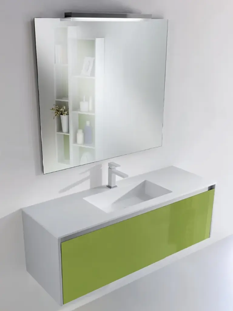 METROPOLIS 21 by Lasa Idea is a washbasin cabinet.Finishing: matt white lacquered M86 - matt acid green M85 - matt Tecnoril top.Metropolis, a collection based on the contemporary architecture, on rigorous volumes, with alternation of full and empty ones , played by natural tonalities, refined chromatisms or purity of absolute white. In addition to the new Metropolis washbasin top made of matt or gloss Tecnoril, the collection also proposes a wide range of counter top washbasins made of ceramic or resin, incorporate washbasin tops made of crystal or Tecnoril, and tops made of wood, marble or with lacquered finishes. Metropolis is characterised by extensive modularity and the possibility to work with suspended base units in different heights or units fitted with feet. The washbasin units are available in depths of 40 cm and 51 cm. 40 standard matt or gloss lacquered colours, also available on open-pore oak, as well as all the RAL lacquer shades make it possible to find the colour for every room. 20 different wood finishes are available on multilayer veneered with real wood.