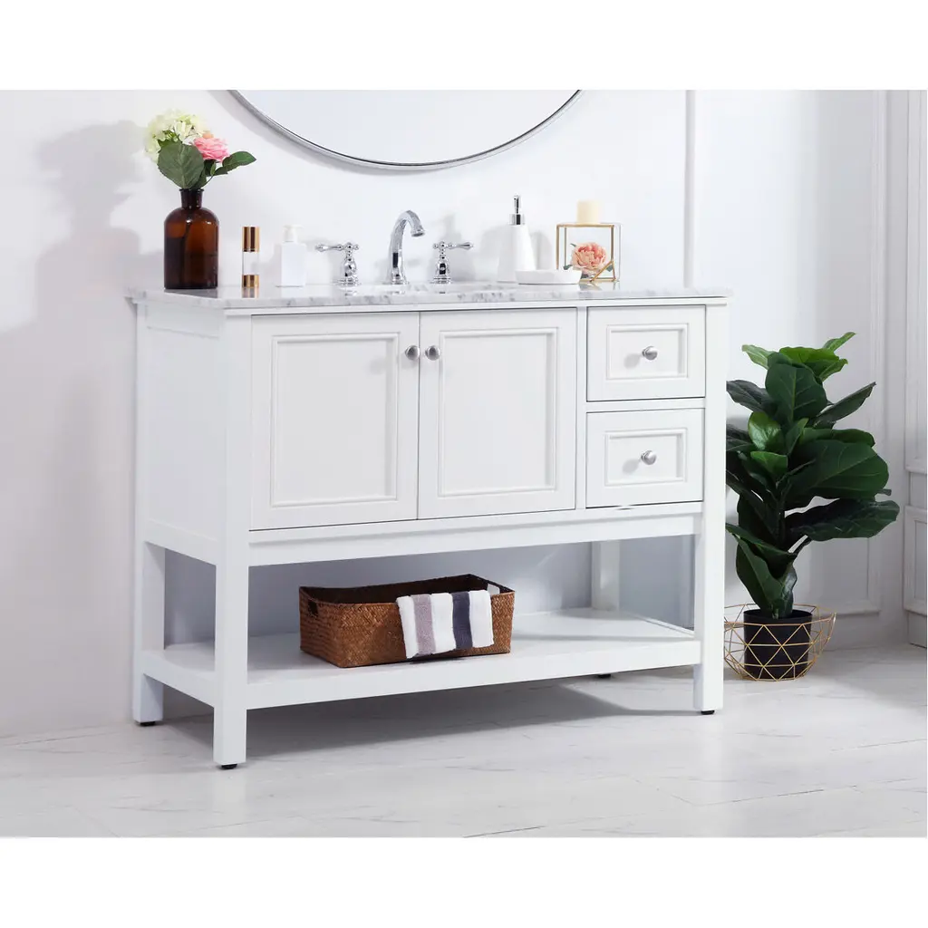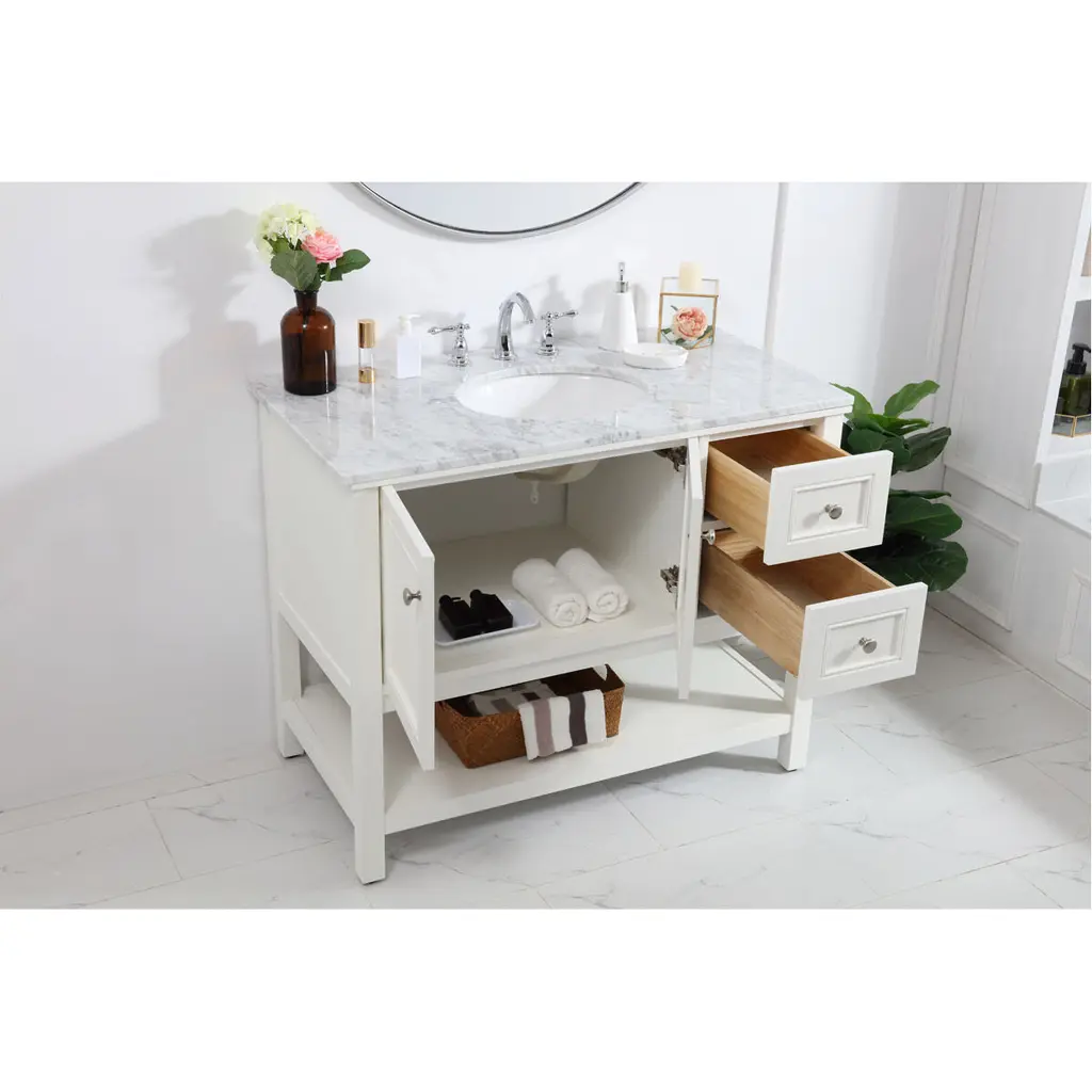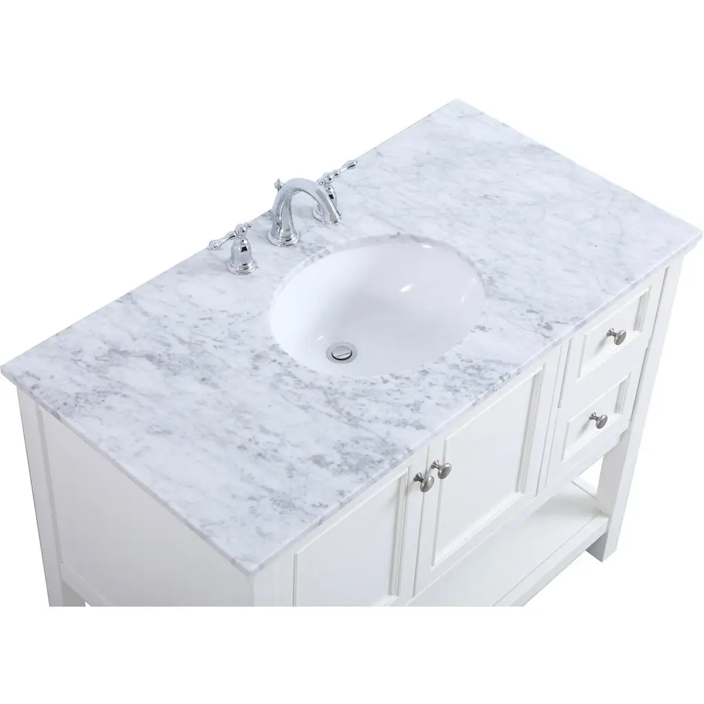 Create a refined and relaxing bath space with this contemporary design vanity, presenting its simplicity and clean straight lines in a minimalist appeal. The 42 white vanity provides ample storage within its 2 soft-close drawers, double door and a open shelf base, accentuated with gleaming chrome hardware. Rounding out the design is a luxurious Itallian Carrara white marble counter top and a white porcelain under-mount oval sink.