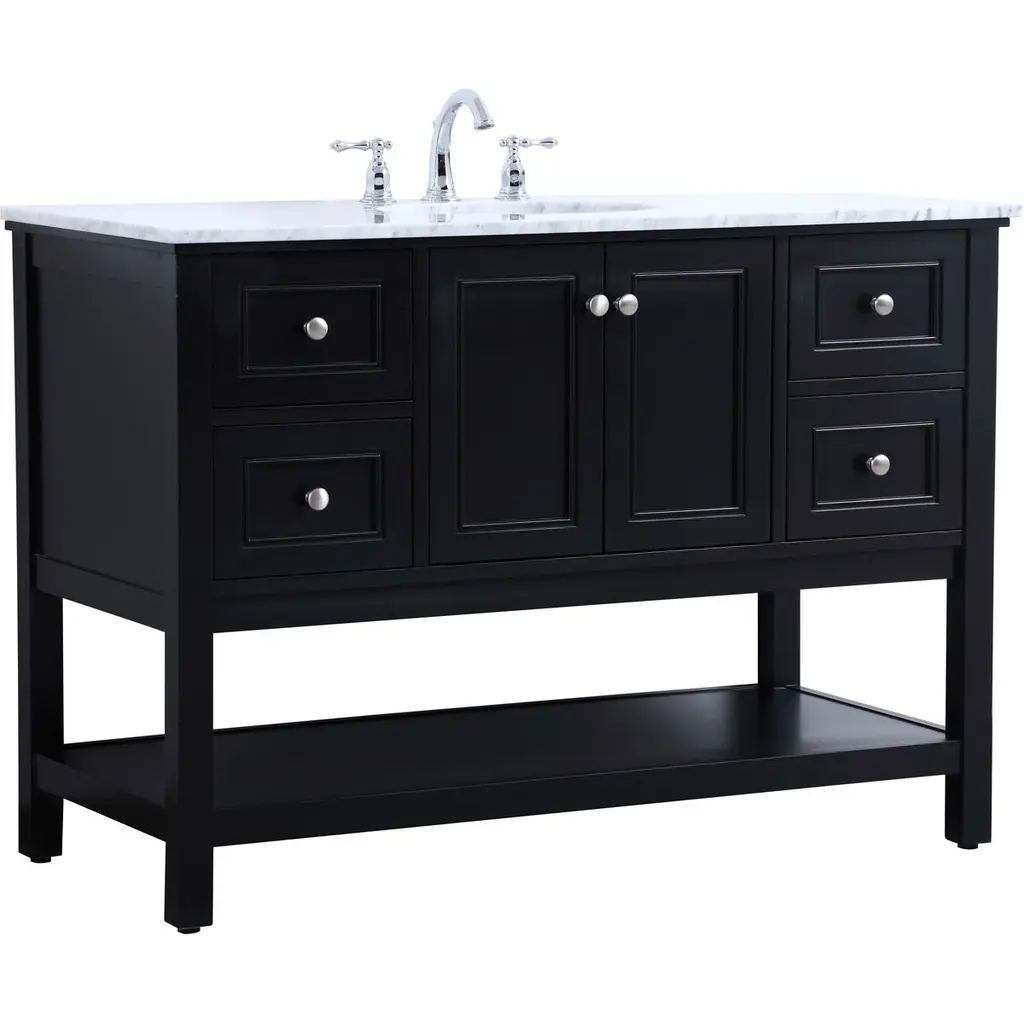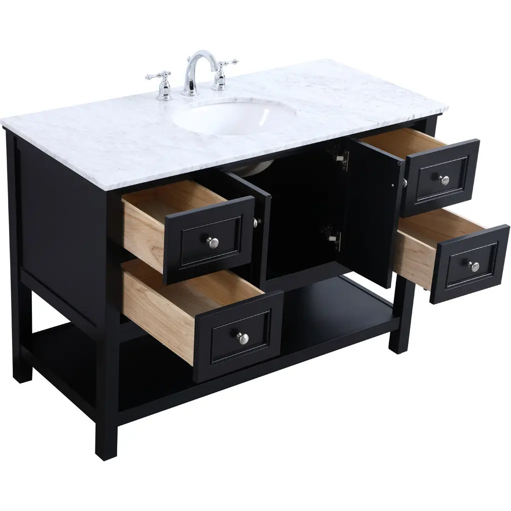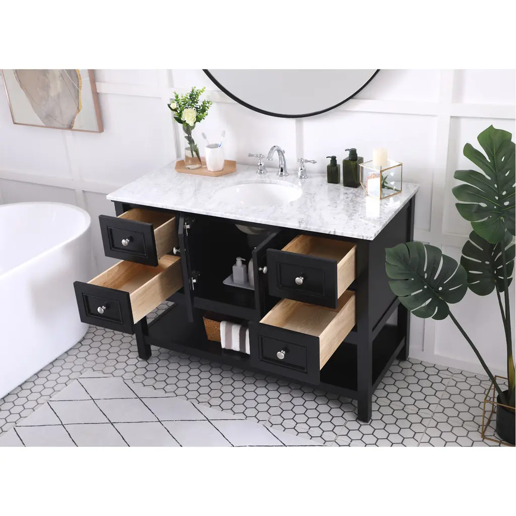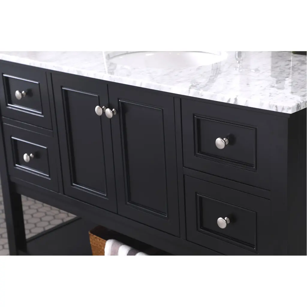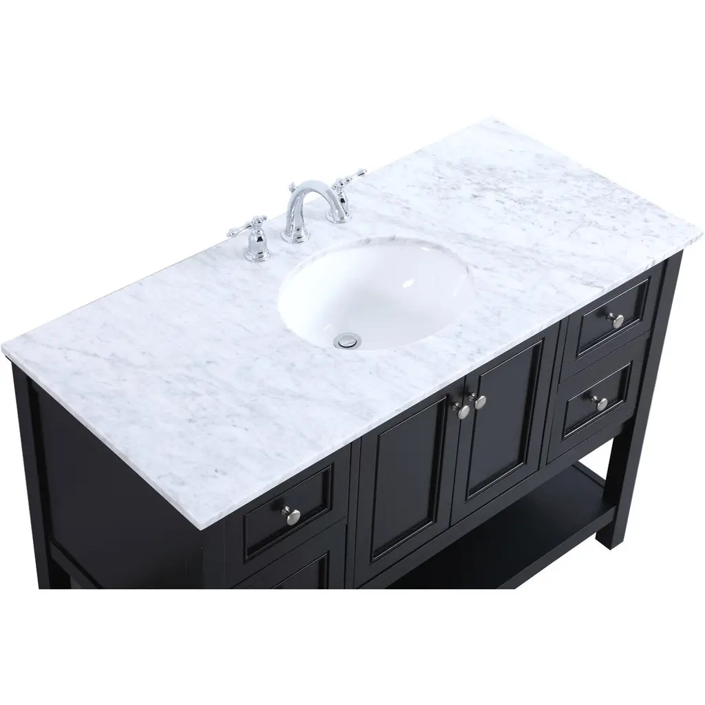 Create a refined and relaxing bath space with this contemporary design vanity, presenting its simplicity and clean straight lines in a minimalist appeal. This 48 freestanding vanity, crafted of solid poplar wood in a black finish, provides ample storage within its double center doors and 4 side drawers, all equipped with soft closing mechanism and accentuated with gleaming chrome hardware. Rounding out the design is a luxurious Itallian Carrara white marble countertop and white porcelain under-mount oval sink.
