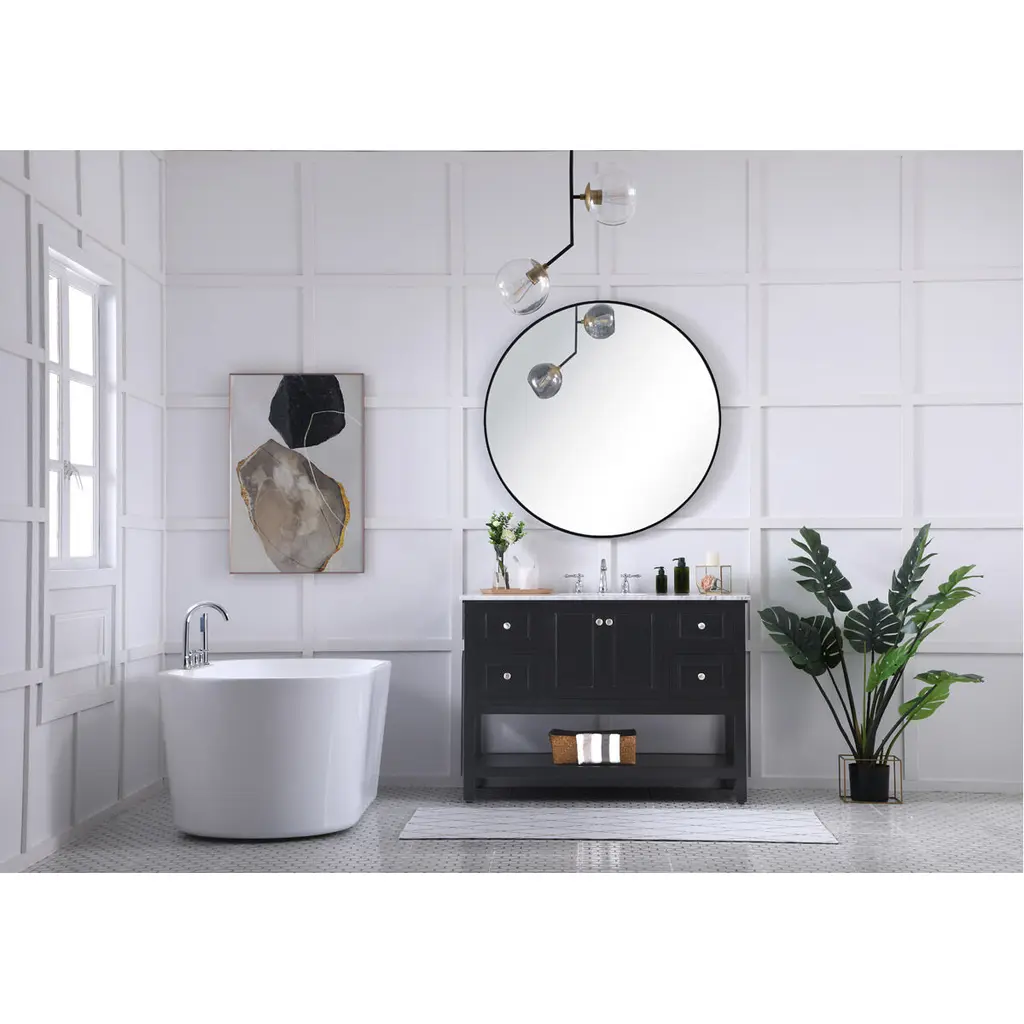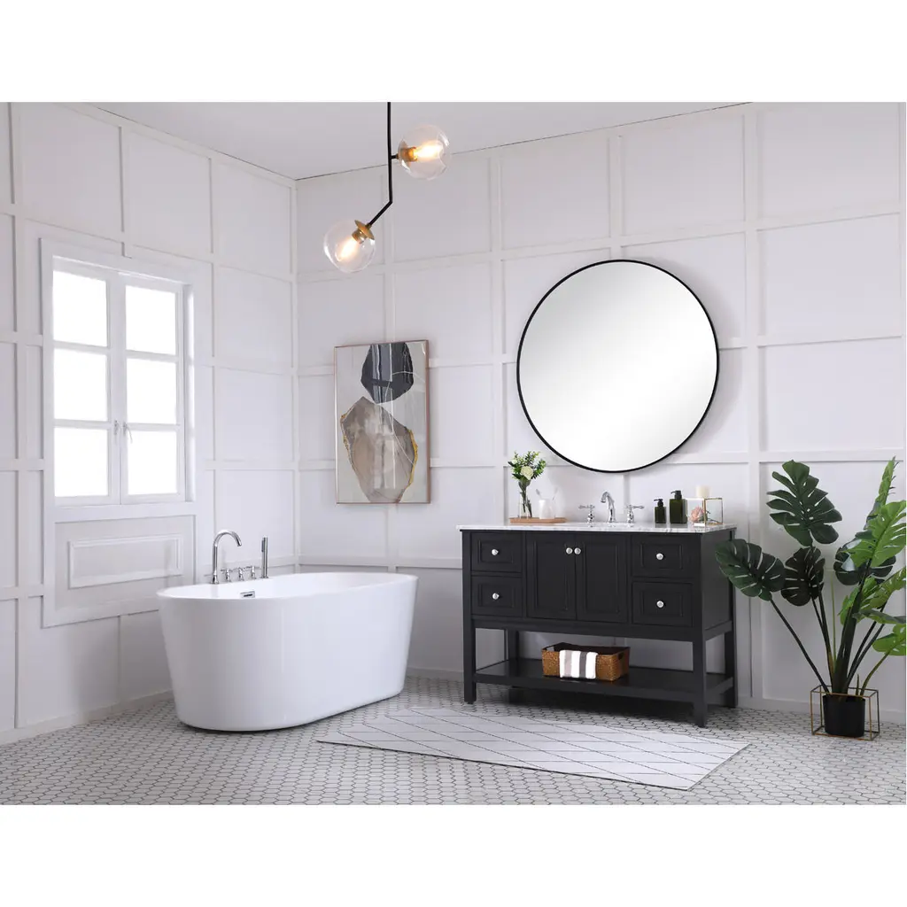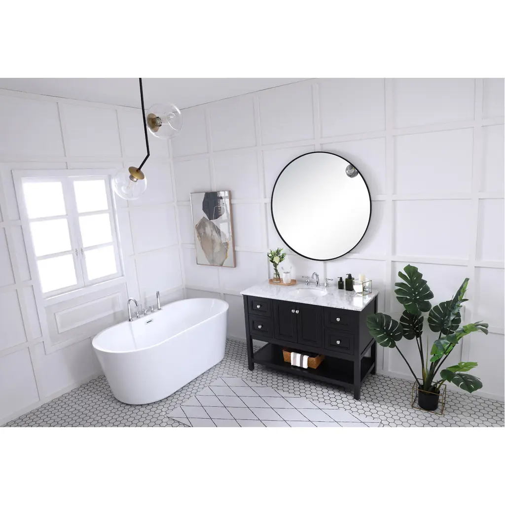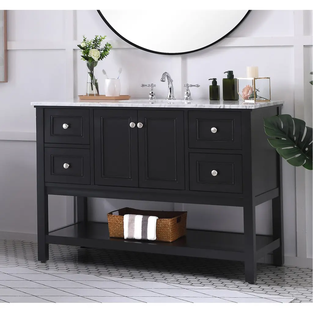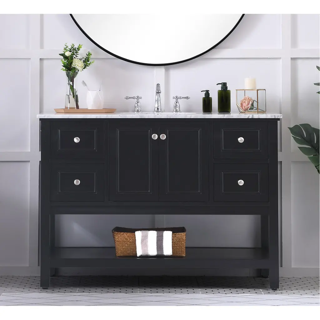 Create a refined and relaxing bath space with this contemporary design vanity, presenting its simplicity and clean straight lines in a minimalist appeal. This 48 freestanding vanity, crafted of solid poplar wood in a black finish, provides ample storage within its double center doors and 4 side drawers, all equipped with soft closing mechanism and accentuated with gleaming chrome hardware. Rounding out the design is a luxurious Itallian Carrara white marble countertop and white porcelain under-mount oval sink.