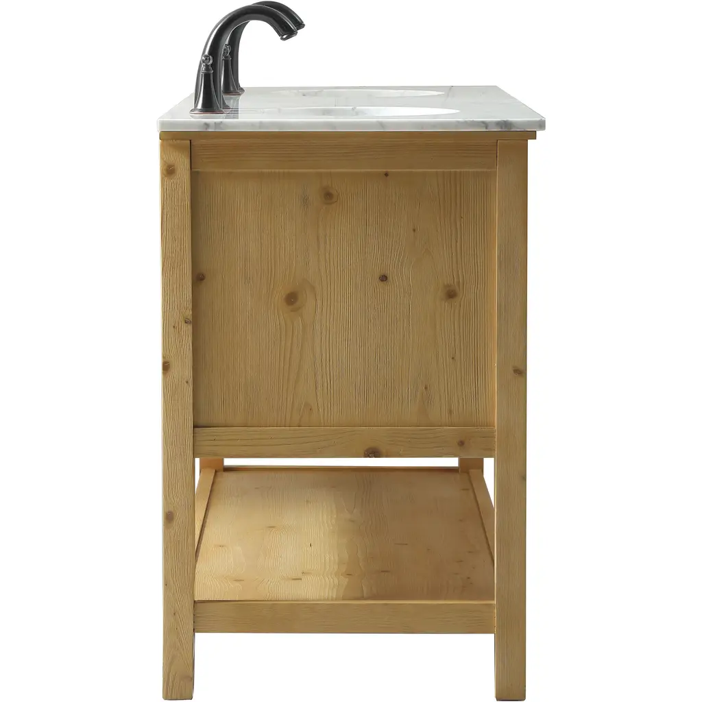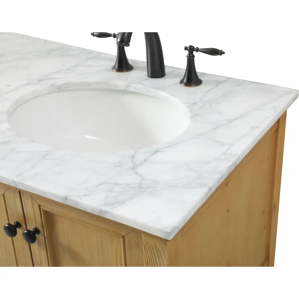 Clean lines and classic form can truly add a fresh look to your bathroom or powder room. This vanity, complemented by round hardware, will surely charm you with its confident style and subtle charisma. This vanity can store all of your bathroom toiletries, from extra towels to make up essentials. The vanity is crowned with carrara white marble and includes a porcelain undermount sink--adding both function and form that will truly amaze.