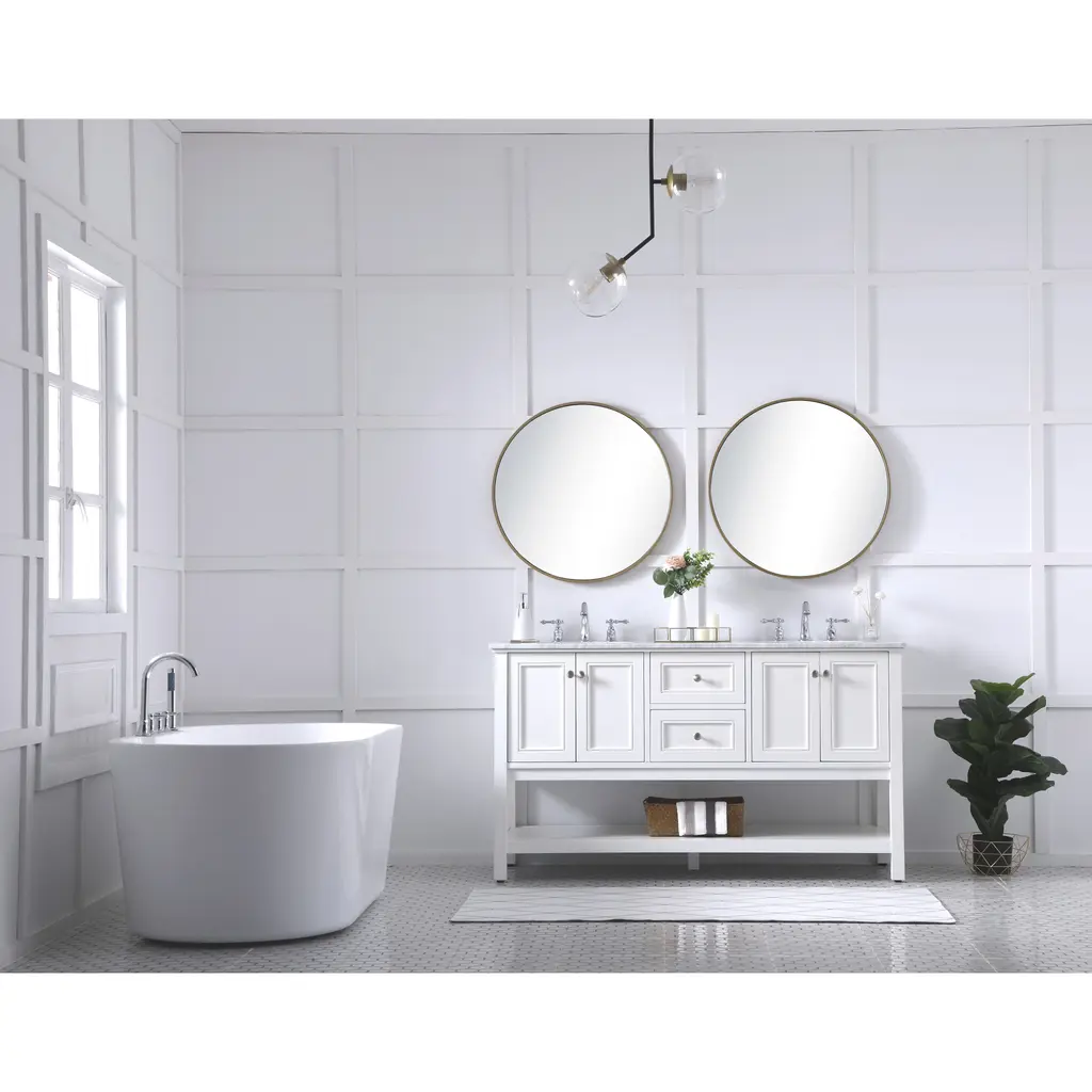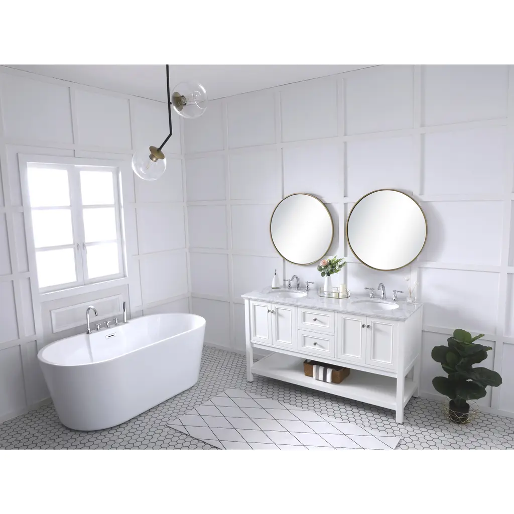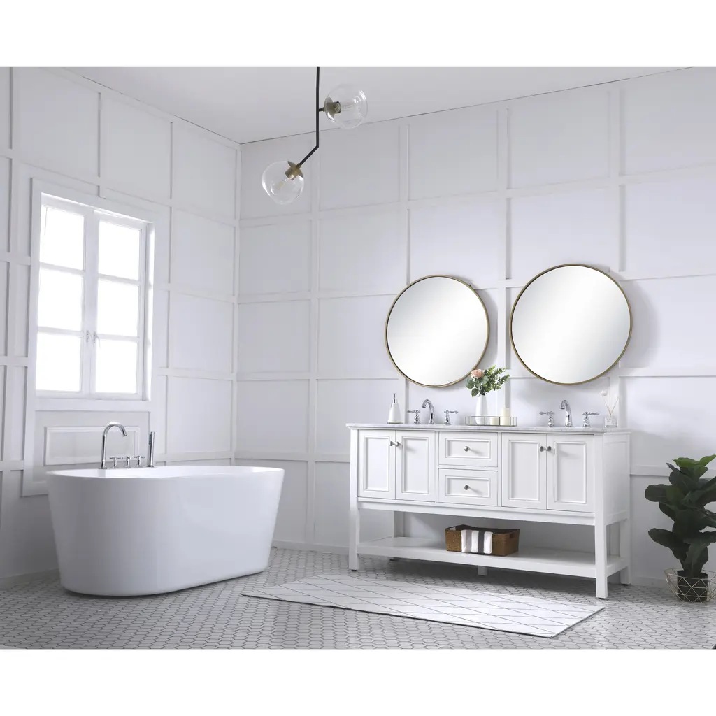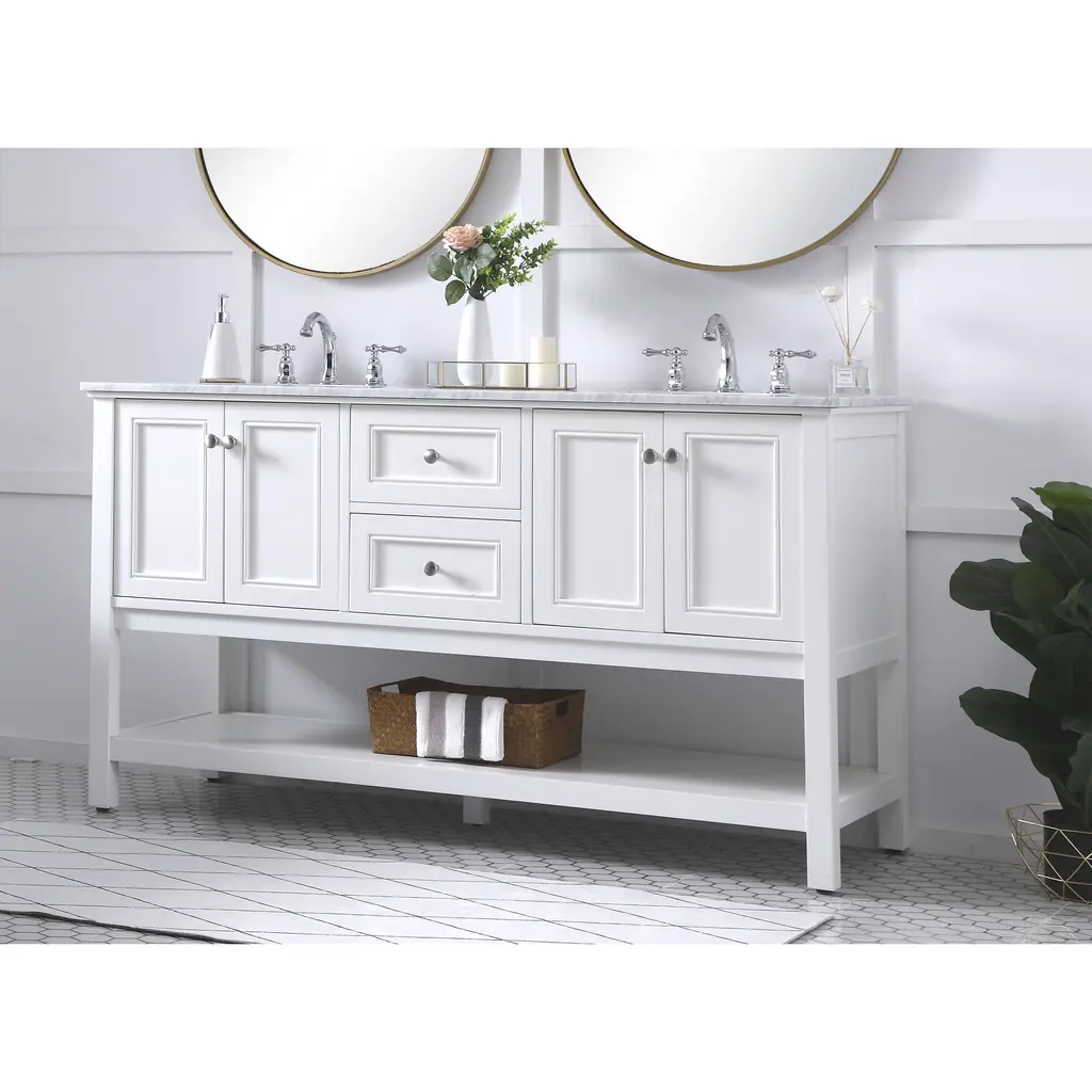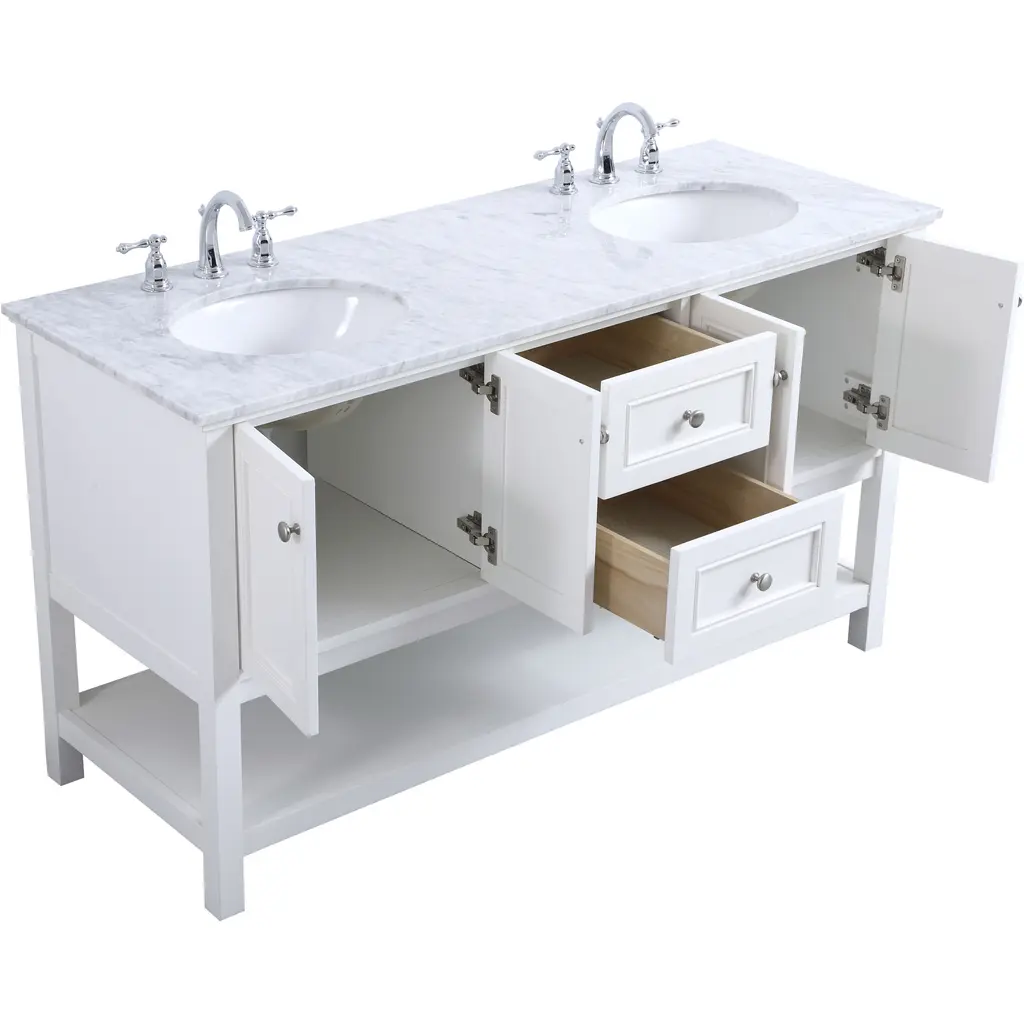 Create a refined and relaxing bath space with this contemporary design vanity, presenting its simplicity and clean straight lines in a minimalist appeal. This 60 freestanding white vanity, crafted of solid poplar wood, provides ample storage within its double center drawers and 4 side doors, all equipped with soft closing mechanism and accentuated with gleaming chrome hardware. Rounding out the design is a luxurious Itallian Carrara white marble countertop and double white porcelain under-mount oval sink.