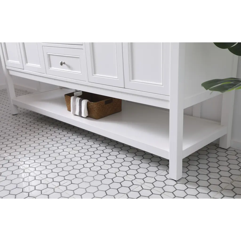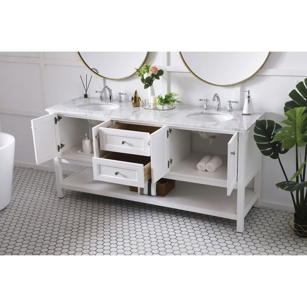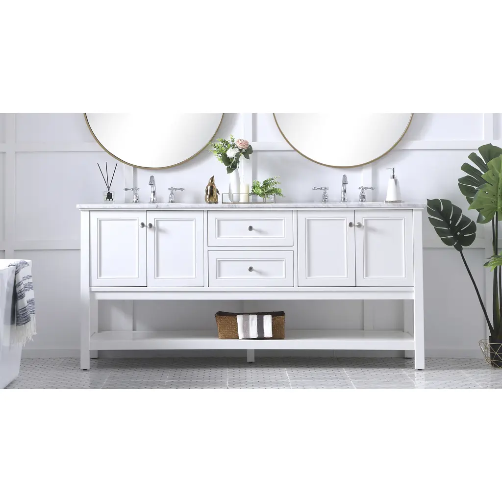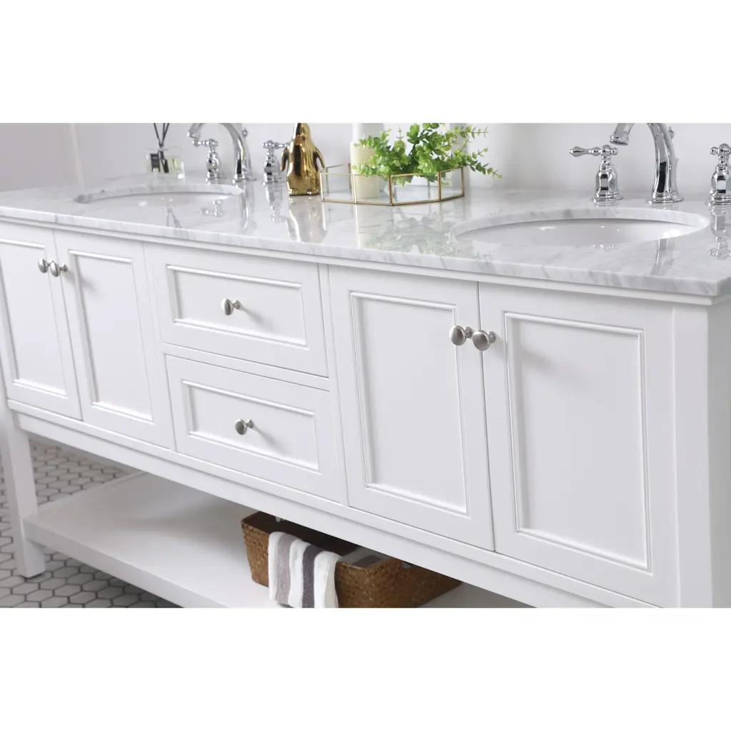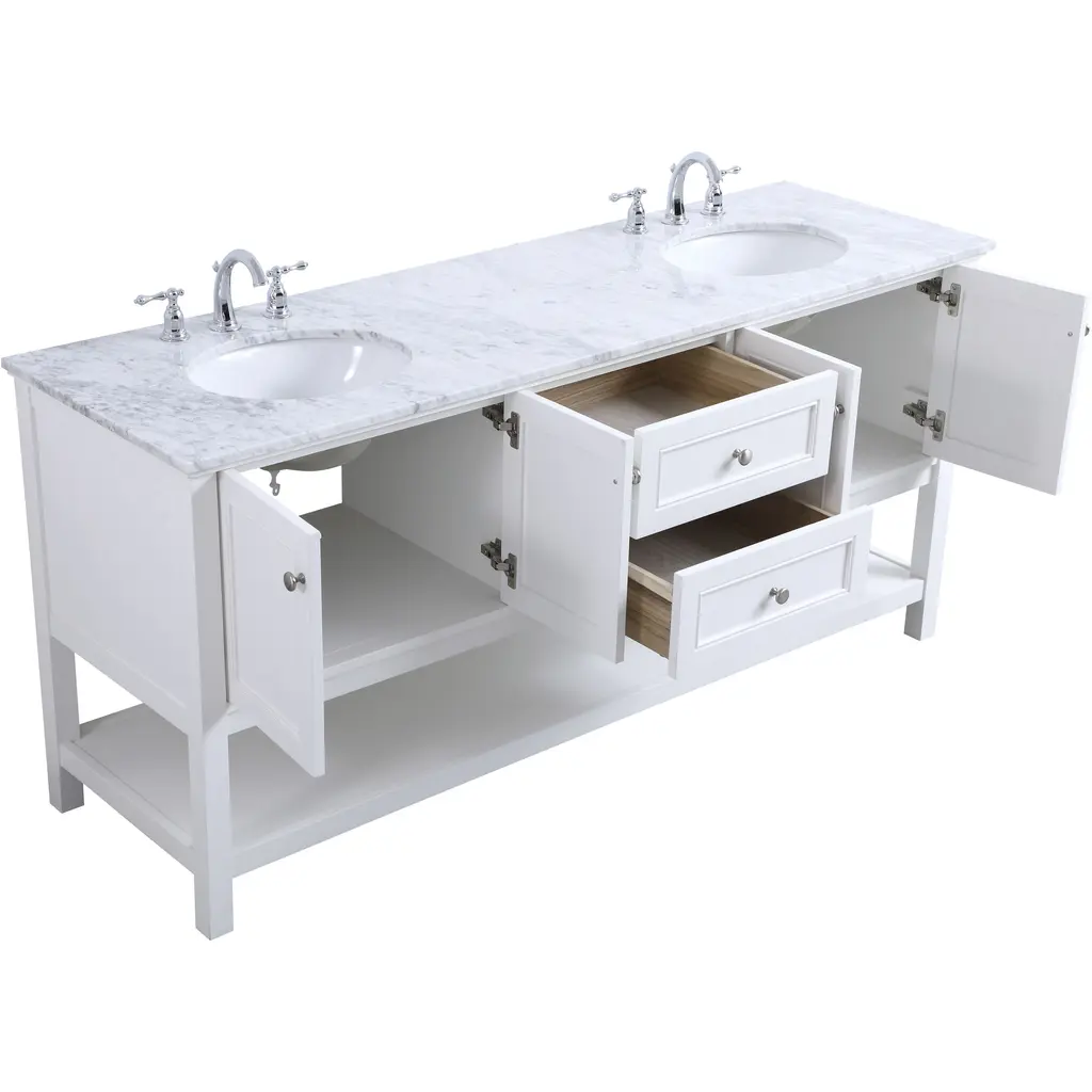 Create a refined and relaxing bath space with this contemporary design vanity, presenting its simplicity and clean straight lines in a minimalist appeal. This 72 freestanding vanity, crafted of solid poplar wood in white finish, provides ample storage within its double center drawers and 4 side doors, all equipped with soft closing mechanism and accentuated with gleaming chrome hardware. Rounding out the design is a luxurious Itallian Carrara white marble countertop and double white porcelain under-mount oval sink.