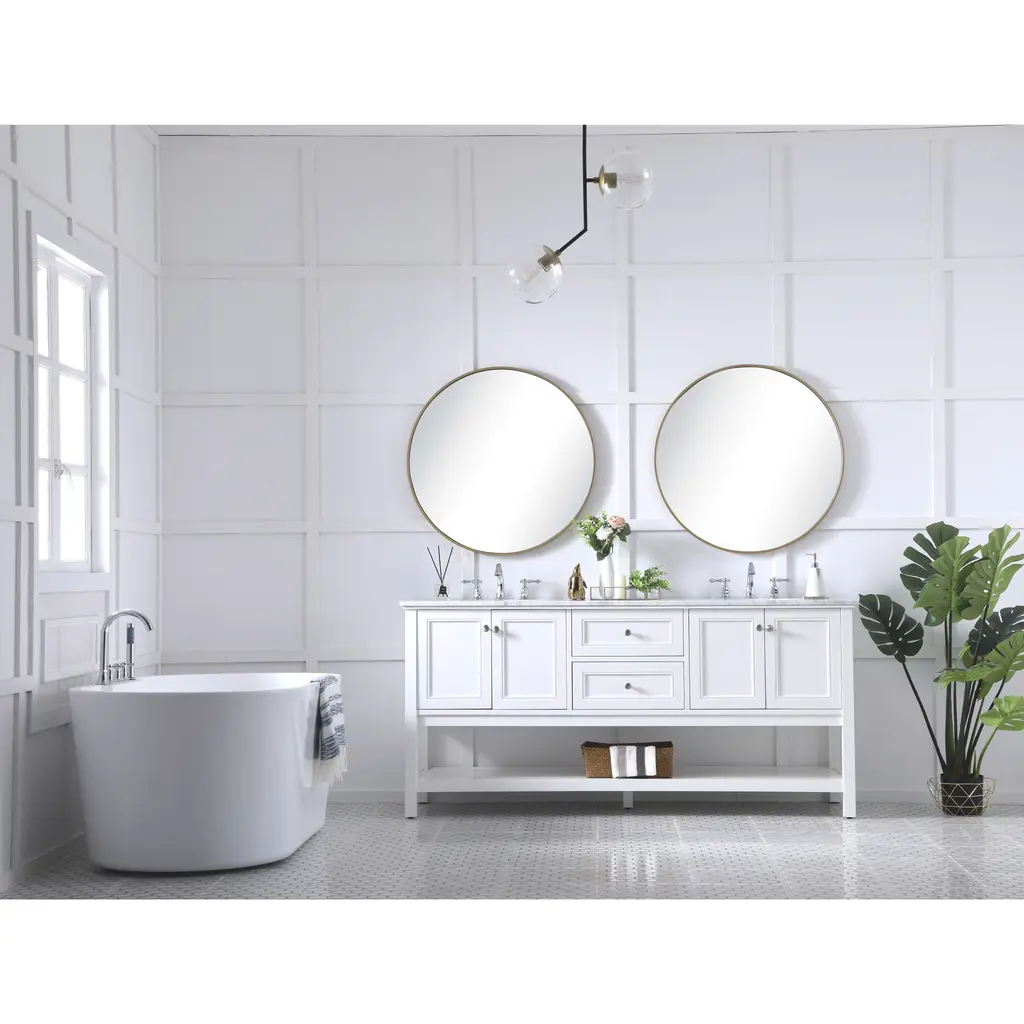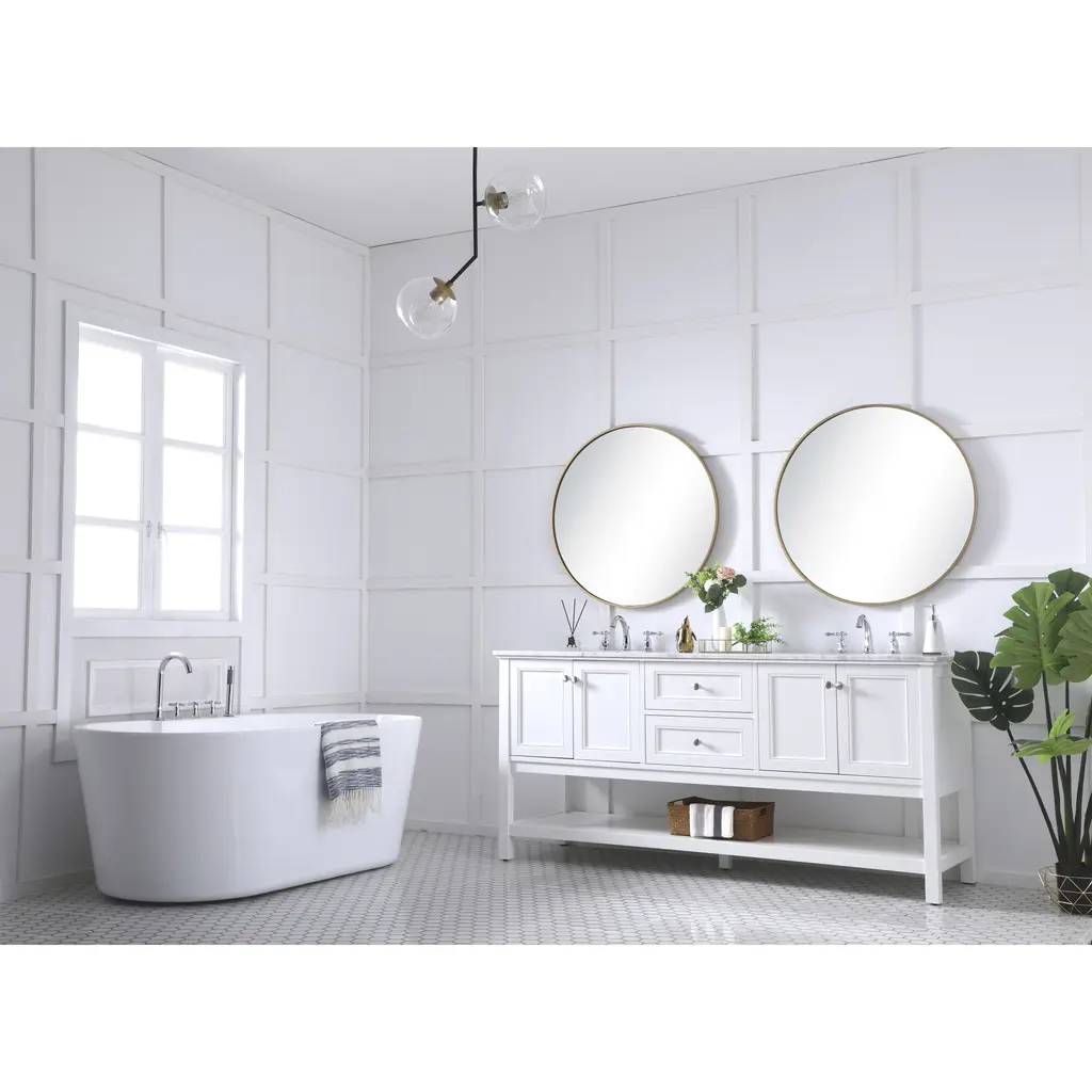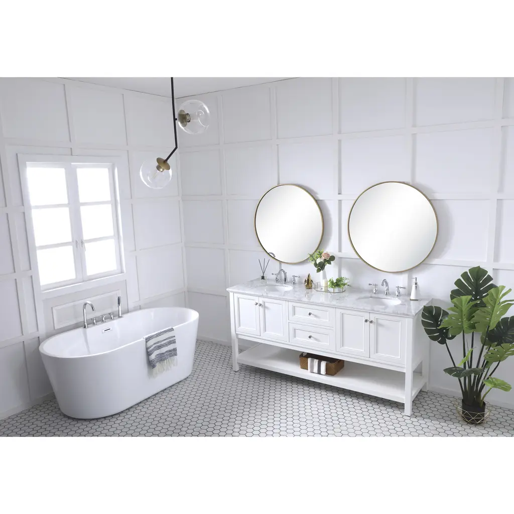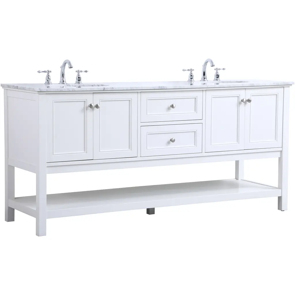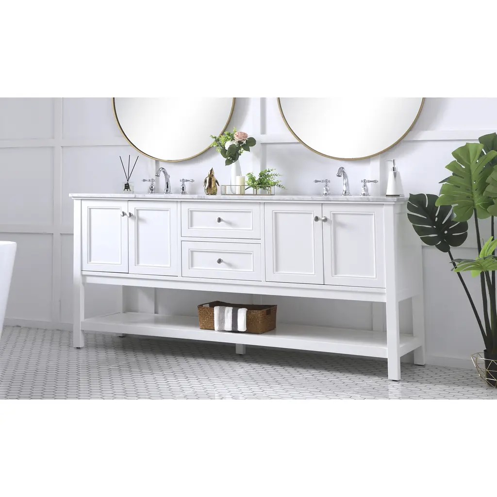 Create a refined and relaxing bath space with this contemporary design vanity, presenting its simplicity and clean straight lines in a minimalist appeal. This 72 freestanding vanity, crafted of solid poplar wood in white finish, provides ample storage within its double center drawers and 4 side doors, all equipped with soft closing mechanism and accentuated with gleaming chrome hardware. Rounding out the design is a luxurious Itallian Carrara white marble countertop and double white porcelain under-mount oval sink.
