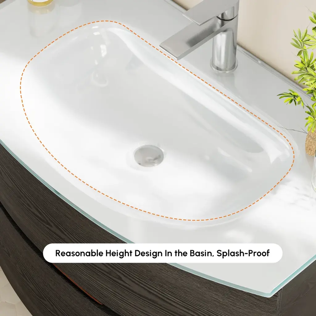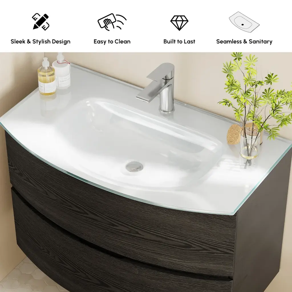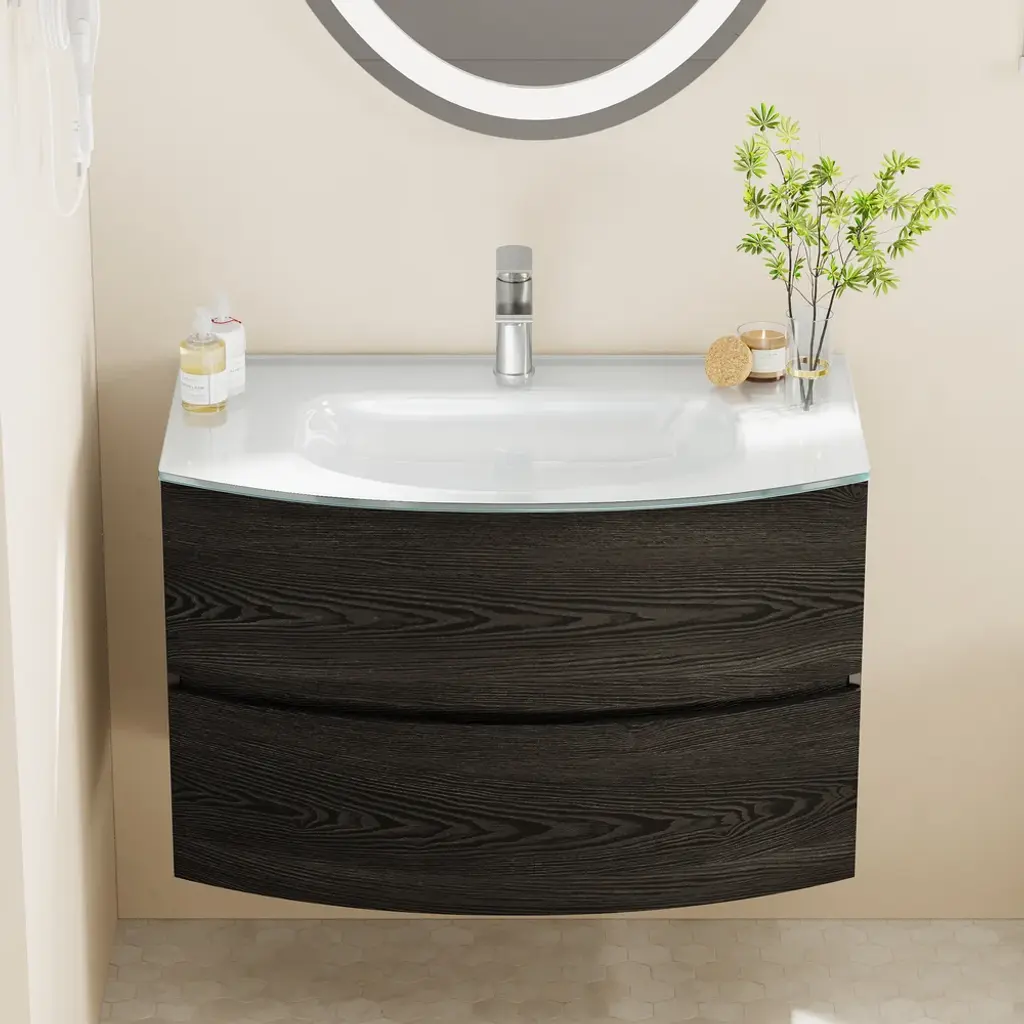 This modern bathroom vanity features smooth, soft curves, a practical double drawer design and a refined, premium wood finish. Equipped with an integrated glass basin, the seamless design is easy to clean and the material is durable. The wall-mounted design is both beautiful and practical, saving floor space and helping to create a neat and orderly indoor space.