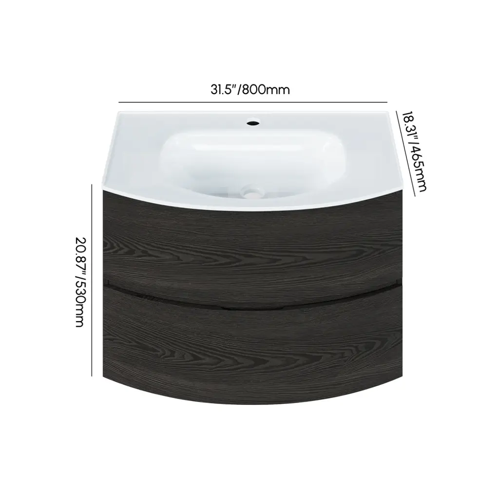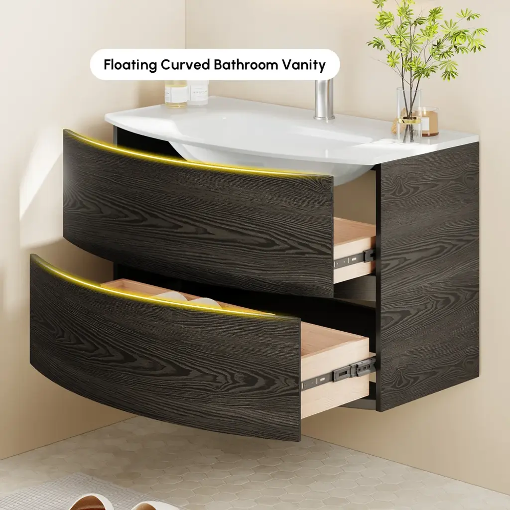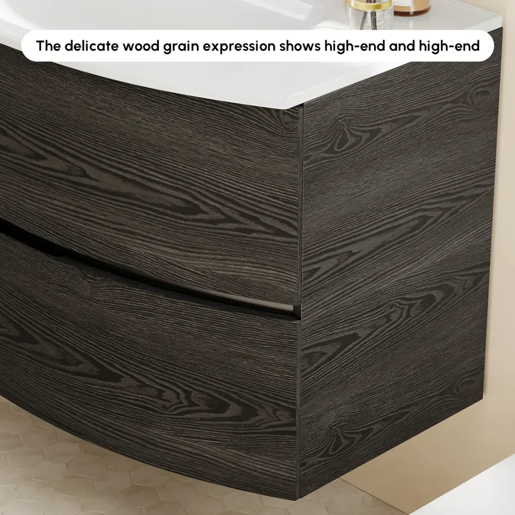 This modern bathroom vanity features smooth, soft curves, a practical double drawer design and a refined, premium wood finish. Equipped with an integrated glass basin, the seamless design is easy to clean and the material is durable. The wall-mounted design is both beautiful and practical, saving floor space and helping to create a neat and orderly indoor space.
