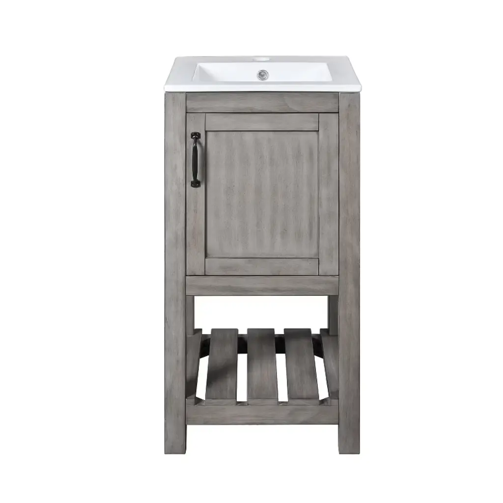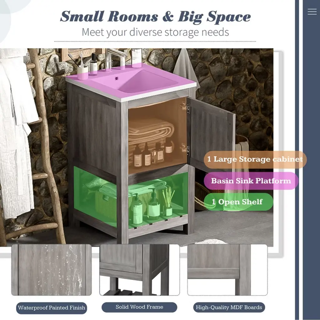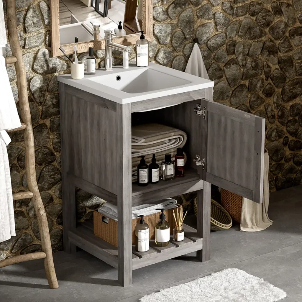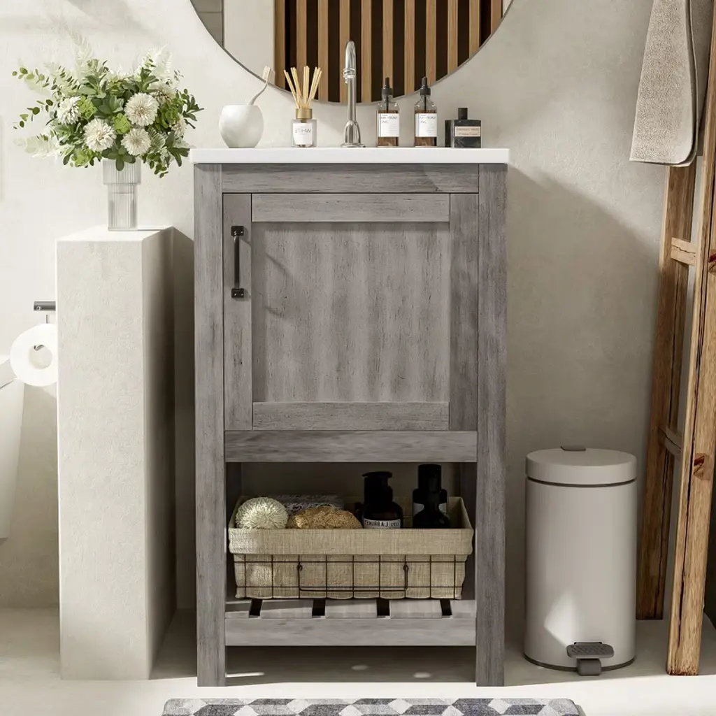 [Perfect for Small Spaces] This bathroom vanity is specially designed for small bathrooms. Its compact size saves space while still being practical. The simple style fits well with modern, Nordic, or rustic decor. The wood-grain finish adds a natural and stylish touch, making your bathroom feel warm and elegant. [High-Quality Material] The vanity features real wood veneer and a smooth painted finish, which is both stylish and water-resistant. It’s made with high-qualiy MDF boards for strength and durability, and comes with top-quality hardware for smooth operation. It’s designed to stay sturdy and look great for years. [Smart Storage] Despite its small size, this cabinet offers plenty of storage space. It has two levels- Closed cabinet: Perfect for storing toiletries and cleaning supplies, keeping them dust-free; open shelf: Great for towels and other items that need to stay dry and airy. The clever design helps you stay organized and makes the most of your space. [Ceramic Sink] The vanity comes with a glossy white ceramic sink that’s easy to clean and resistant to scratches and stains. It fits a standard 1.5-inch faucet (faucet not included) and includes an overflow hole to prevent water spills. It’s both functional and good-looking. [Easy to Assemble] The cabinet is designed for hassle-free installation. Each piece is labeled with numbers that match the step-by-step instructions. Even if you’re not a DIY expert, you can put it together quickly. All the necessary parts and tools are included, so you can start using it right away.