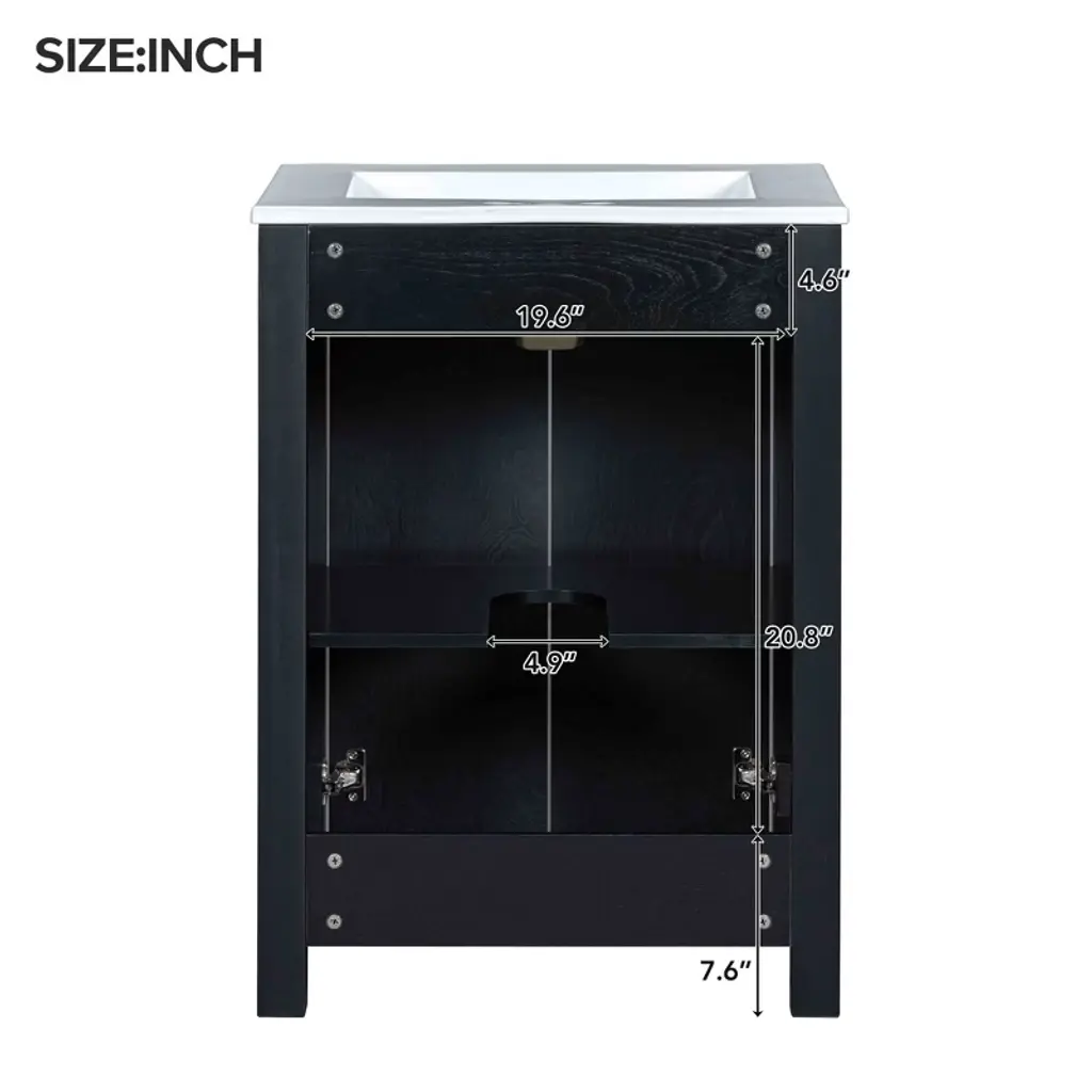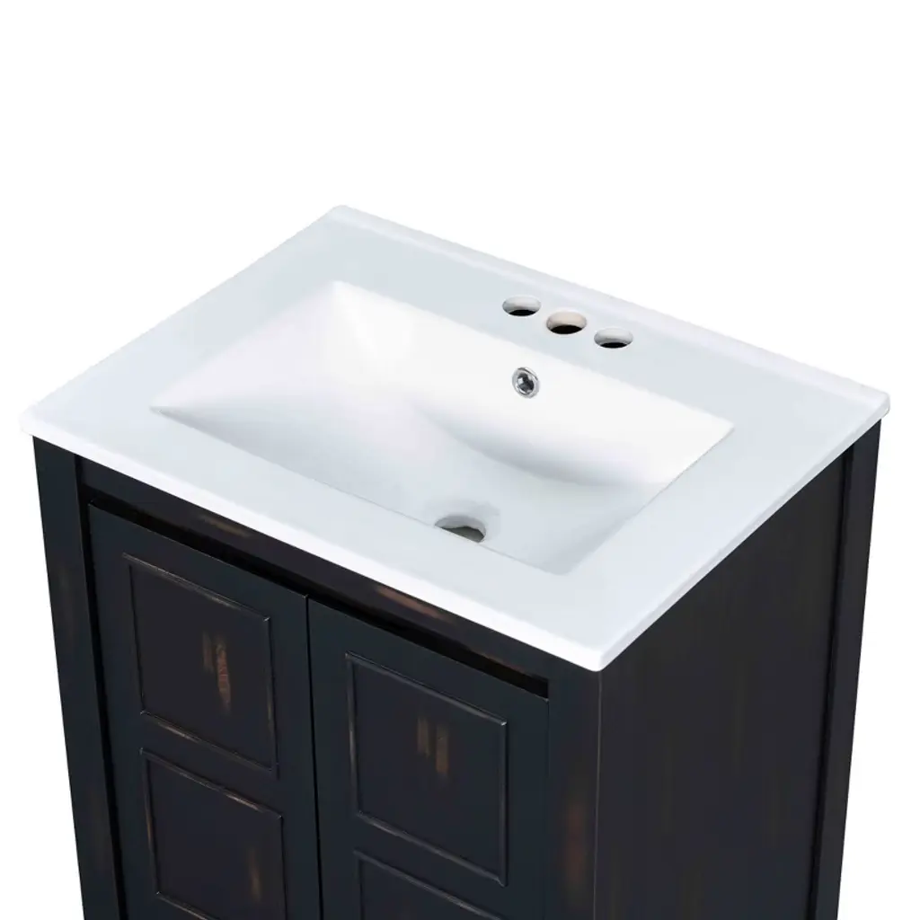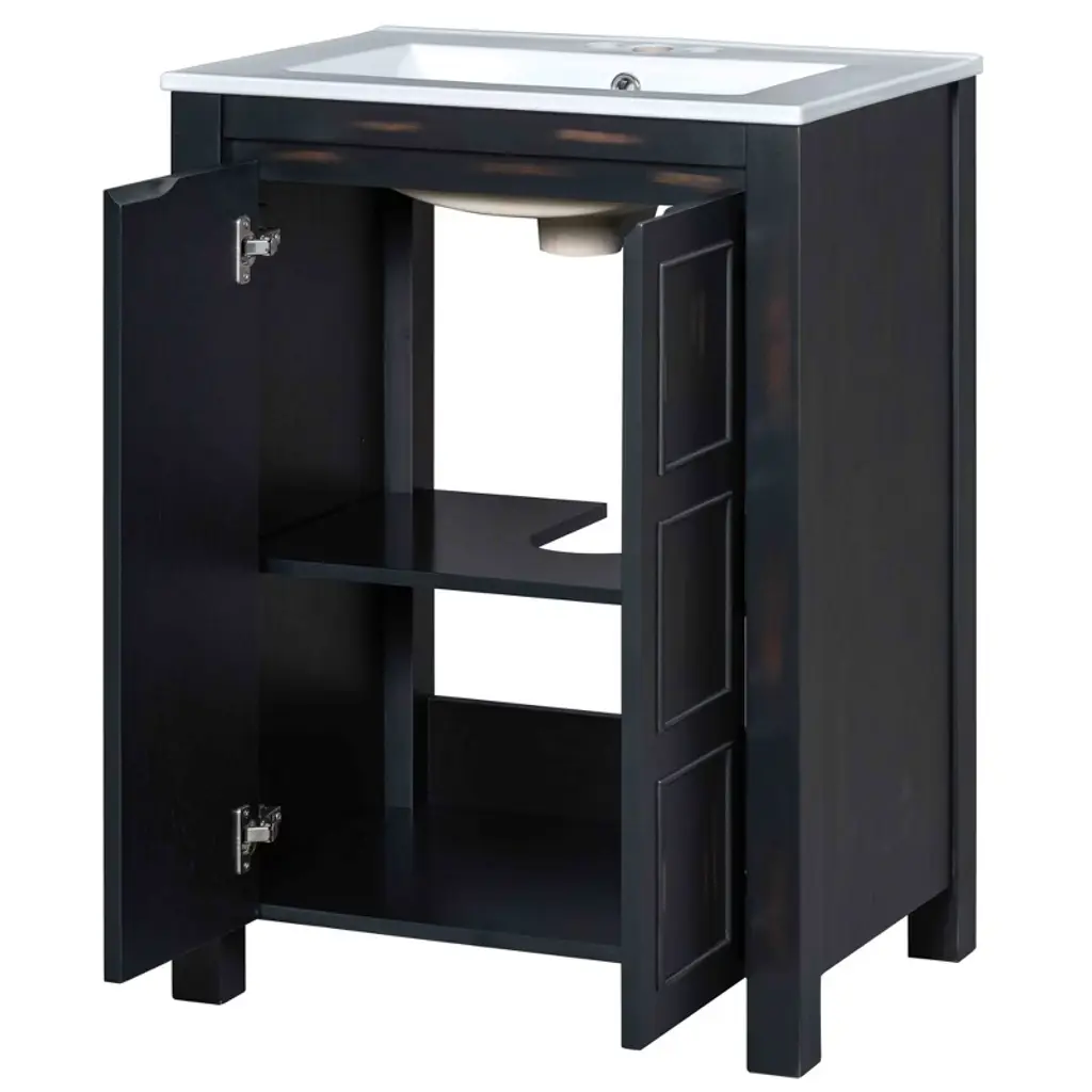 24-Inch Bathroom Vanity Cabinet with Ceramic Sink: Upgrade your small bathroom with our Vintage Style Small Bathroom Vanity Cabinet, designed to maximize space while adding a touch of vintage charm. Measuring 24x18.3x33.8 inches, this compact vanity cabinet is perfect for smaller bathroom layouts.Unique Design: Featuring wear-resistant paint craftsmanship, this vanity cabinet is not only sturdy but also easy to clean, ensuring hassle-free maintenance. The handcrafted antique finish with weathered texture adds character and charm, creating a vintage aesthetic in your bathroom.Ample Storage: With ample storage space and one adjustable U-shaped shelf, this vanity cabinet offers versatile storage options. Adjust the shelf height to accommodate items of varying heights, keeping your bathroom essentials organized and easily accessible.Soft Close: Enjoy a peaceful washing experience with the soft-close cabinet doors, which prevent noise disturbance in your bathroom. Enhance the style and functionality of your small bathroom with our Vintage Style Small Bathroom Vanity Cabinet today.