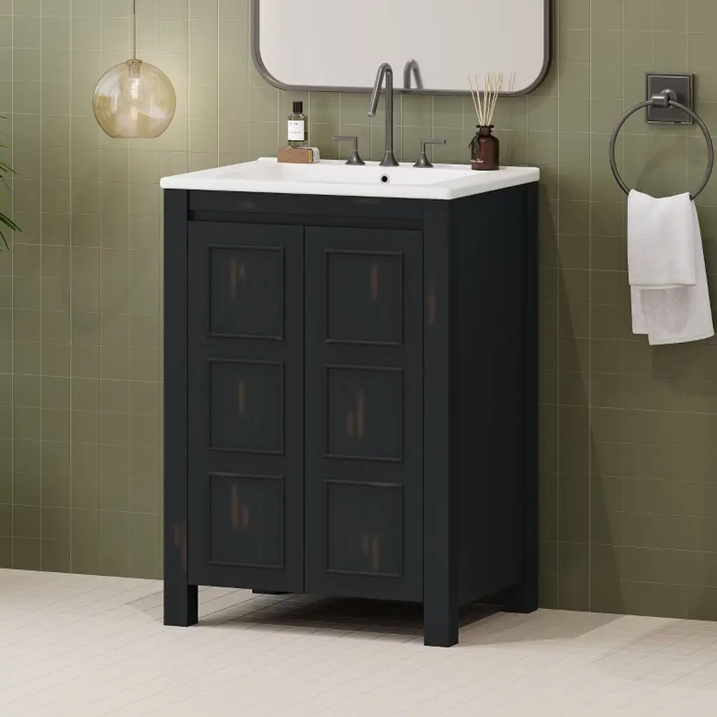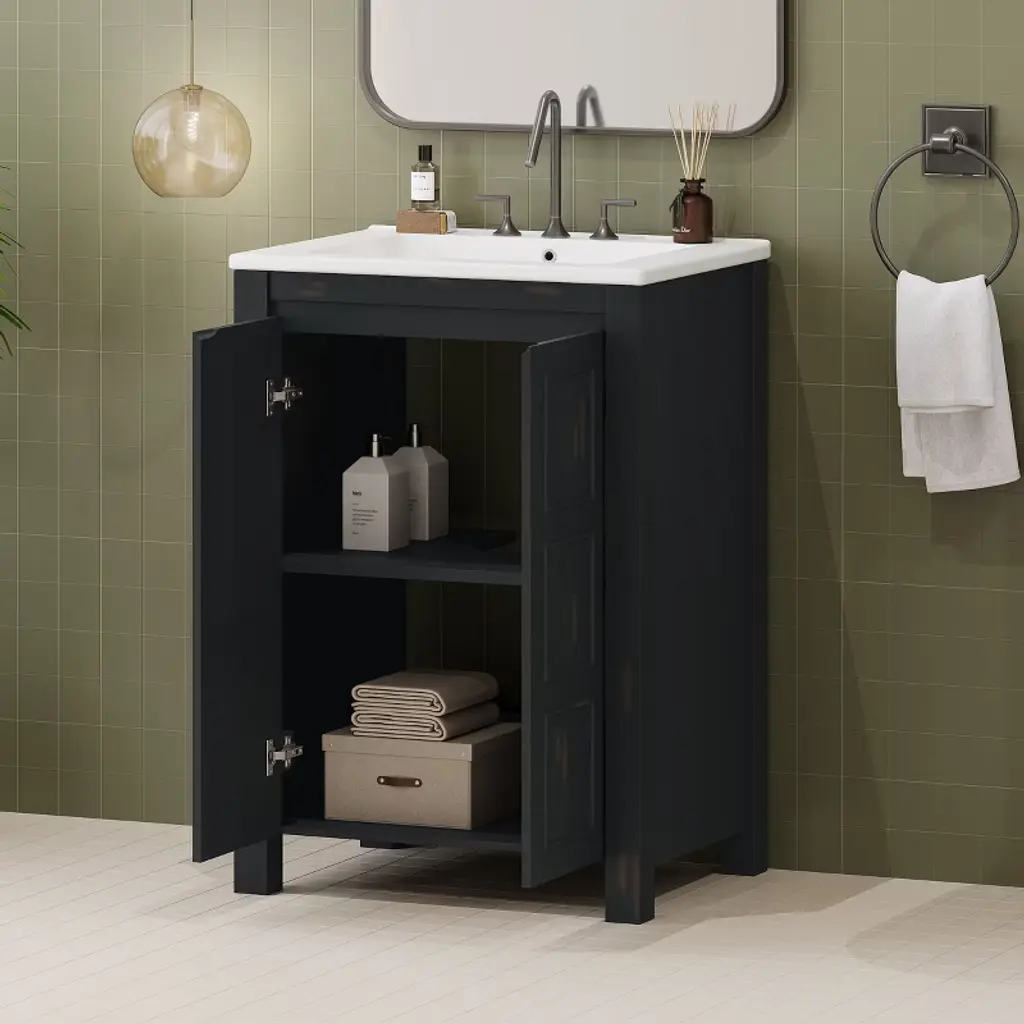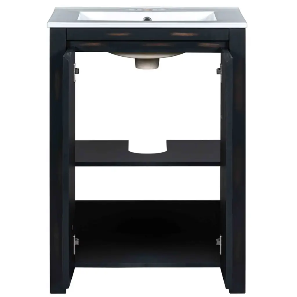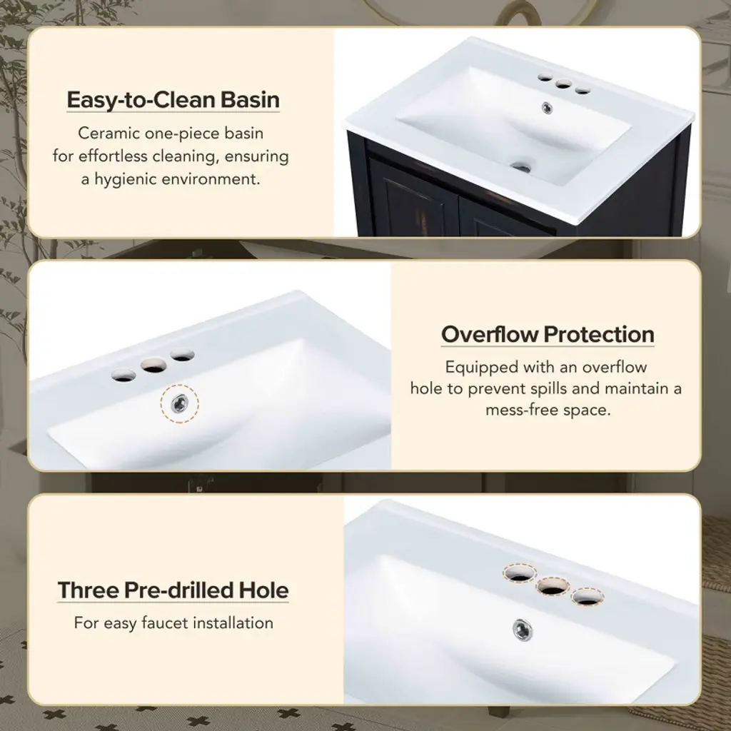 24-Inch Bathroom Vanity Cabinet with Ceramic Sink: Upgrade your small bathroom with our Vintage Style Small Bathroom Vanity Cabinet, designed to maximize space while adding a touch of vintage charm. Measuring 24x18.3x33.8 inches, this compact vanity cabinet is perfect for smaller bathroom layouts.Unique Design: Featuring wear-resistant paint craftsmanship, this vanity cabinet is not only sturdy but also easy to clean, ensuring hassle-free maintenance. The handcrafted antique finish with weathered texture adds character and charm, creating a vintage aesthetic in your bathroom.Ample Storage: With ample storage space and one adjustable U-shaped shelf, this vanity cabinet offers versatile storage options. Adjust the shelf height to accommodate items of varying heights, keeping your bathroom essentials organized and easily accessible.Soft Close: Enjoy a peaceful washing experience with the soft-close cabinet doors, which prevent noise disturbance in your bathroom. Enhance the style and functionality of your small bathroom with our Vintage Style Small Bathroom Vanity Cabinet today.