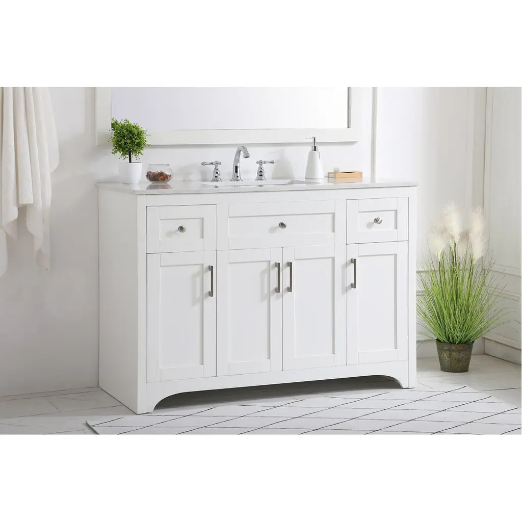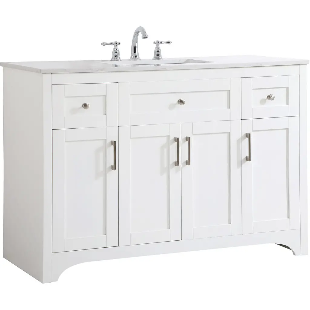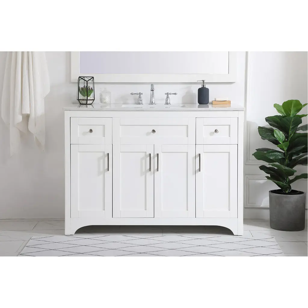 The refined simplicity of this 48" white finish vanity creates a peaceful, yet stylish, atmosphere. Its traditional modernity adds a mature beauty that will elevate any bathroom or powder room--the Calacatta quartz counter top adds refined luxe while the brushed nickel handle bars open the 4 cabinet doors and 2 upper drawers, revealing ample storage space to store and hide away an assortment of bathroom essentials. Whether your home is large or small, this vanity will surely fit in well.