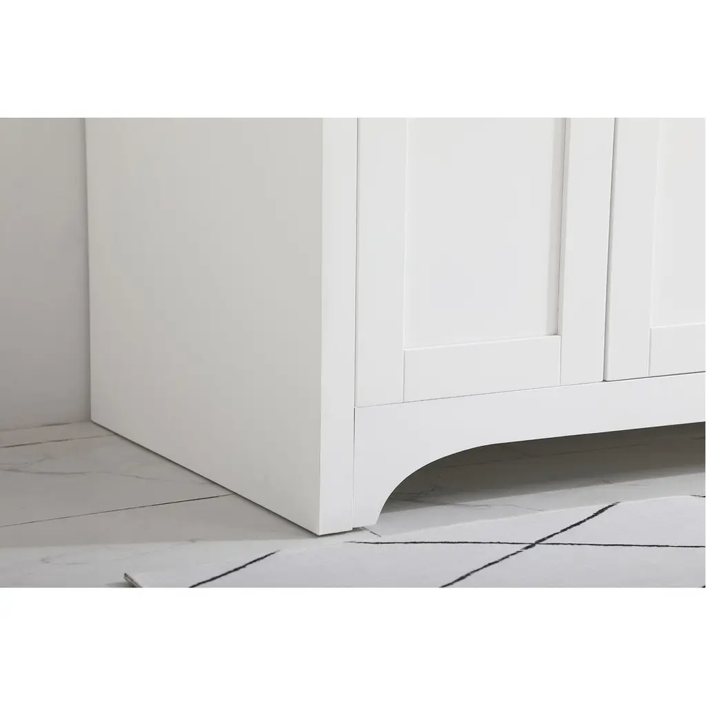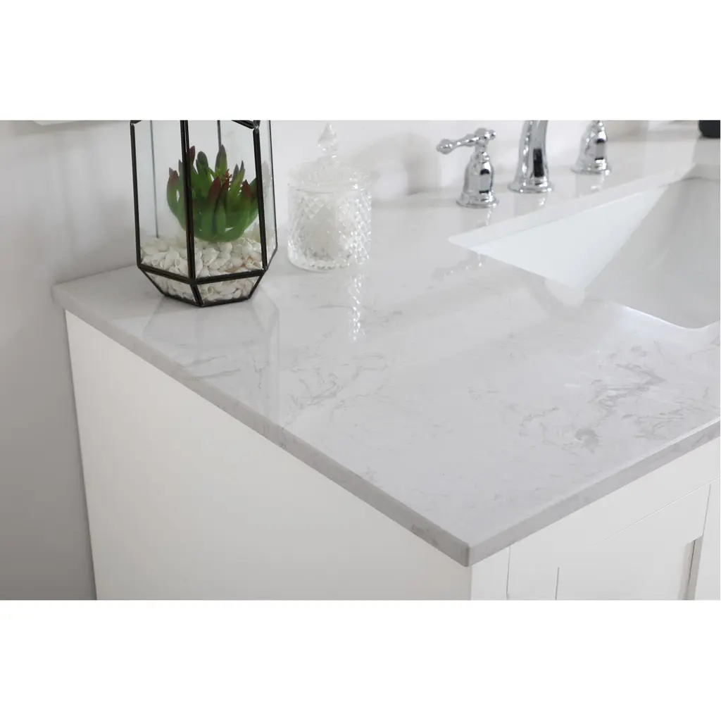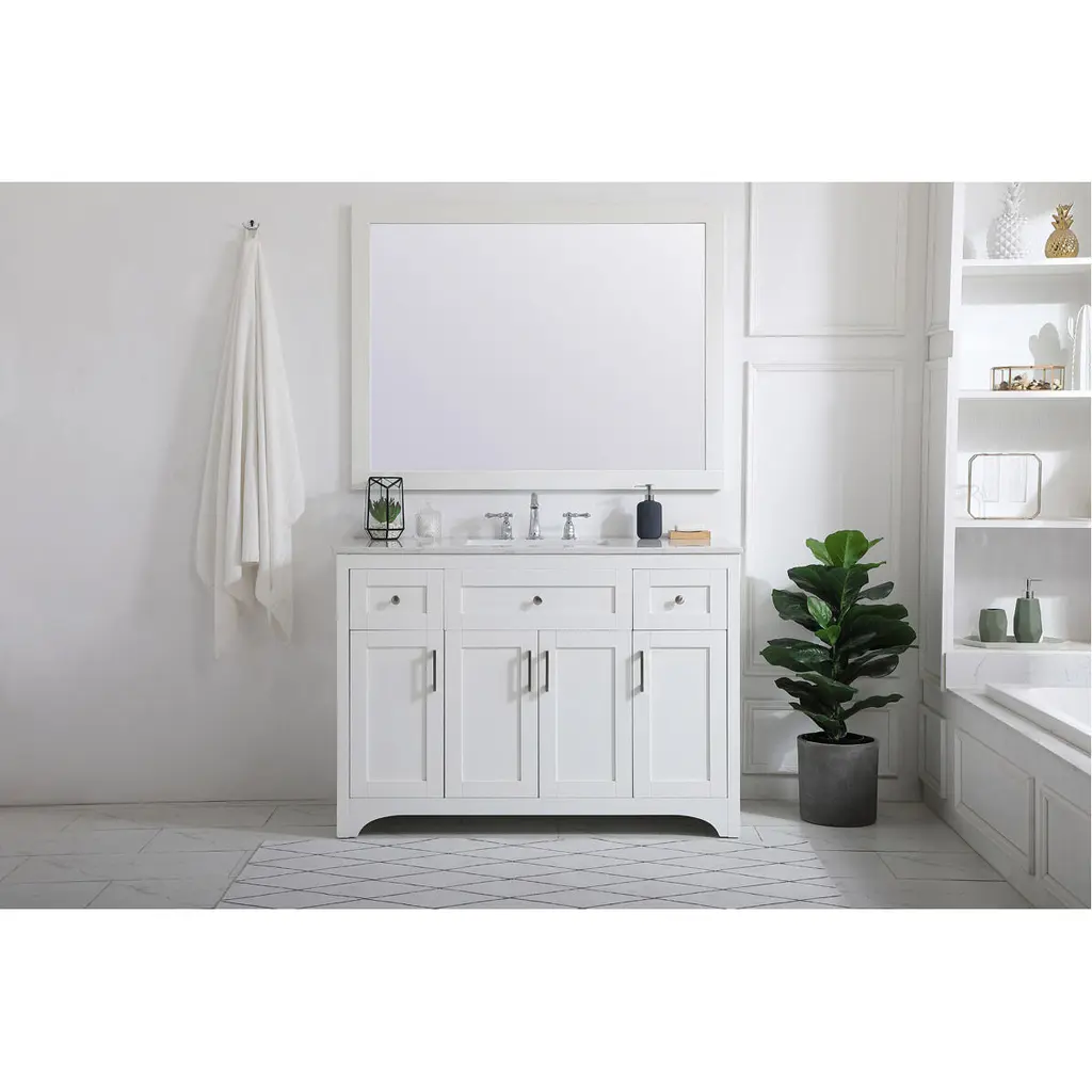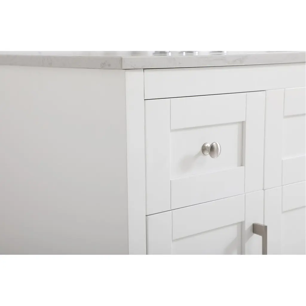 The refined simplicity of this 48" white finish vanity creates a peaceful, yet stylish, atmosphere. Its traditional modernity adds a mature beauty that will elevate any bathroom or powder room--the Calacatta quartz counter top adds refined luxe while the brushed nickel handle bars open the 4 cabinet doors and 2 upper drawers, revealing ample storage space to store and hide away an assortment of bathroom essentials. Whether your home is large or small, this vanity will surely fit in well.