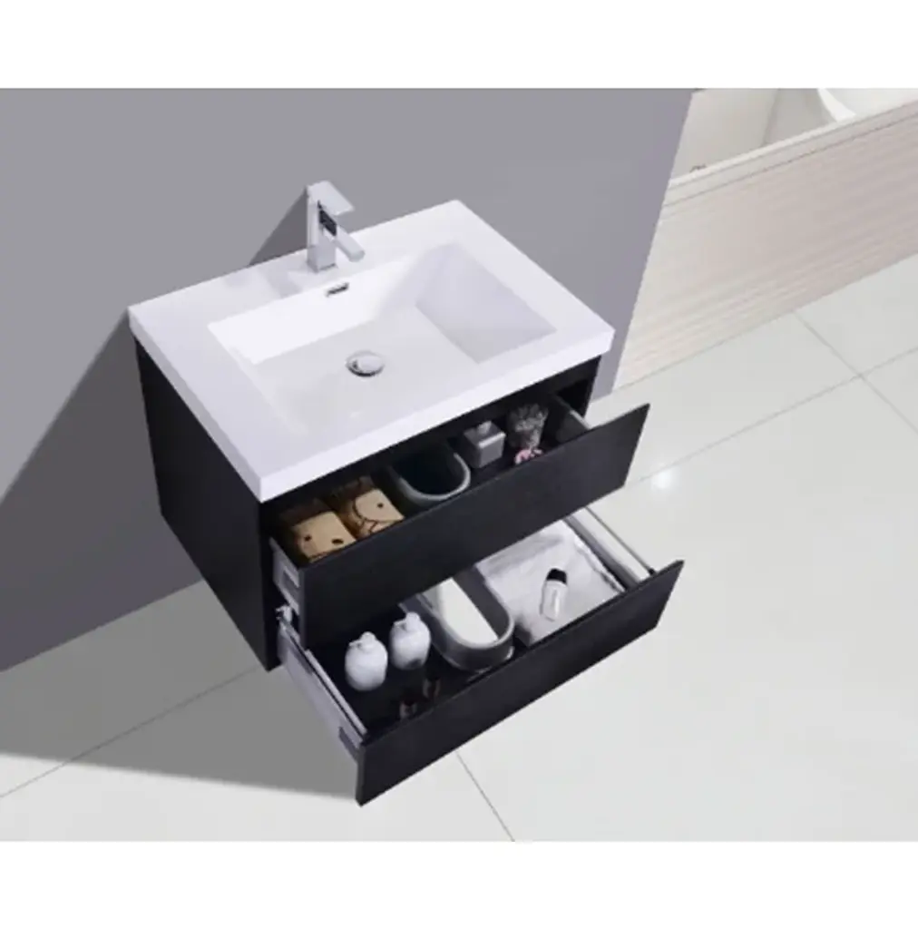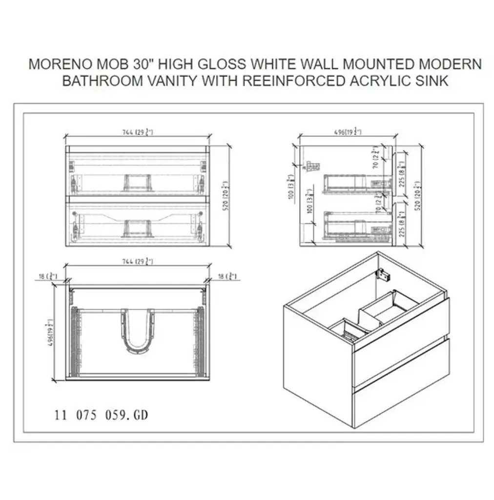 Instantly give your bathroom a modern edge with the Moreno Mob Single Sink Bathroom Vanity Set. The wall-mounted design hovers above your floor, making even the smallest of bathrooms appear much more spacious. Crafted from moisture and water resistant marine veneer and outfitted with a reinforced acrylic countertop and sink, this vanity leaves a lasting impression by combining traditional ideals with modern forms.Faucet and pop-up drain not includedIntegrated European soft-closing hardwareReinforced acrylic composite sink with rectangular chrome overflowCountertop pre-drilled for single hole faucetInstallation hardware includedNumber of sinks included: 1Number of doors: 0Number of drawers: 2Sink installation type: 2Cabinet comes fully assembled1 year manufacturer warrantyMaterials: MDF and acrylic compositeDimensions: W 29.5" x D 19.75" x H 23.5"