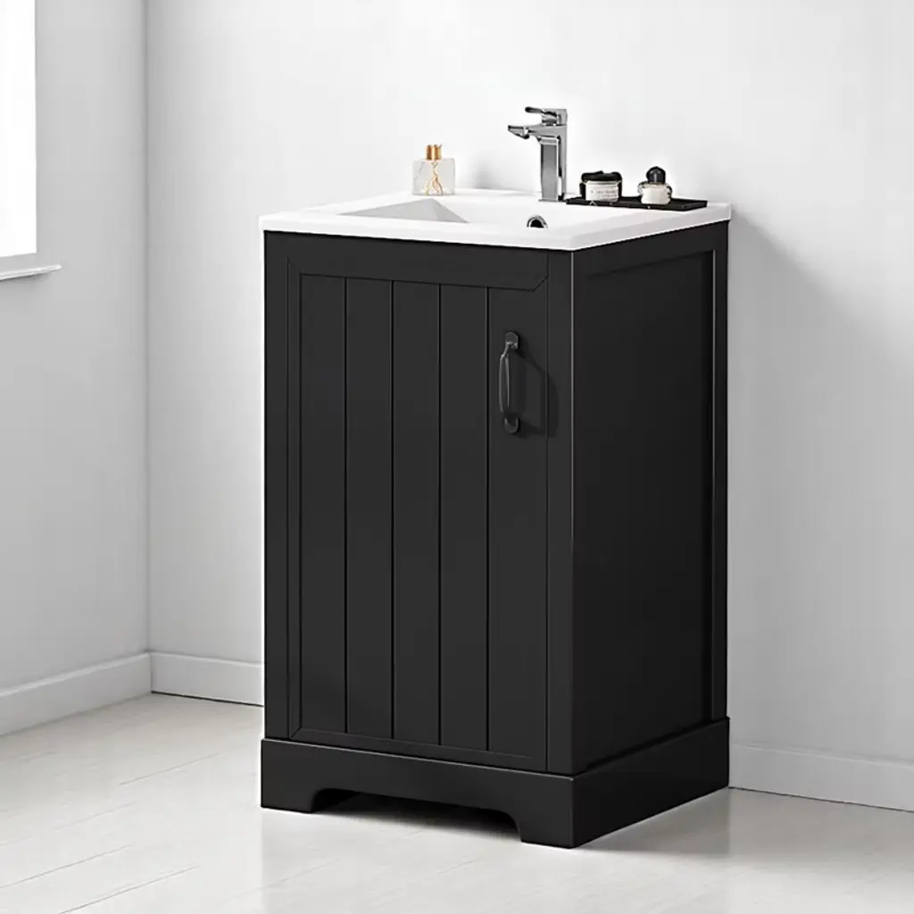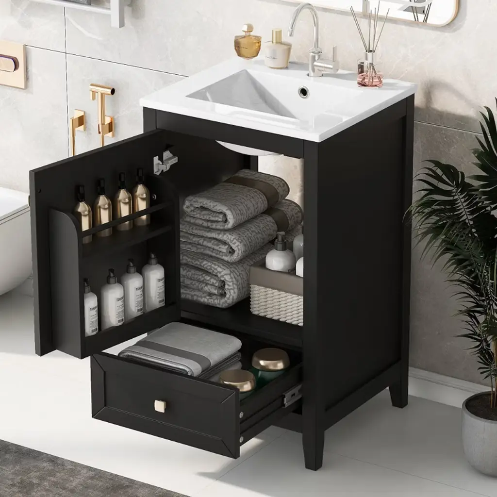 Product Introduction The Mshliw 20" Bathroom Vanity is designed to offer both style and functionality. Featuring a modern ceramic sink, soft-closing cabinet door, and additional storage options, this vanity is perfect for any bathroom. The freestanding design ensures versatility while the durable materials provide long-lasting use. Organize your bathroom essentials with ease using this space-saving vanity. Product Features High-Quality Materials: Constructed with MDF boards and real wood, this vanity offers a solid, durable foundation. The painted finish is water-resistant, stain-resistant, and easy to maintain. Ceramic Sink: The ceramic sink comes with an integrated overflow and a single hole for faucet installation. Its smooth surface is easy to clean and maintain, ensuring a shiny, sleek look. Ample Storage Space: This vanity includes a cabinet with a soft-closing door, a two-tier storage rack on the door, and a large drawer, offering plenty of room to store bathroom essentials like soaps, towels, and toiletries. Modern Details: The soft-closing door and stainless steel hinges and handles ensure quiet operation. The platinum knobs add a stylish, modern touch to the design. Assembly Required: Assembly is required, but all necessary hardware and instructions are included in the package to make the process easier. Specifications Overall Dimensions: 20"L x 18.3"W x 34"H Cabinet Base Dimensions: 19"L x 17.1"W x 33.41"H Sink Top Dimensions: 20"L x 18.3"W x 4.72"H Material: MDF Board + Ceramic Sink Type: Undermount; Drop-In Number of Sinks: 1 Number of Doors: 1 Number of Drawers: 1 Faucet Mount: Single Hole (faucet not included) Capacity: 100 lbs Assembly: Required Vanity Top Edge Type: Flat Edge Thickness: 0.59" Sink Location: Center Top Depth: 6.69" Note Please ensure that the faucet is compatible with a single-hole mount (faucet not included). Assembly instructions and hardware are included for your convenience.