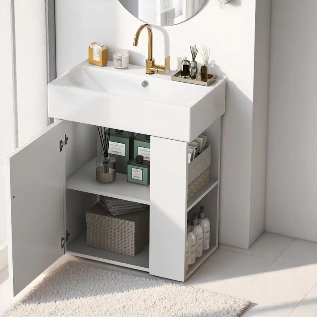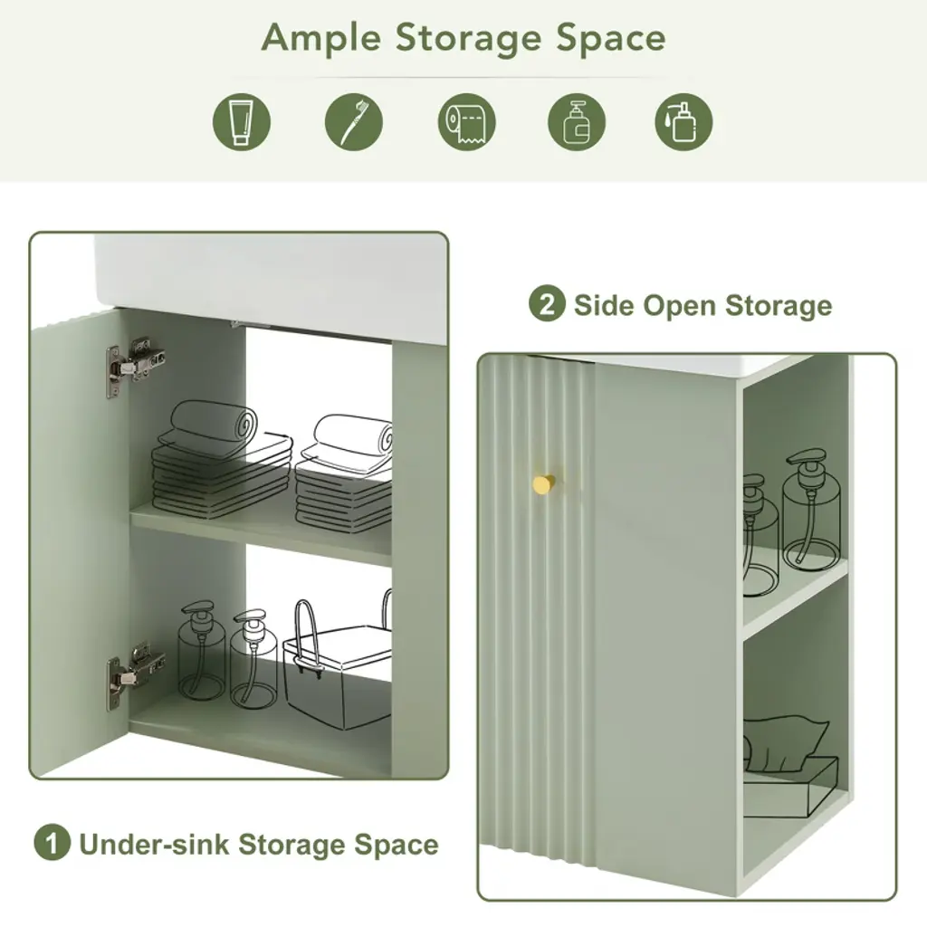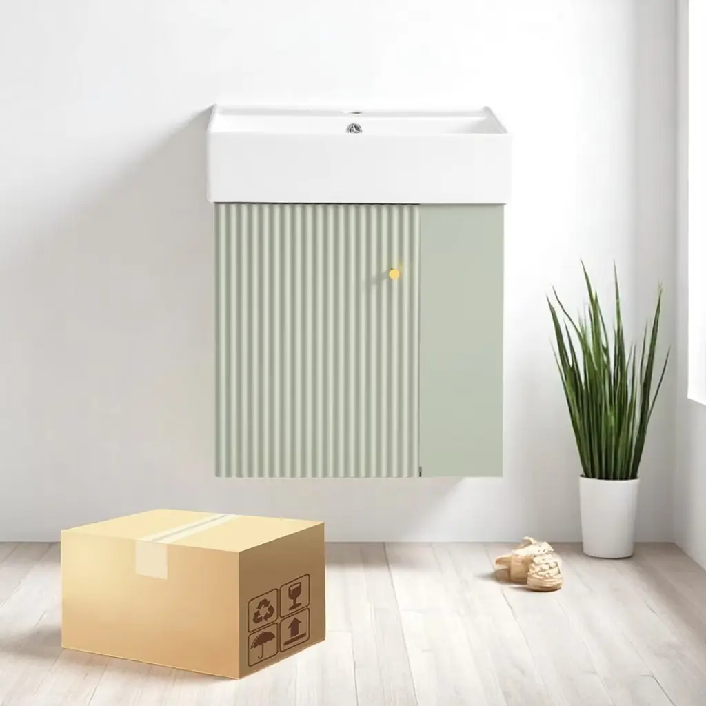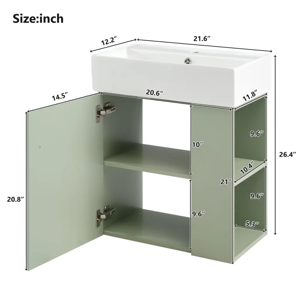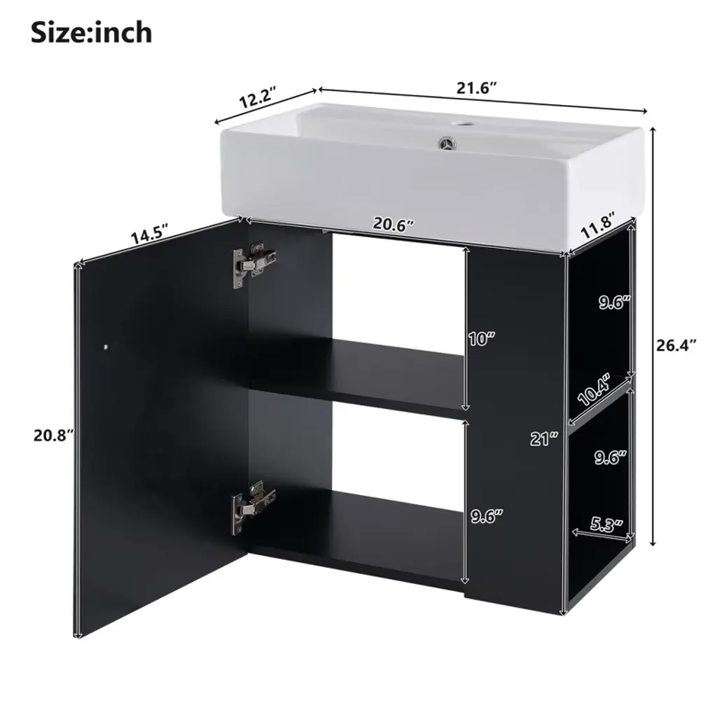 Product Introduction This 21.6-inch modern floating bathroom vanity offers a sleek design ideal for compact spaces. With its wave-patterned door, premium ceramic basin, and side storage, this vanity blends contemporary aesthetics with practical functionality. Perfect for smaller bathrooms, the wall-mounted design maximizes floor space, while the soft-close door adds a touch of luxury. Product Features Space-Saving Floating Design – Measuring 21.6"W x 12.2"D x 26.4"H, this vanity is perfect for small bathrooms, leaving more floor space and a streamlined look. Premium Ceramic Basin – The durable, easy-to-clean ceramic basin offers a smooth surface that resists stains and ensures long-lasting performance. Overflow Protection – The integrated overflow hole helps prevent spills, keeping your bathroom dry and safe. Single Hole Pre-Drilled – This vanity is pre-drilled with a single hole for easy faucet installation (faucet not included), offering flexibility in choosing your preferred faucet style. Modern Design with Stylish Accents – Features a wave-patterned door with a chic rose gold aluminum alloy handle, giving it a sophisticated and contemporary appearance. Soft-Close Door – The soft-close door ensures a quiet and smooth operation, adding convenience and luxury to your daily routine. Side Storage – A convenient side storage space for bathroom essentials like toilet paper, offering additional organization in tight spaces. Easy Assembly – The vanity comes with clear instructions for quick and easy assembly, requiring only two people for setup. Specifications Overall Dimensions: 21.6"W x 12.2"D x 26.4"H Sink Dimensions: 21.6"W x 12.2"D x 5.1"H Vanity Cabinet Dimensions: 20.6"W x 11.8"D x 21"H Weight: Total 48.39 lbs (Sink: 24.91 lbs, Cabinet: 23.48 lbs) Weight Capacity: Shelf: 11.2 lbs; Overall: 44.09 lbs Style: Modern Mounting Type: Wall-mounted Sink Material: Ceramic Cabinet Material: MDF Handle Material: Aluminum Alloy Finish Type: Painted Finish Sink Type: Undermount / Drop-in Sink Shape: Rectangular Faucet Mount Type: Single Hole (Faucet Not Included) Overflow Hole: Yes Vanity Top Edge Type: Flat, Edge Thickness: 0.6" Number of Doors: 1 Number of Drawers: 0 Soft-Close Hinges: Yes Assembly: Required Note This product is shipped in one package. Faucet and drain are not included. Assembly is required and is recommended for two people. Please refer to the included instruction manual for detailed assembly steps.